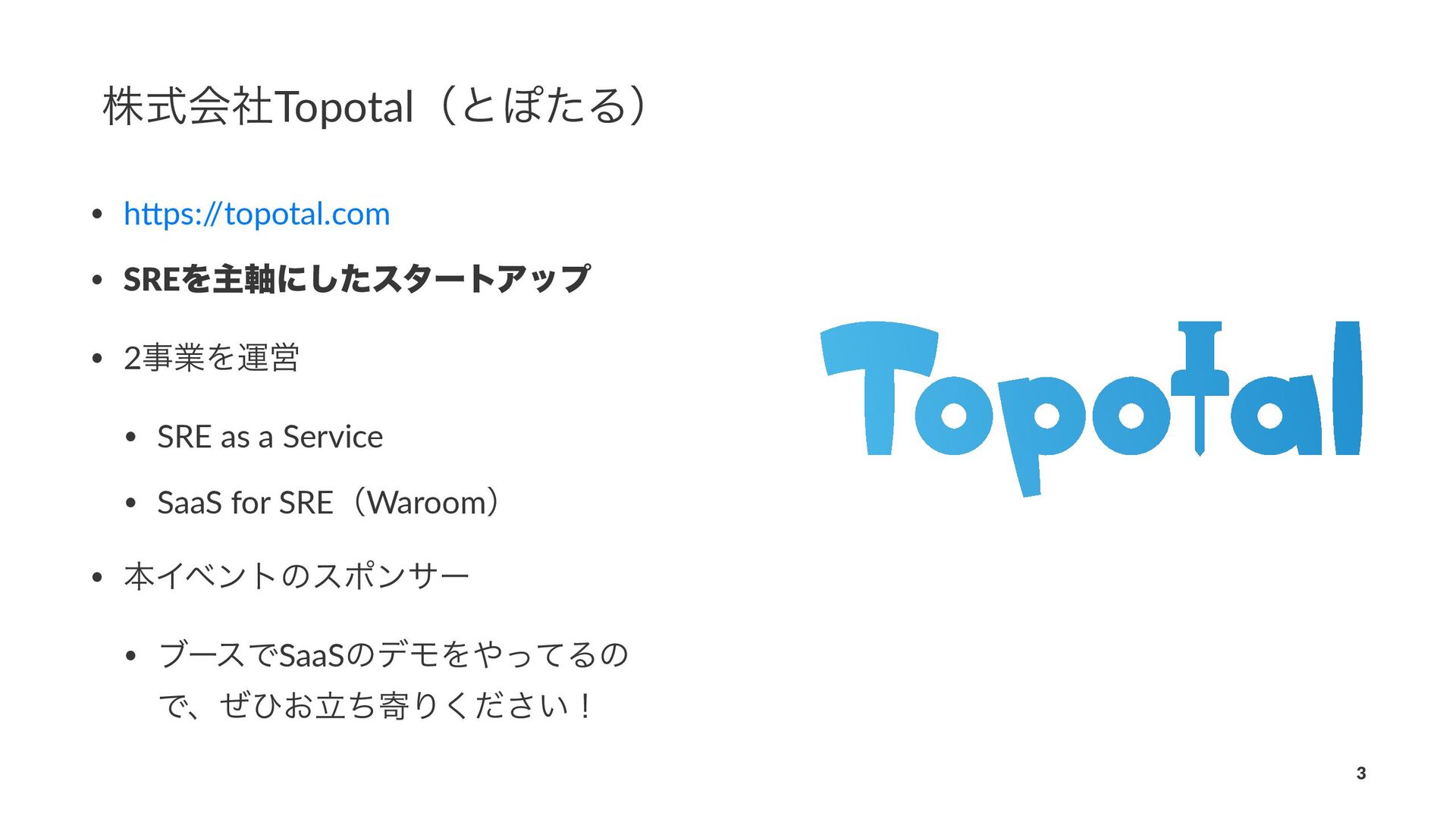גࣜձࣾTopotalʢͱΆͨΔʣ • h#ps:/ /topotal.com • SREΛओ࣠ʹͨ͠ελʔτΞοϓ • 2ࣄۀΛӡӦ • SRE