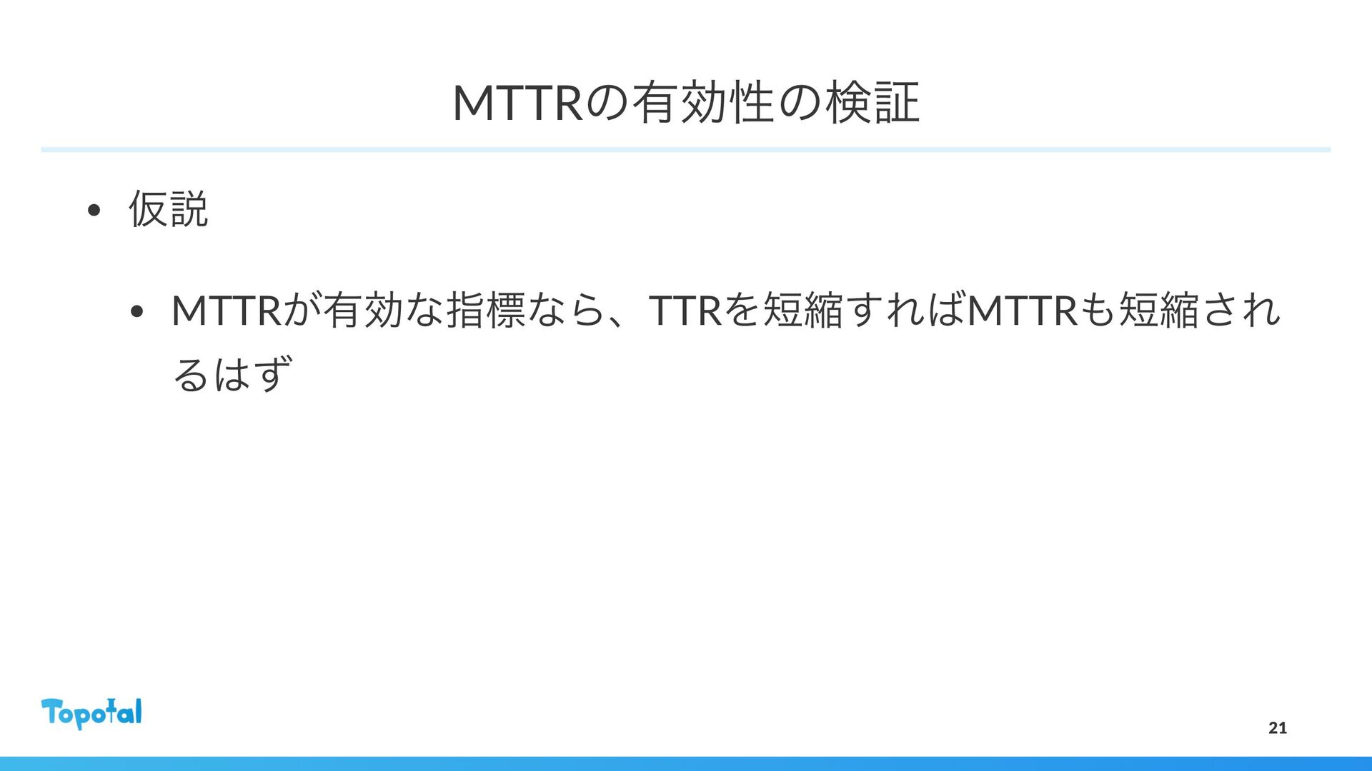 MTTRͷ༗ޮੑͷݕূ • Ծઆ • MTTR͕༗ޮͳࢦඪͳΒɺTTRΛॖ͢ΕMTTRॖ͞Ε Δͣ 21