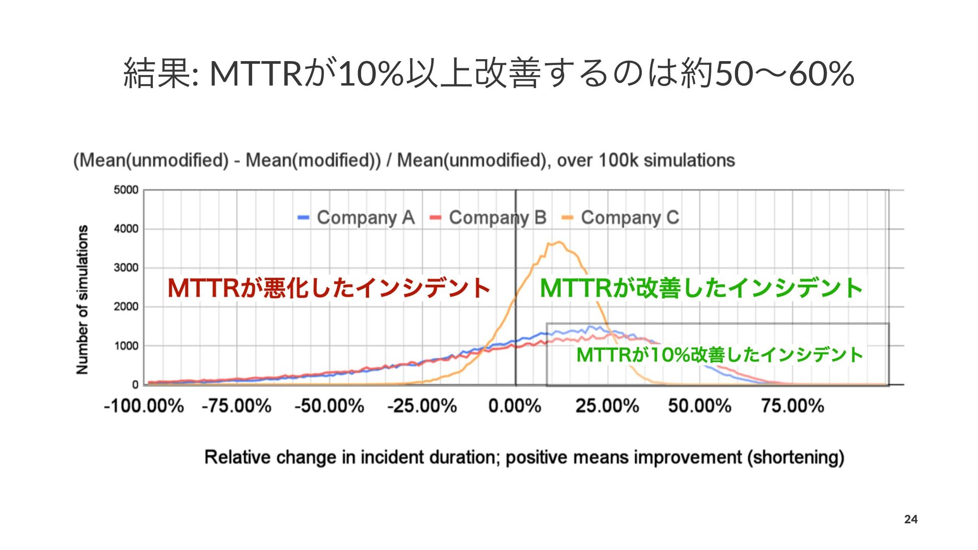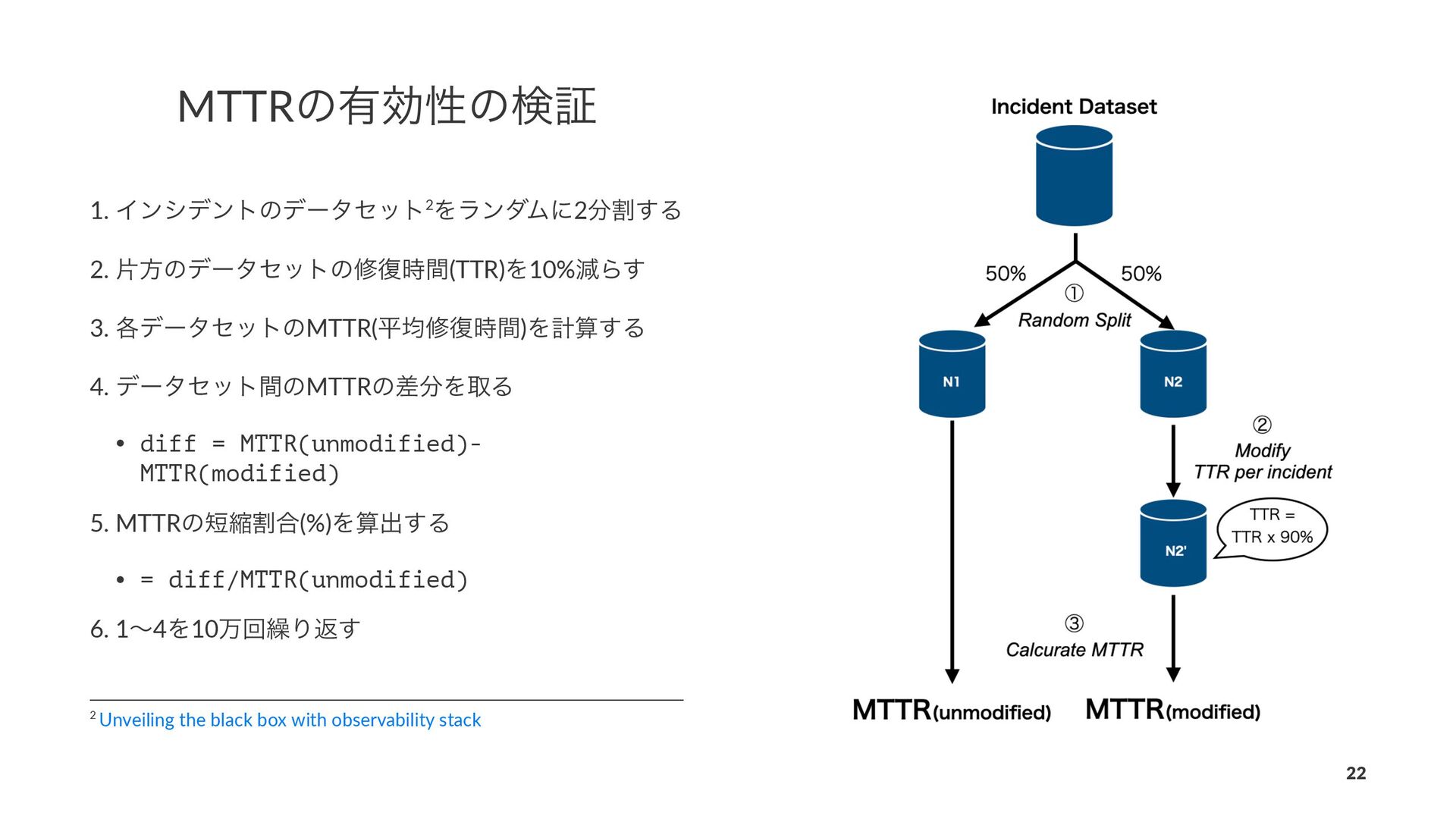 MTTRͷ༗ޮੑͷݕূ 1. Πϯγσϯτͷσʔληοτ2ΛϥϯμϜʹ2ׂ͢Δ 2. ยํͷσʔληοτͷम෮࣌ؒ(TTR)Λ10%ݮΒ͢ 3. ֤σʔληοτͷMTTR(ฏۉम෮࣌ؒ)Λܭࢉ͢Δ 4. σʔληοτؒͷMTTRͷࠩΛऔΔ •