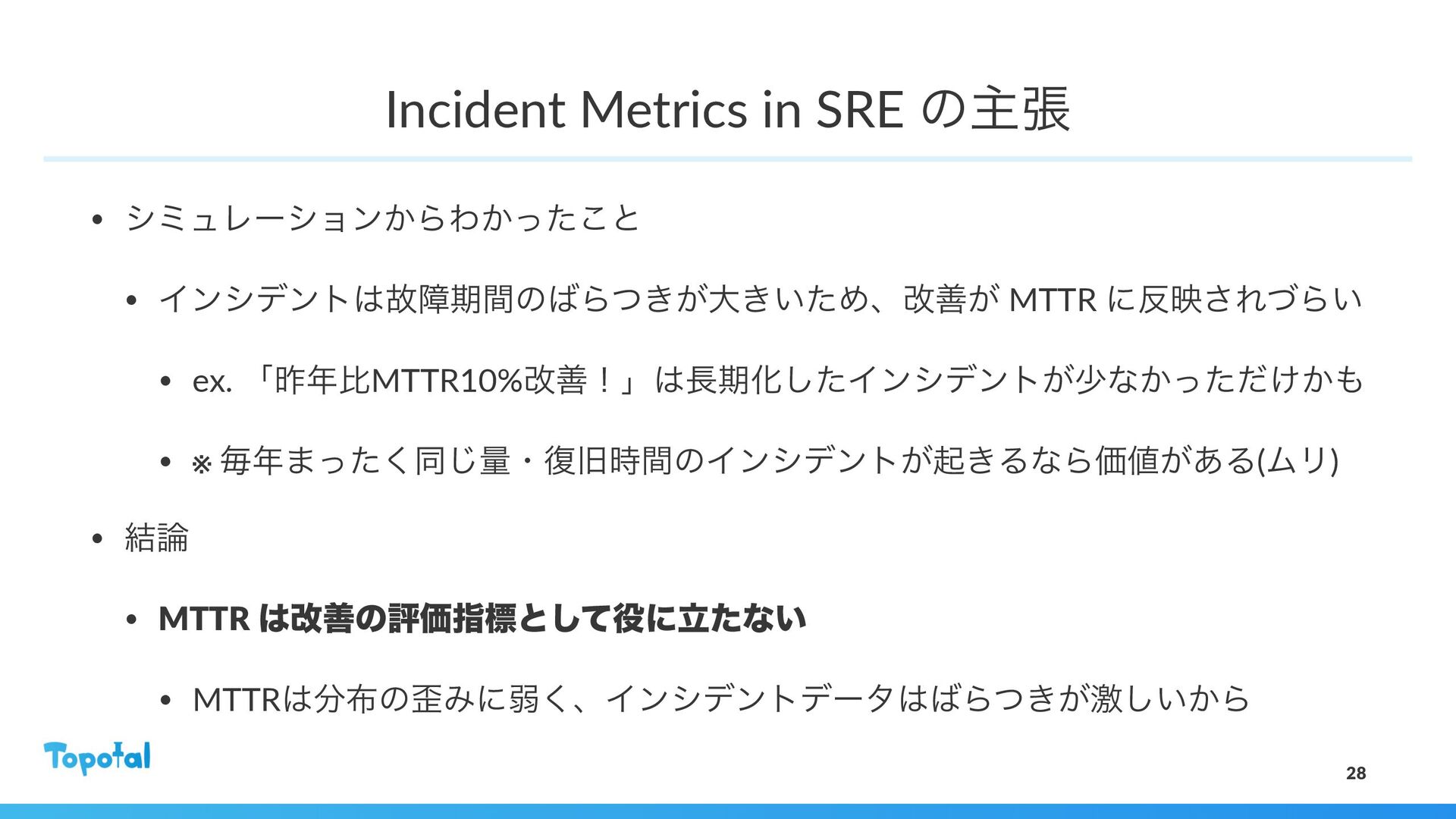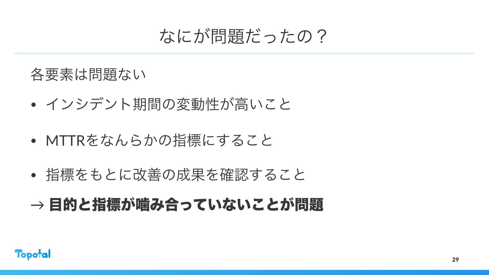 ʹө͞ΕͮΒ͍ • ex. ʮࡢൺMTTR10%վળʂʯظԽͨ͠Πϯγσϯτ͕গͳ͔͚͔ͬͨͩ • ※ ຖ·ͬͨ͘ಉ͡ྔɾ෮چ࣌ؒͷΠϯγσϯτ͕ى͖ΔͳΒՁ͕͋Δ(ϜϦ) • ݁ • MTTR վળͷධՁࢦඪͱͯ͠ʹཱͨͳ͍ • MTTRͷΈʹऑ͘ɺΠϯγσϯτσʔλΒ͖͕ܹ͍͔ͭ͠Β 28