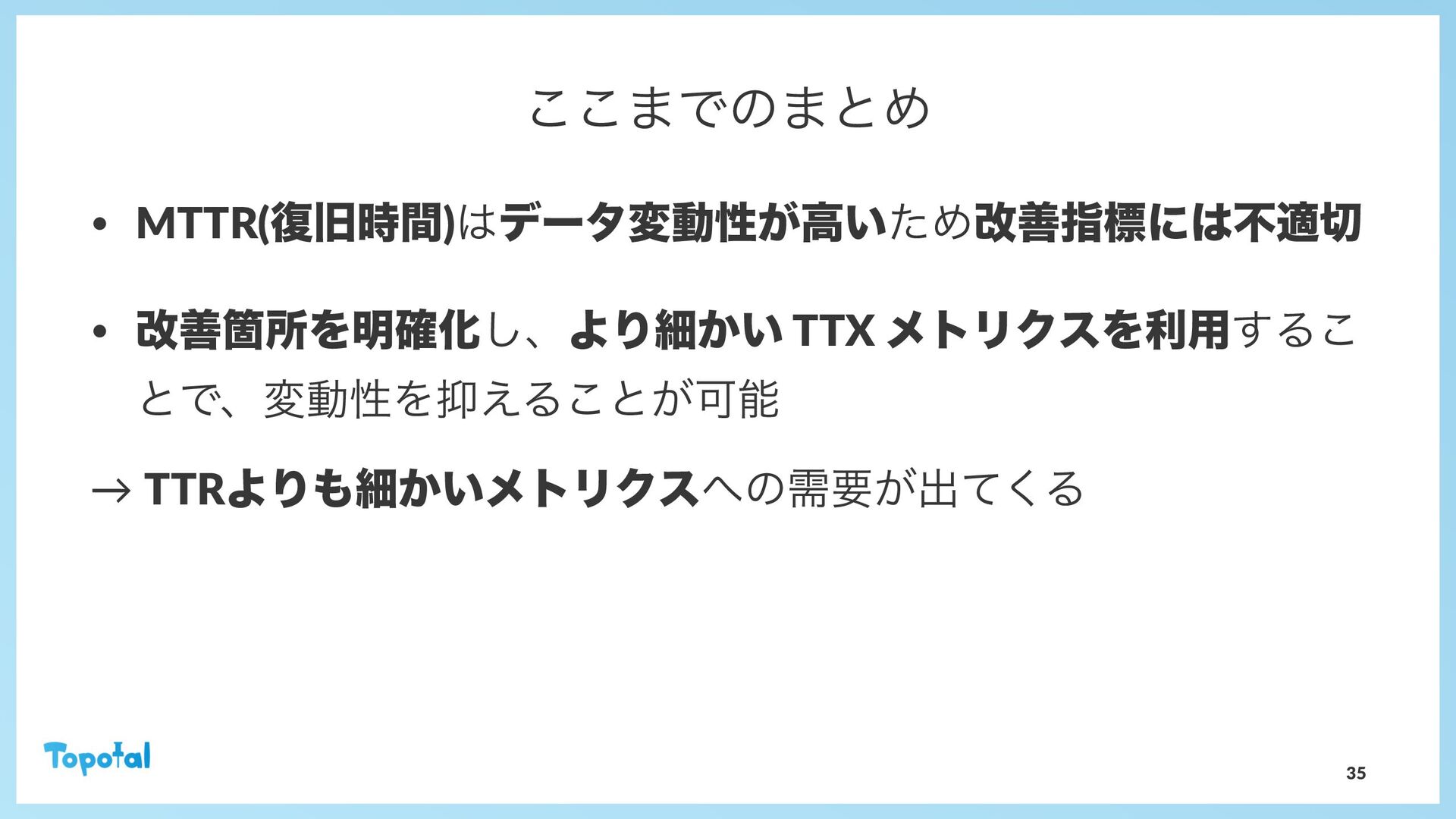 ͜͜·Ͱͷ·ͱΊ • MTTR(෮چ࣌ؒ)σʔλมಈੑ͕ߴ͍ͨΊվળࢦඪʹෆద • վળՕॴΛ໌֬Խ͠ɺΑΓࡉ͔͍ TTX ϝτϦΫεΛར༻͢Δ͜ ͱͰɺมಈੑΛ͑Δ͜ͱ͕Մೳ → TTRΑΓࡉ͔͍ϝτϦΫεͷधཁ͕ग़ͯ͘Δ