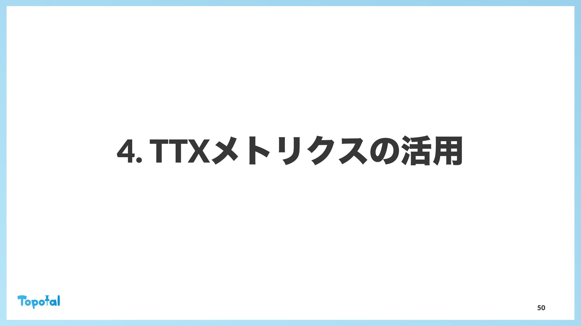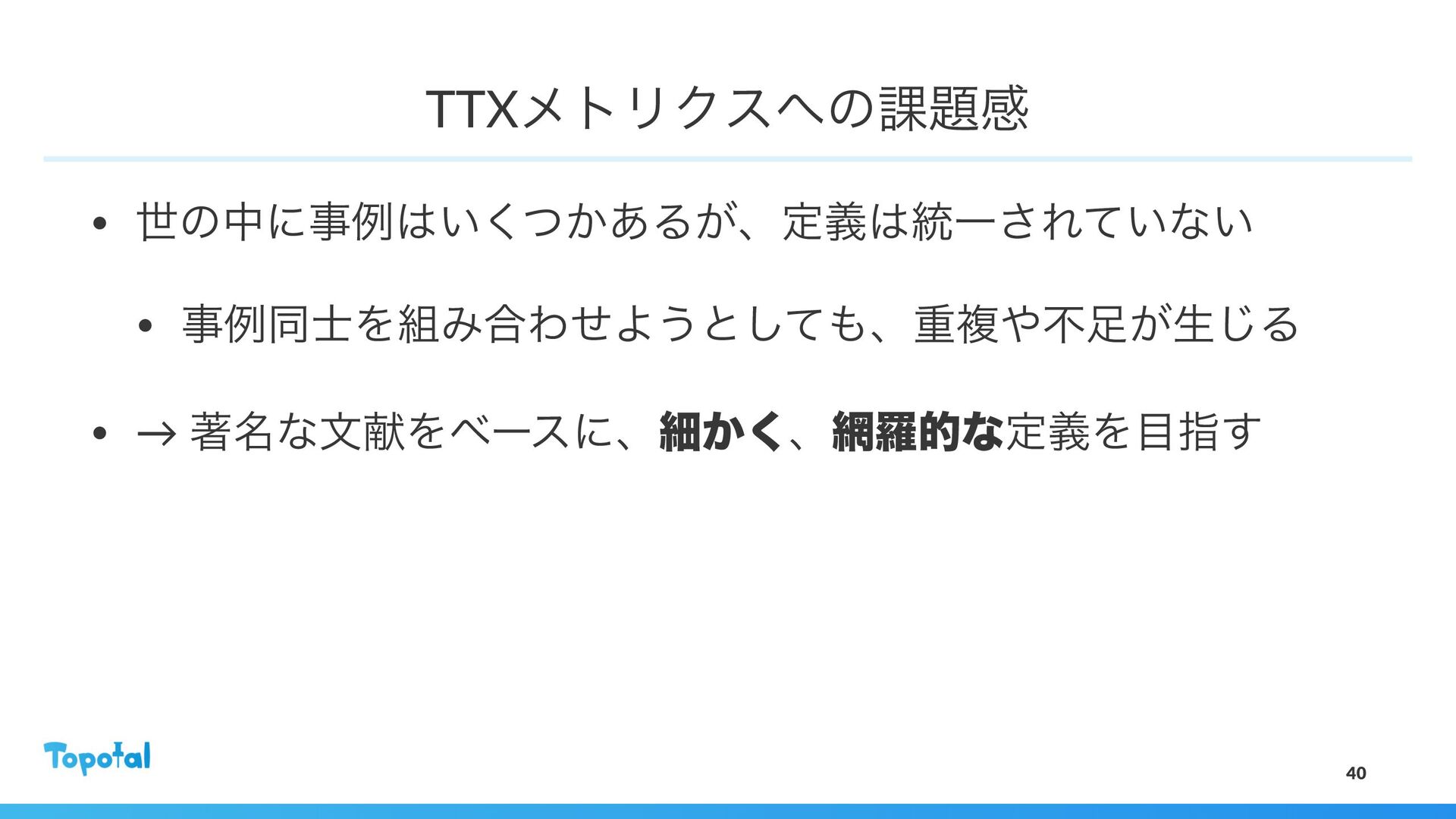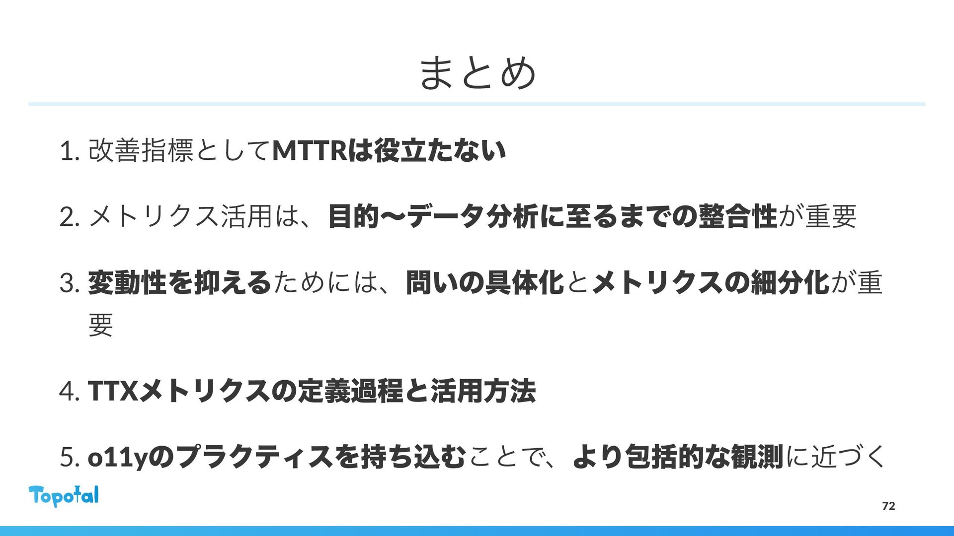 ·ͱΊ 1. վળࢦඪͱͯ͠MTTRཱͨͳ͍ 2. ϝτϦΫε׆༻ɺతʙσʔλੳʹࢸΔ·Ͱͷ߹ੑ͕ॏཁ 3. มಈੑΛ͑ΔͨΊʹɺ͍ͷ۩ମԽͱϝτϦΫεͷࡉԽ͕ॏ ཁ 4. TTXϝτϦΫεͷఆٛաఔͱ׆༻ํ๏