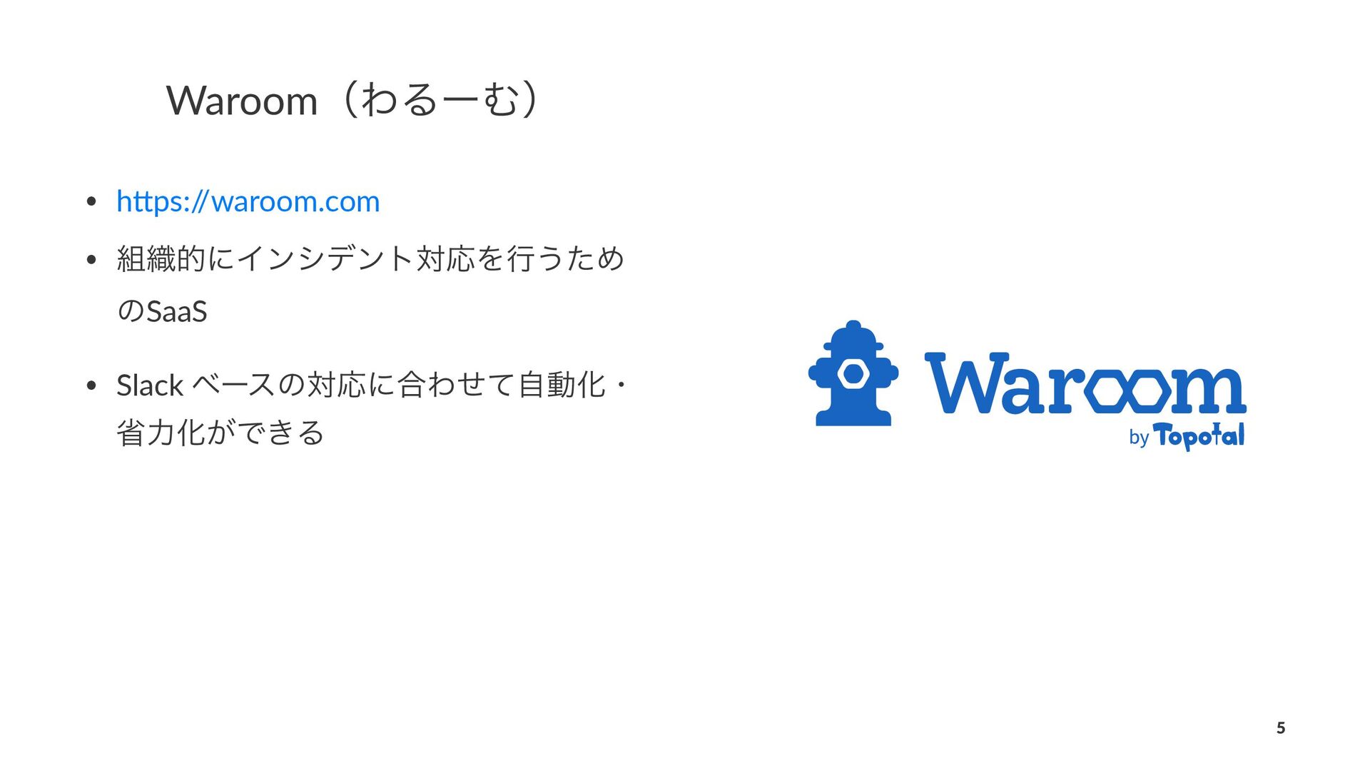 WaroomʢΘΔʔΉʣ • h#ps:/ /waroom.com • ৫తʹΠϯγσϯτରԠΛߦ͏ͨΊ ͷSaaS • Slack ϕʔεͷରԠʹ߹ΘͤͯࣗಈԽɾ
