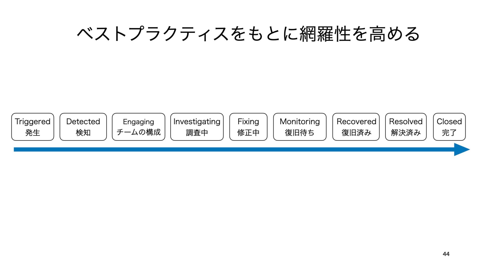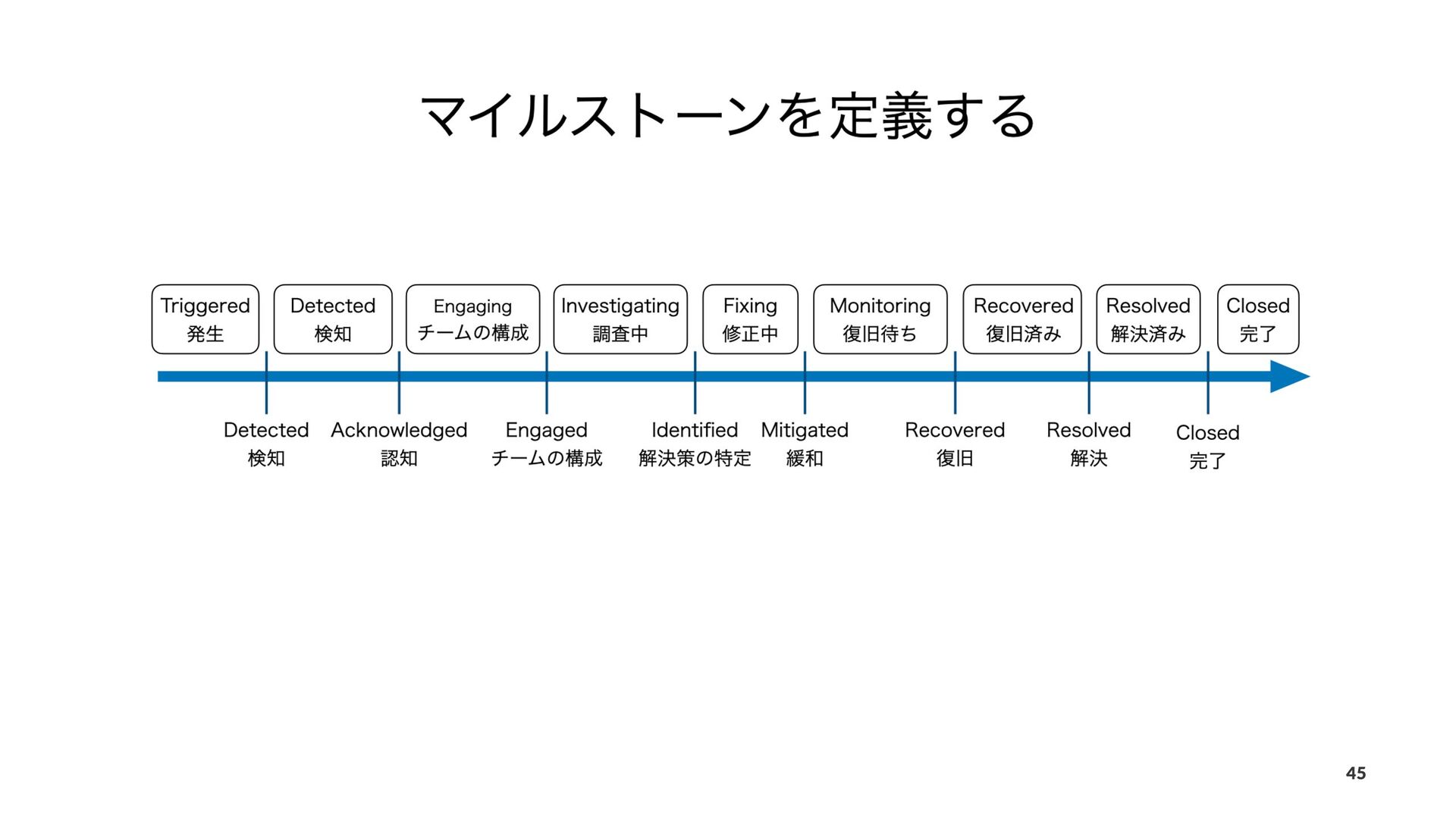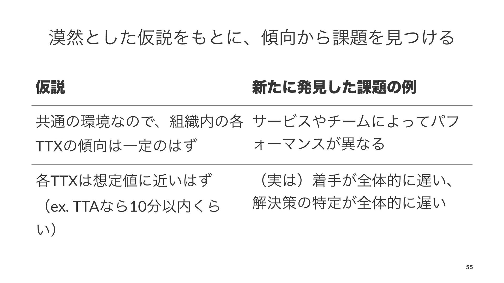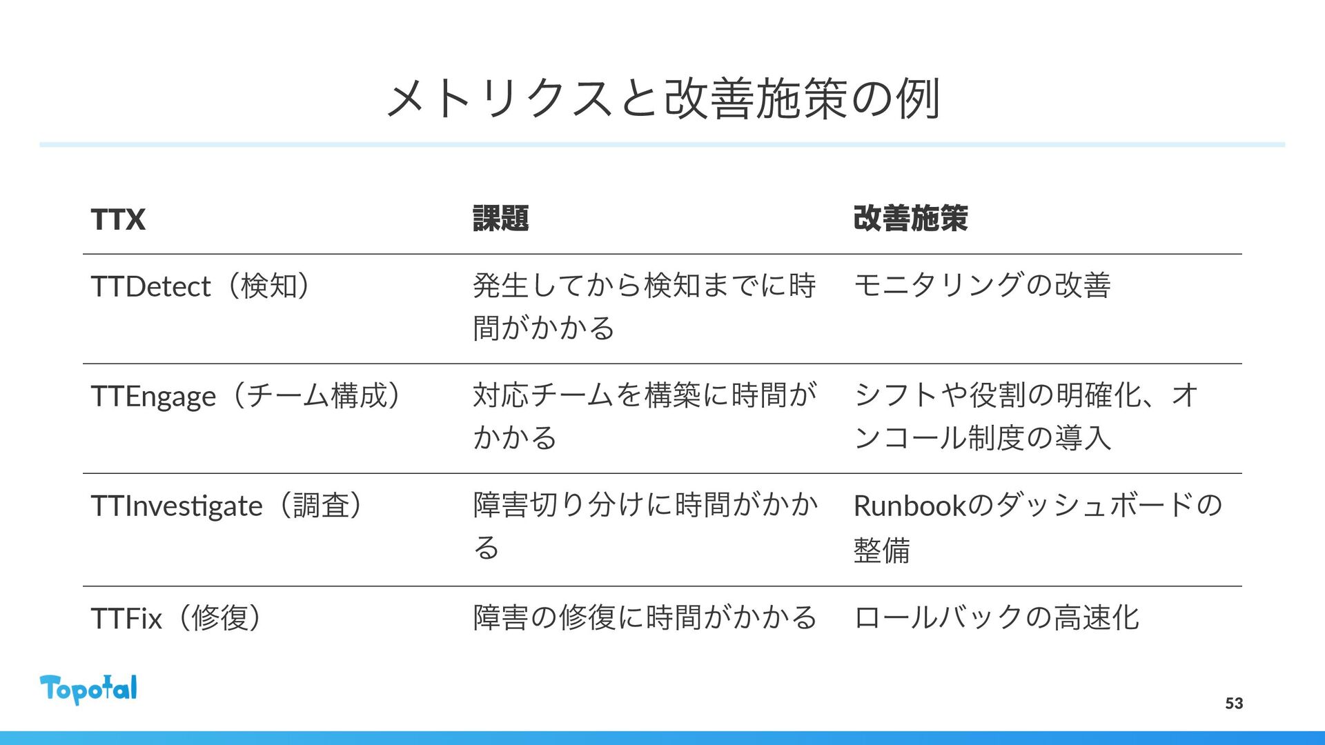 ϝτϦΫεͱվળࢪࡦͷྫ TTX ՝ վળࢪࡦ TTDetectʢݕʣ ൃੜ͔ͯ͠Βݕ·Ͱʹ࣌ ͕͔͔ؒΔ ϞχλϦϯάͷվળ TTEngageʢνʔϜߏʣ ରԠνʔϜΛߏஙʹ͕࣌ؒ