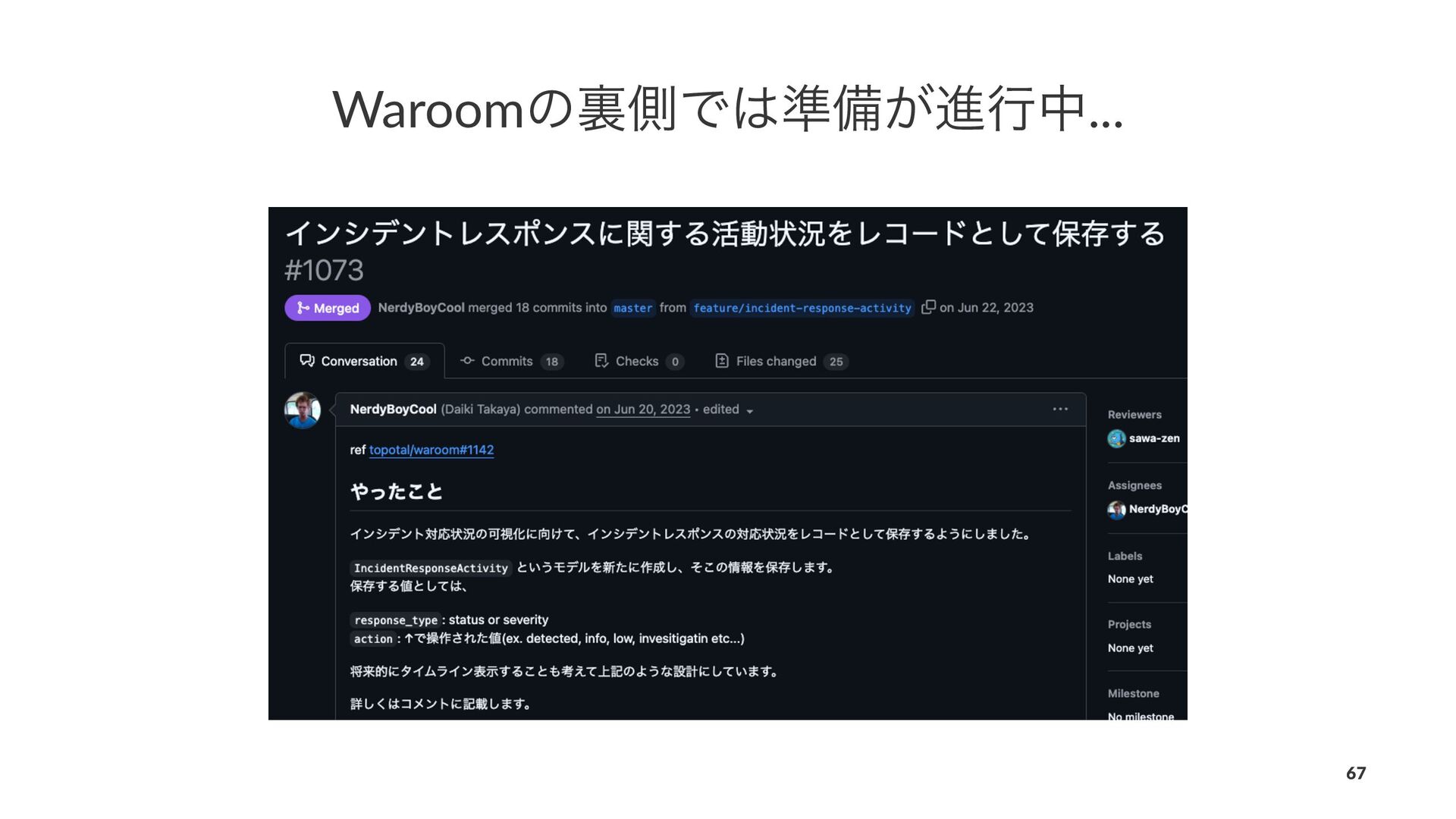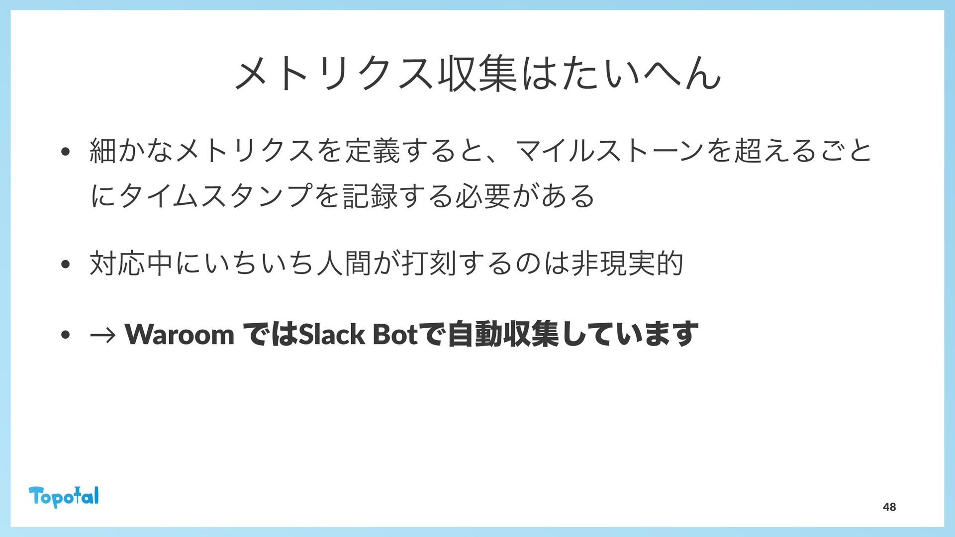 ϝτϦΫεऩू͍ͨΜ • ࡉ͔ͳϝτϦΫεΛఆٛ͢ΔͱɺϚΠϧετʔϯΛ͑Δ͝ͱ ʹλΠϜελϯϓΛه͢Δඞཁ͕͋Δ • ରԠதʹ͍͍ͪͪਓ͕ؒଧࠁ͢Δͷඇݱ࣮త • → Waroom ͰSlack