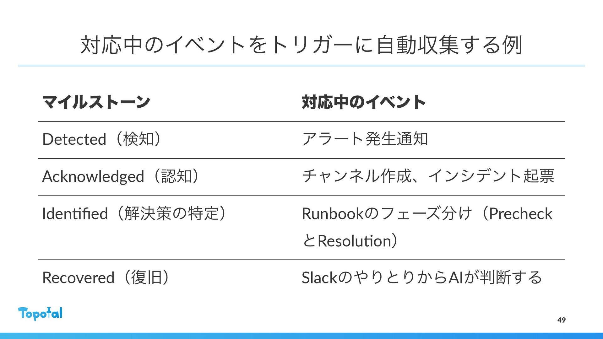 ରԠதͷΠϕϯτΛτϦΨʔʹࣗಈऩू͢Δྫ ϚΠϧετʔϯ ରԠதͷΠϕϯτ Detectedʢݕʣ Ξϥʔτൃੜ௨ Acknowledgedʢೝʣ νϟϯωϧ࡞ɺΠϯγσϯτىථ Iden.fiedʢղܾࡦͷಛఆʣ RunbookͷϑΣʔζ͚ʢPrecheck ͱResolu.onʣ