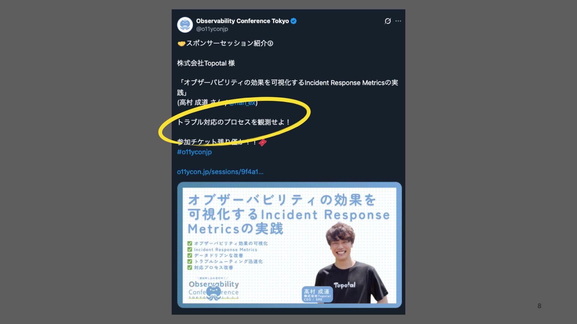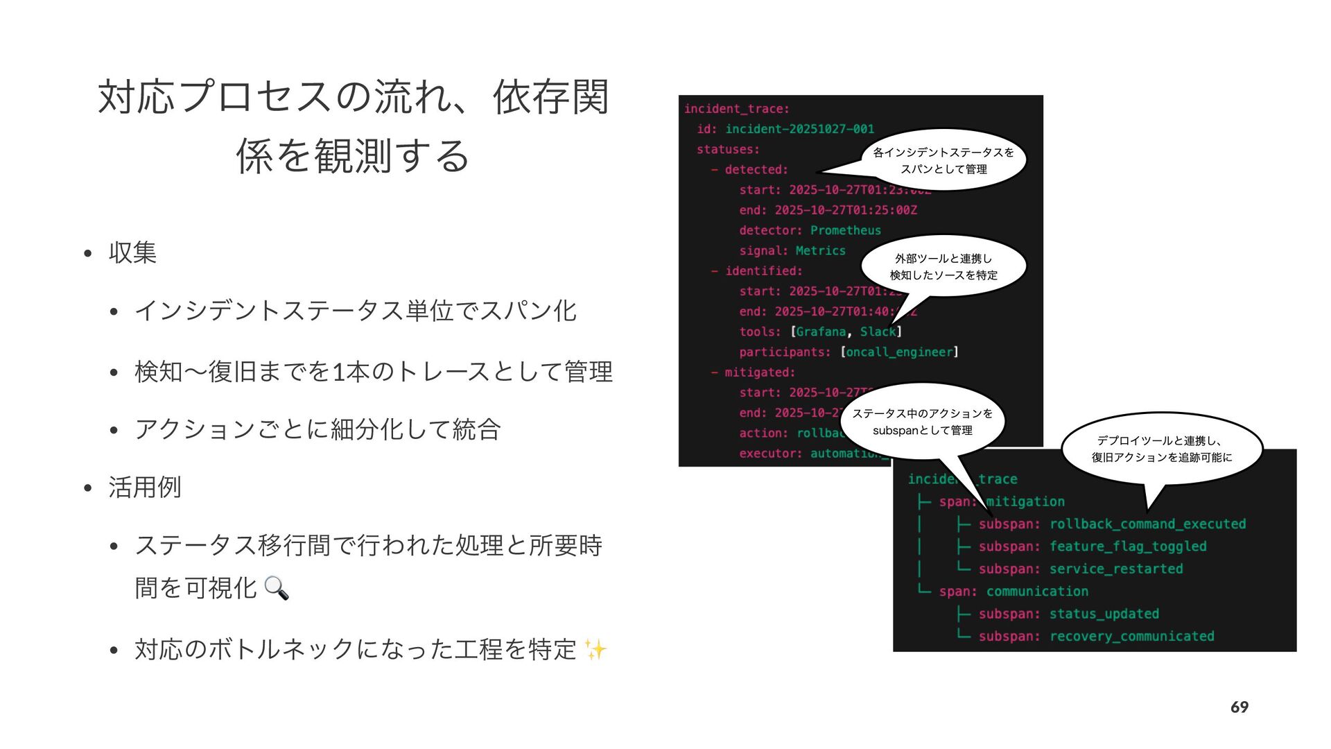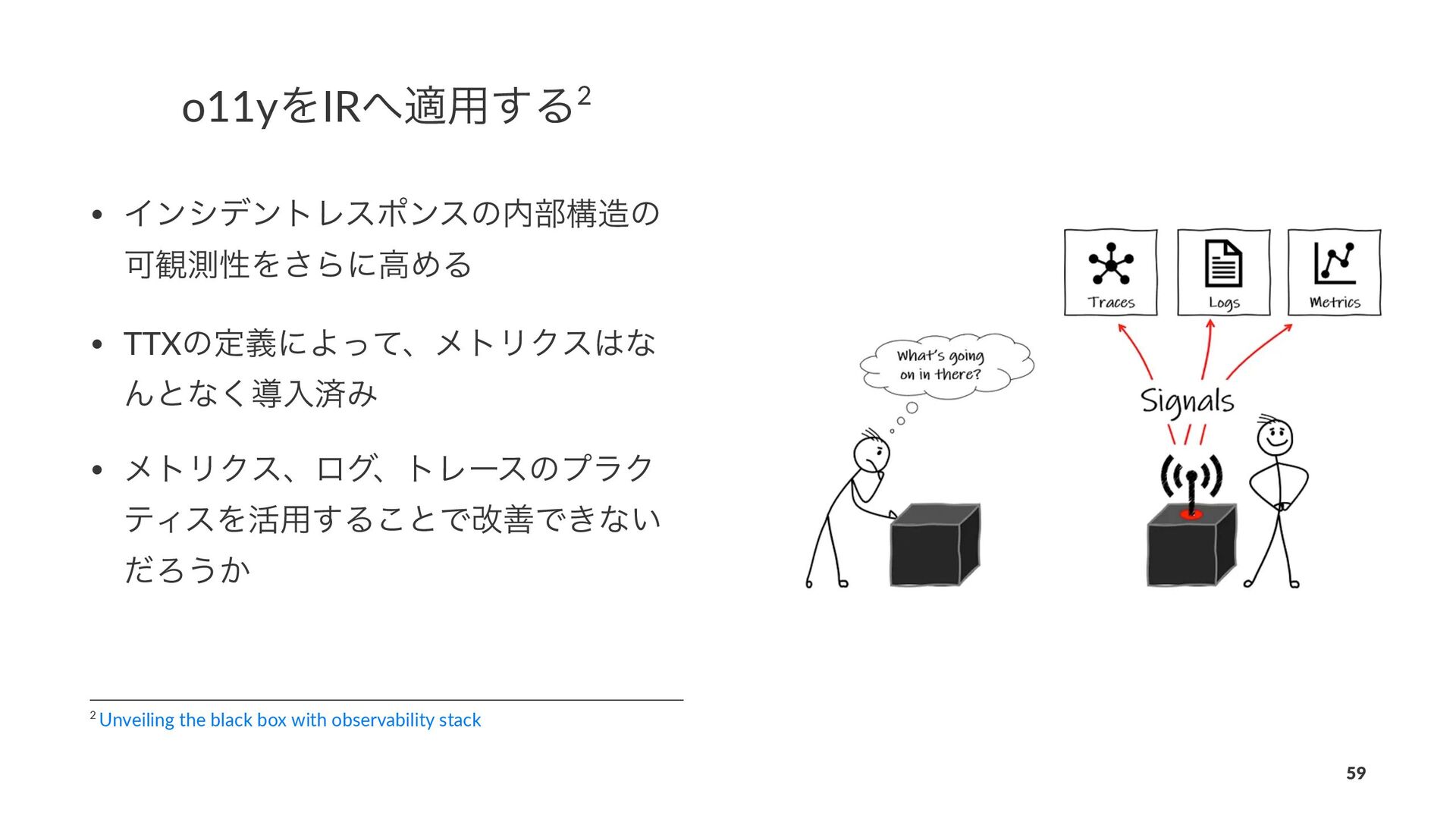 o11yΛIRద༻͢Δ2 • ΠϯγσϯτϨεϙϯεͷ෦ߏͷ Մ؍ଌੑΛ͞ΒʹߴΊΔ • TTXͷఆٛʹΑͬͯɺϝτϦΫεͳ Μͱͳ͘ಋೖࡁΈ • ϝτϦΫεɺϩάɺτϨʔεͷϓϥΫ ςΟεΛ׆༻͢Δ͜ͱͰվળͰ͖ͳ͍