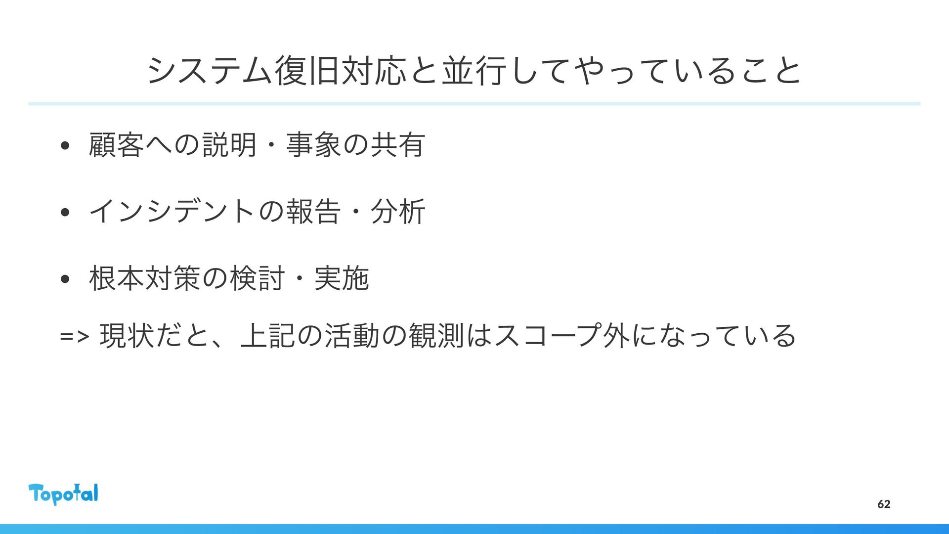 γεςϜ෮چରԠͱฒߦ͍ͯͬͯ͠Δ͜ͱ • ސ٬ͷઆ໌ɾࣄͷڞ༗ • Πϯγσϯτͷใࠂɾੳ • ࠜຊରࡦͷݕ౼ɾ࣮ࢪ => ݱঢ়ͩͱɺ্هͷ׆ಈͷ؍ଌείʔϓ֎ʹͳ͍ͬͯΔ 62