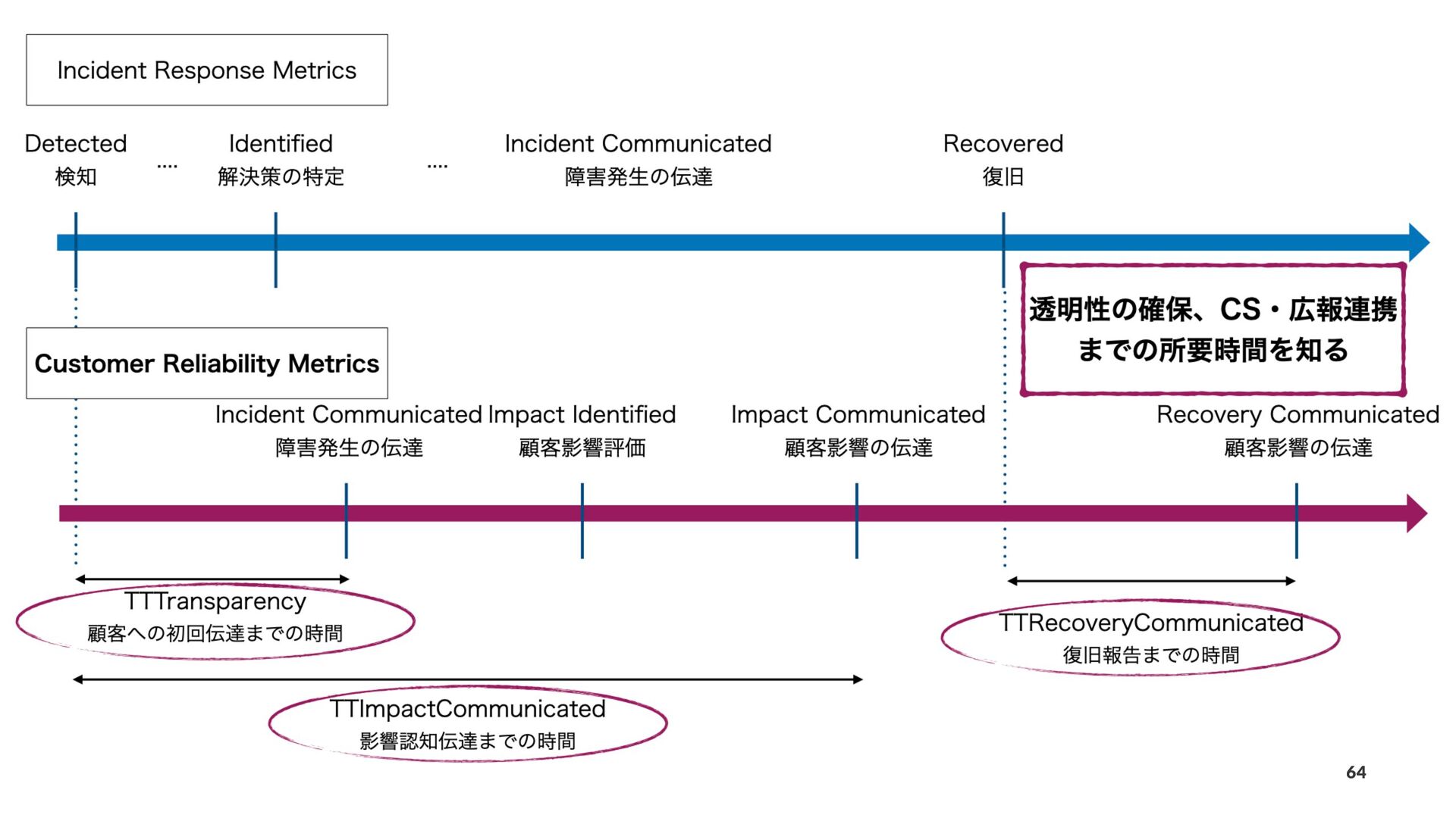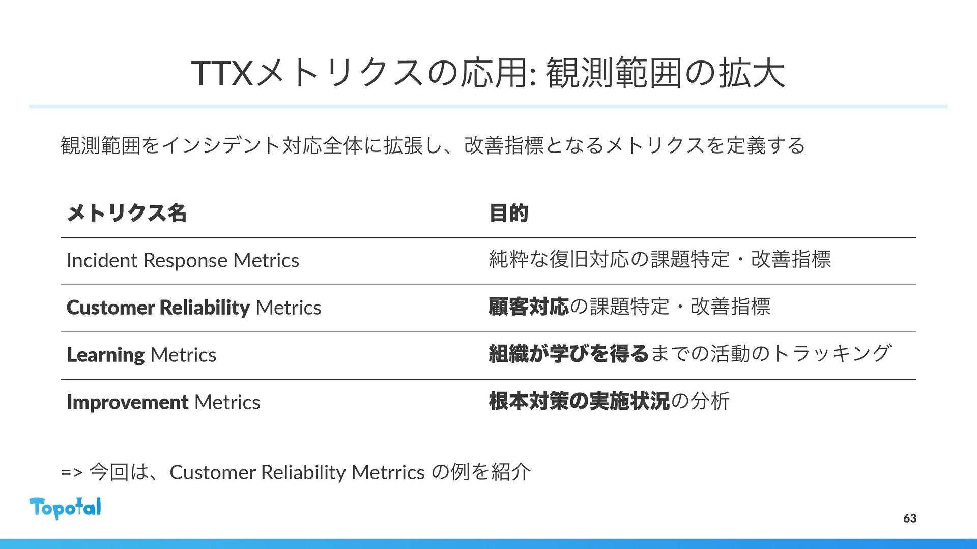 TTXϝτϦΫεͷԠ༻: ؍ଌൣғͷ֦େ ؍ଌൣғΛΠϯγσϯτରԠશମʹ֦ு͠ɺվળࢦඪͱͳΔϝτϦΫεΛఆٛ͢Δ ϝτϦΫε໊ త Incident Response Metrics ७ਮͳ෮چରԠͷ՝ಛఆɾվળࢦඪ Customer