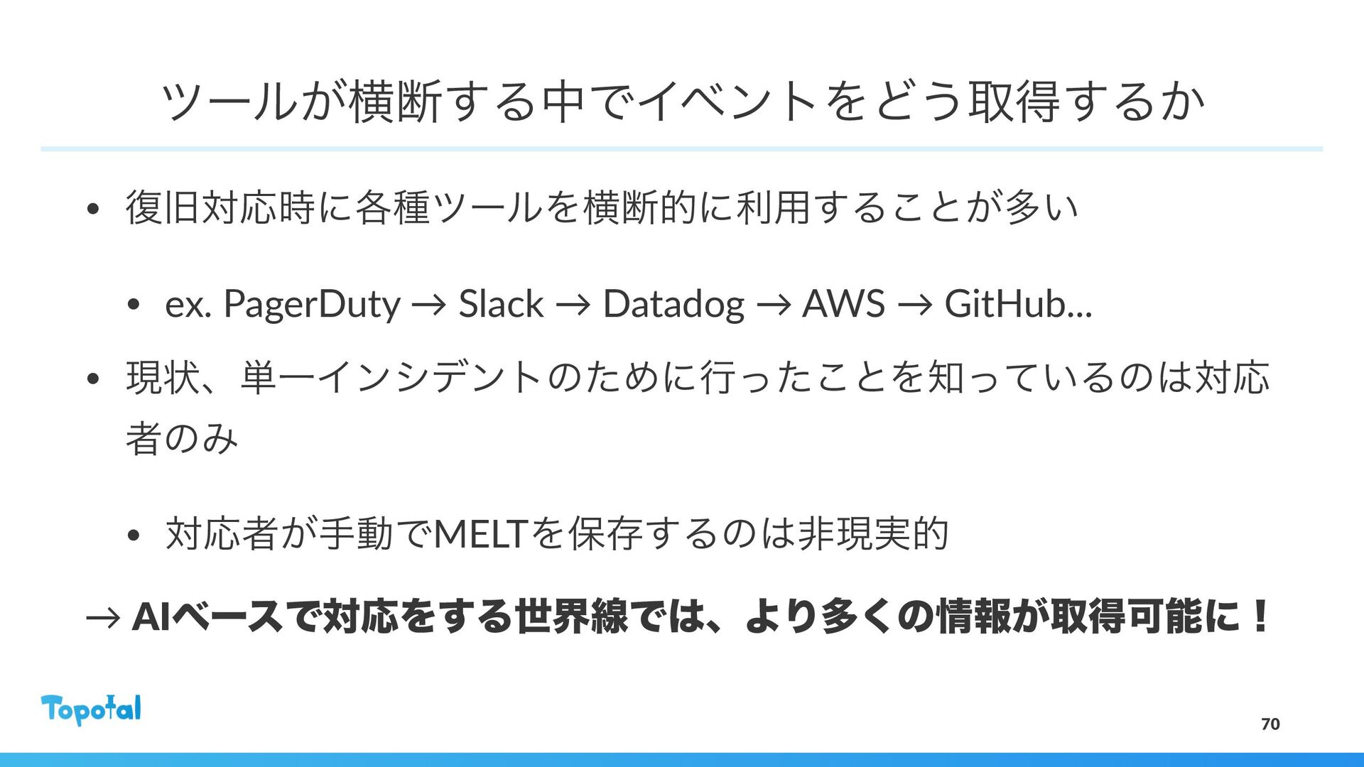 → AWS → GitHub... • ݱঢ়ɺ୯ҰΠϯγσϯτͷͨΊʹߦͬͨ͜ͱΛ͍ͬͯΔͷରԠ ऀͷΈ • ରԠऀ͕खಈͰMELTΛอଘ͢Δͷඇݱ࣮త → AIϕʔεͰରԠΛ͢ΔੈքઢͰɺΑΓଟ͘ͷใ͕औಘՄೳʹʂ 70