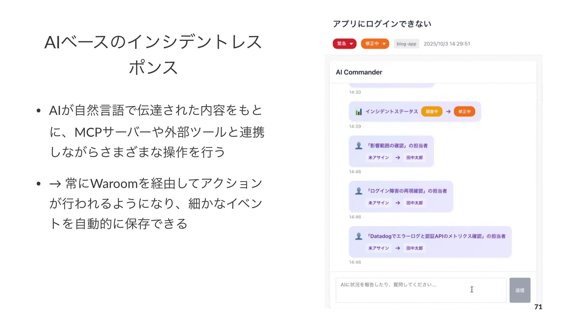 AIϕʔεͷΠϯγσϯτϨε ϙϯε • AI͕ࣗવݴޠͰୡ͞Εͨ༰Λͱ ʹɺMCPαʔόʔ֎෦πʔϧͱ࿈ܞ ͠ͳ͕Β͞·͟·ͳૢ࡞Λߦ͏ • → ৗʹWaroomΛܦ༝ͯ͠ΞΫγϣϯ ͕ߦΘΕΔΑ͏ʹͳΓɺࡉ͔ͳΠϕϯ