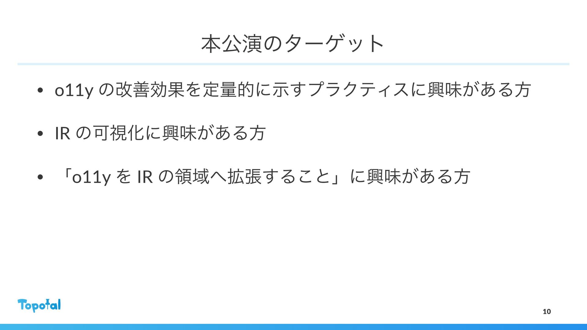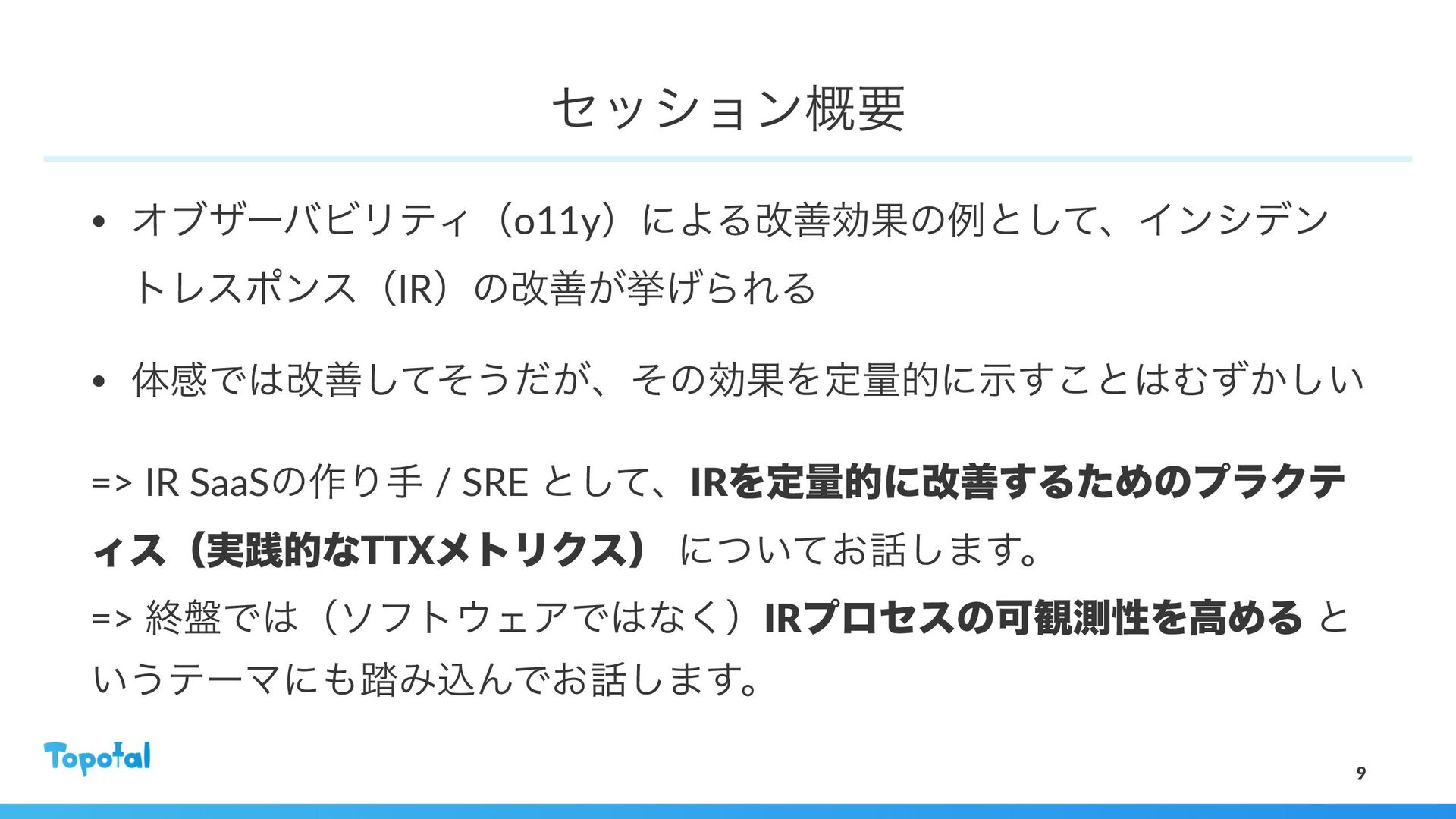 SRE ͱͯ͠ɺIRΛఆྔతʹվળ͢ΔͨΊͷϓϥΫς Οεʢ࣮ફతͳTTXϝτϦΫεʣ ʹ͍͓ͭͯ͠·͢ɻ => ऴ൫ͰʢιϑτΣΞͰͳ͘ʣIRϓϩηεͷՄ؍ଌੑΛߴΊΔ ͱ ͍͏ςʔϚʹ౿ΈࠐΜͰ͓͠·͢ɻ 9