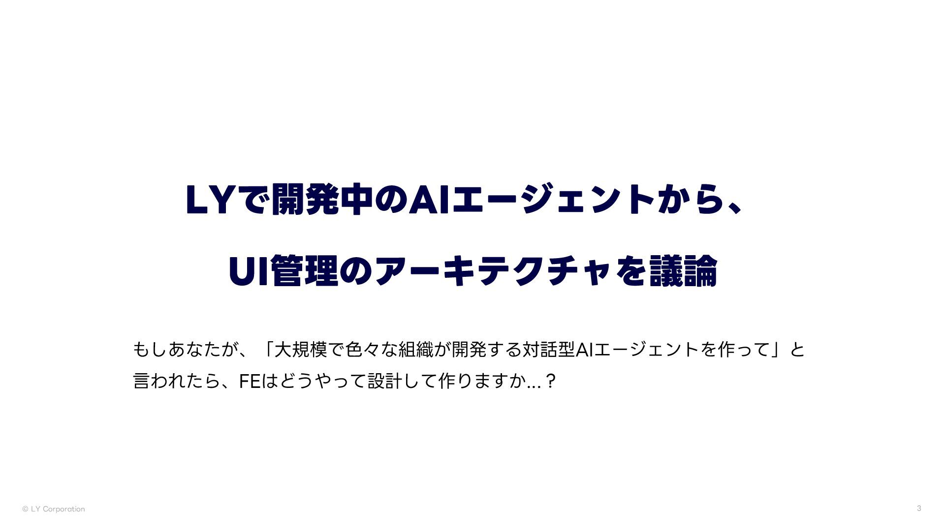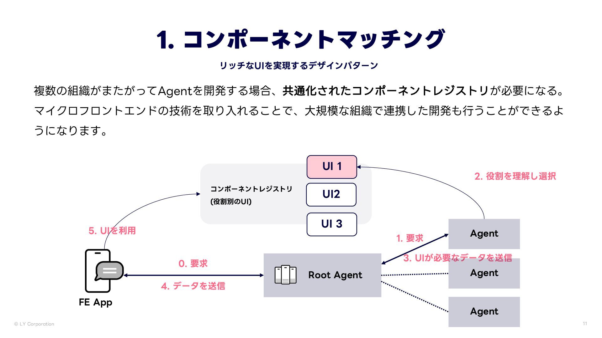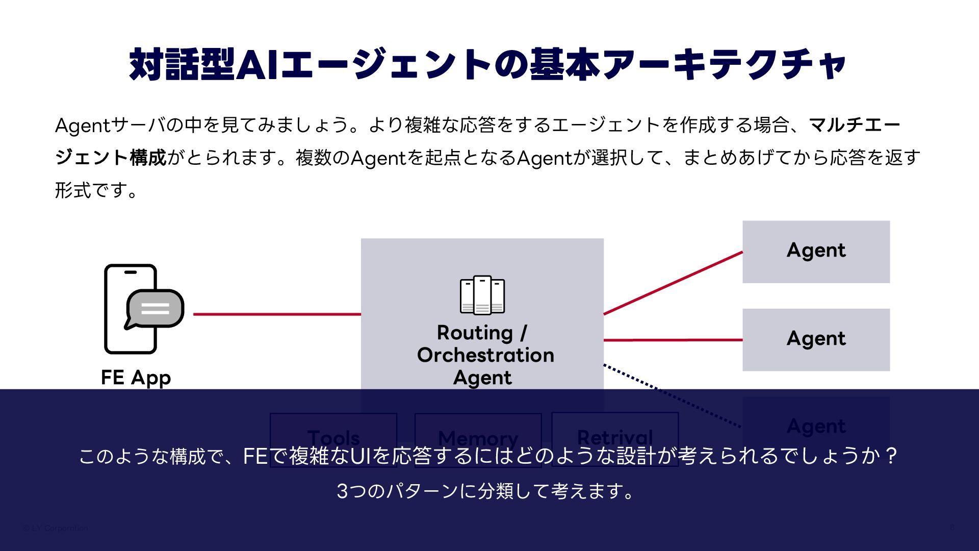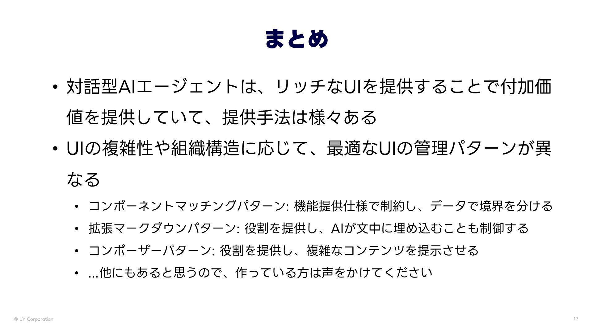 LINEヤフーで開発中のAIエージェントから、対話型AIエージェントにおけるリッチなUIをどように提供するかを議論します。本LTでは、UI管理の手法を3つのアーキテクチャパターンに分けて解説しています。