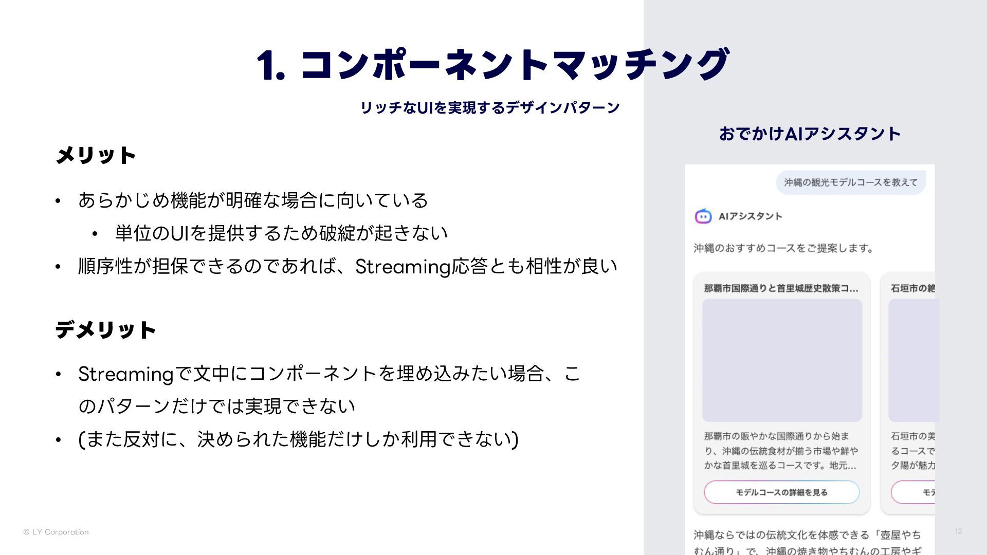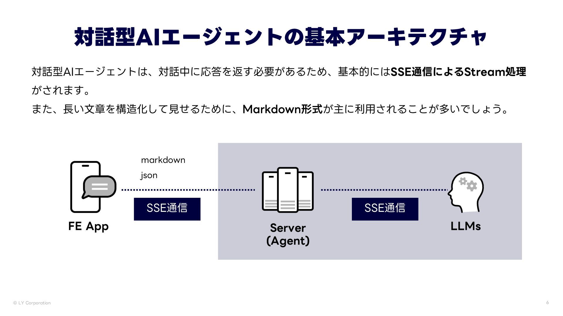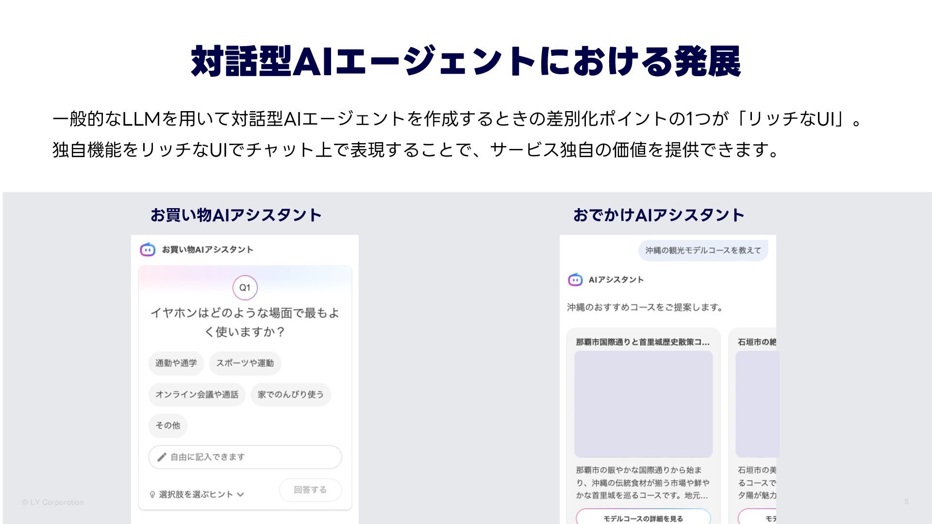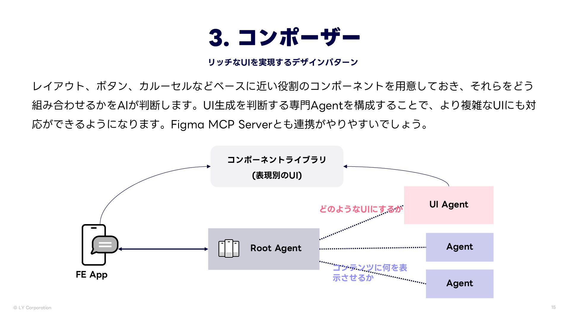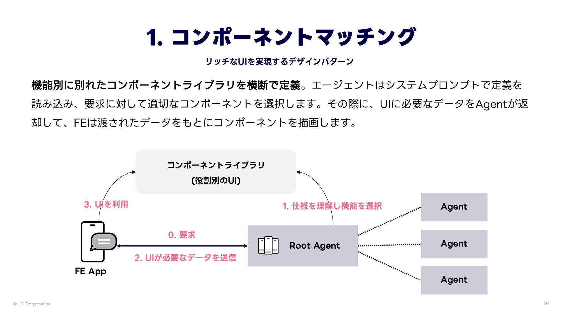 LINEヤフーで開発中のAIエージェントから、対話型AIエージェントにおけるリッチなUIをどように提供するかを議論します。本LTでは、UI管理の手法を3つのアーキテクチャパターンに分けて解説しています。