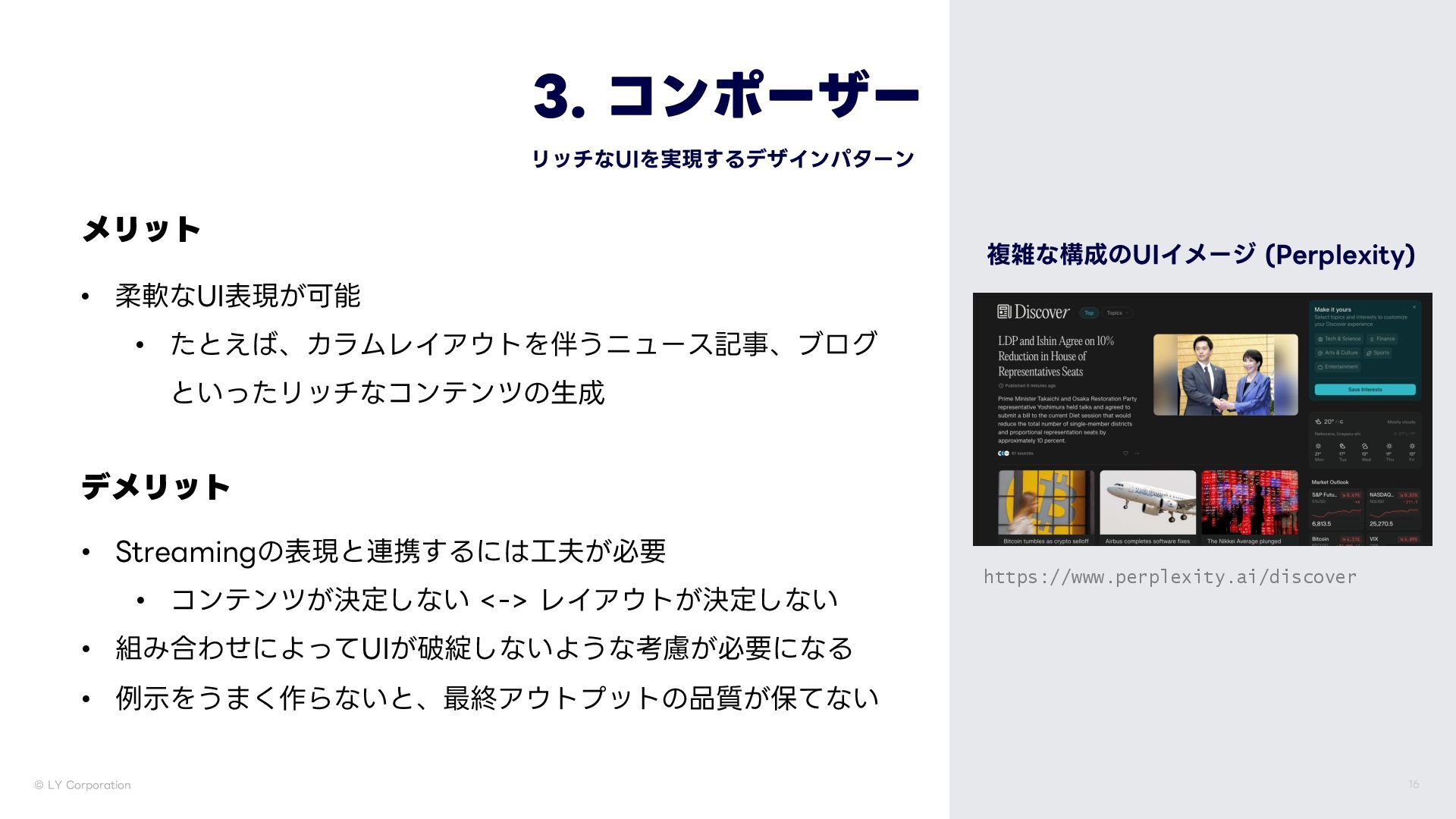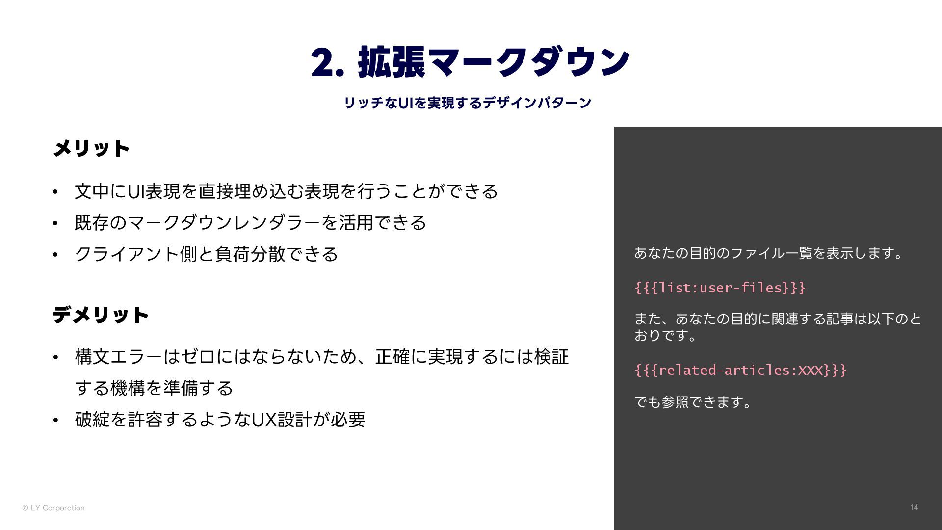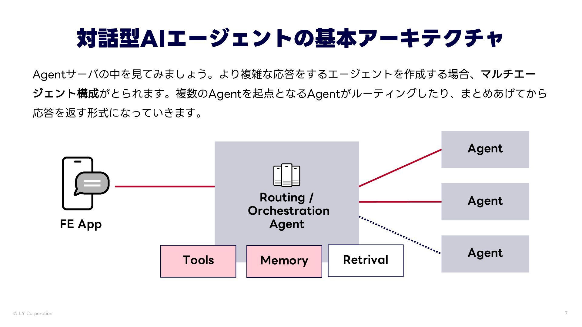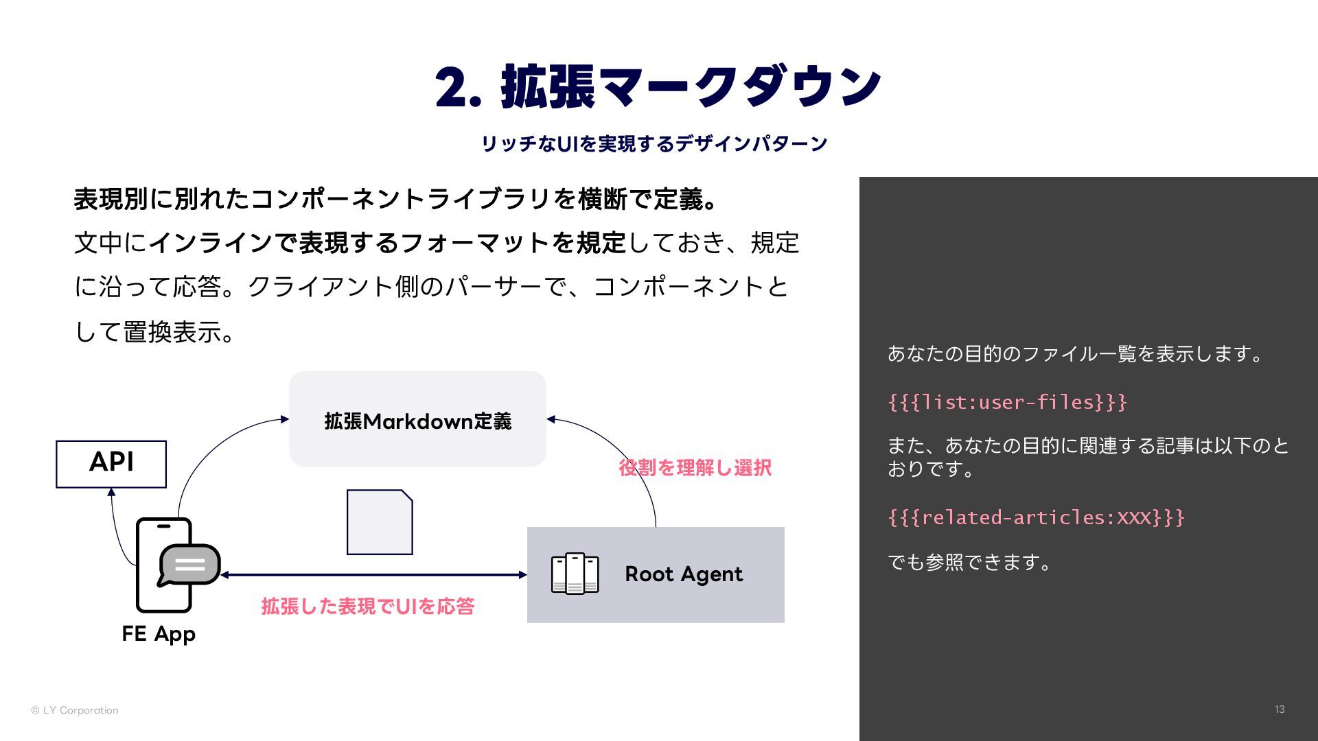 LINEヤフーで開発中のAIエージェントから、対話型AIエージェントにおけるリッチなUIをどように提供するかを議論します。本LTでは、UI管理の手法を3つのアーキテクチャパターンに分けて解説しています。
