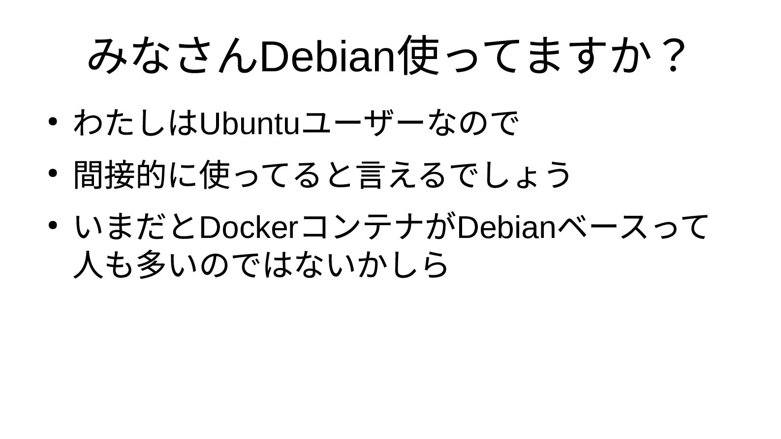 みなさんDebian 使ってますか? • わたしはUbuntu ユーザーなので • 間接的に使ってると言えるでしょう • いまだとDocker コンテナがDebian