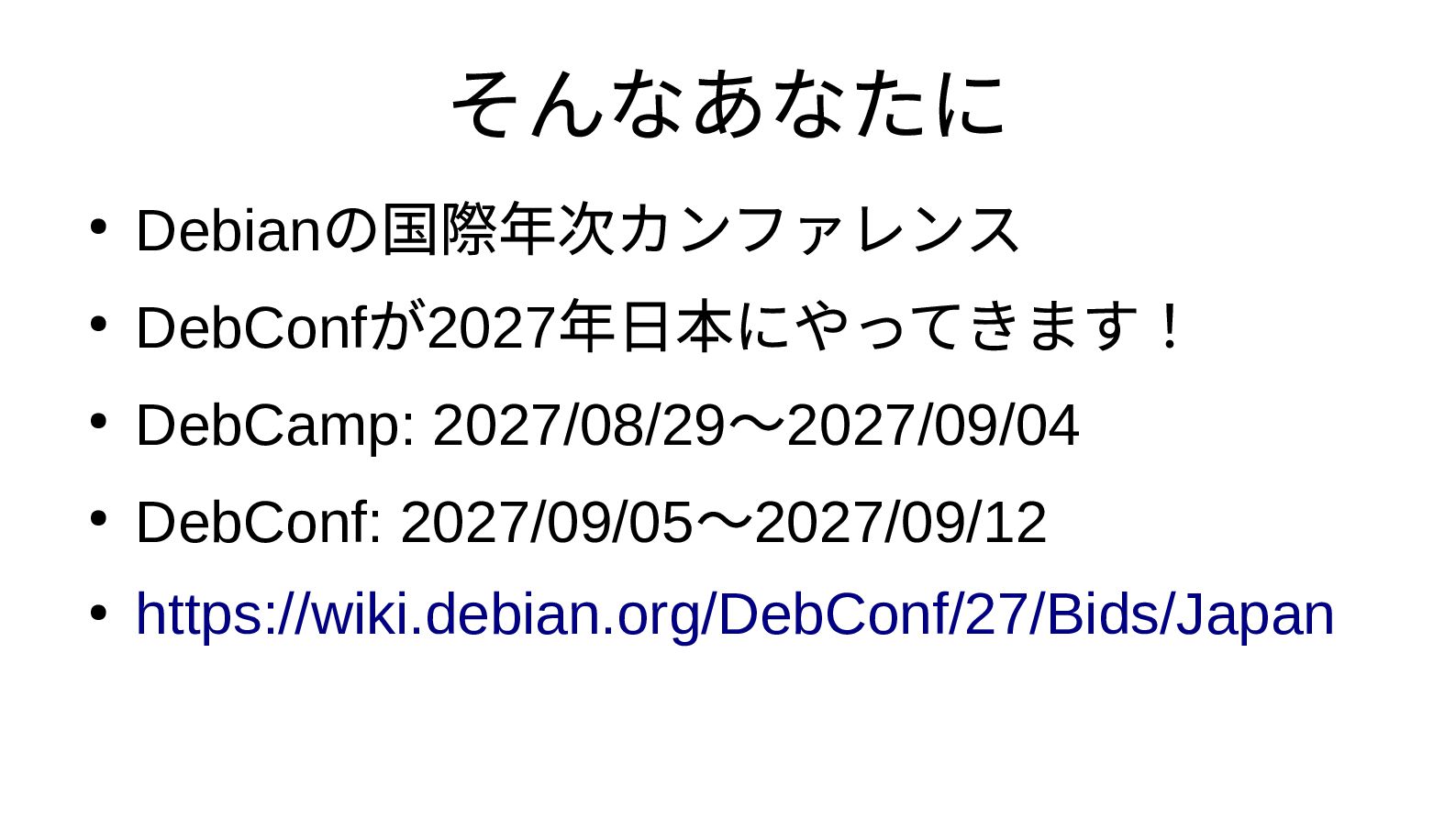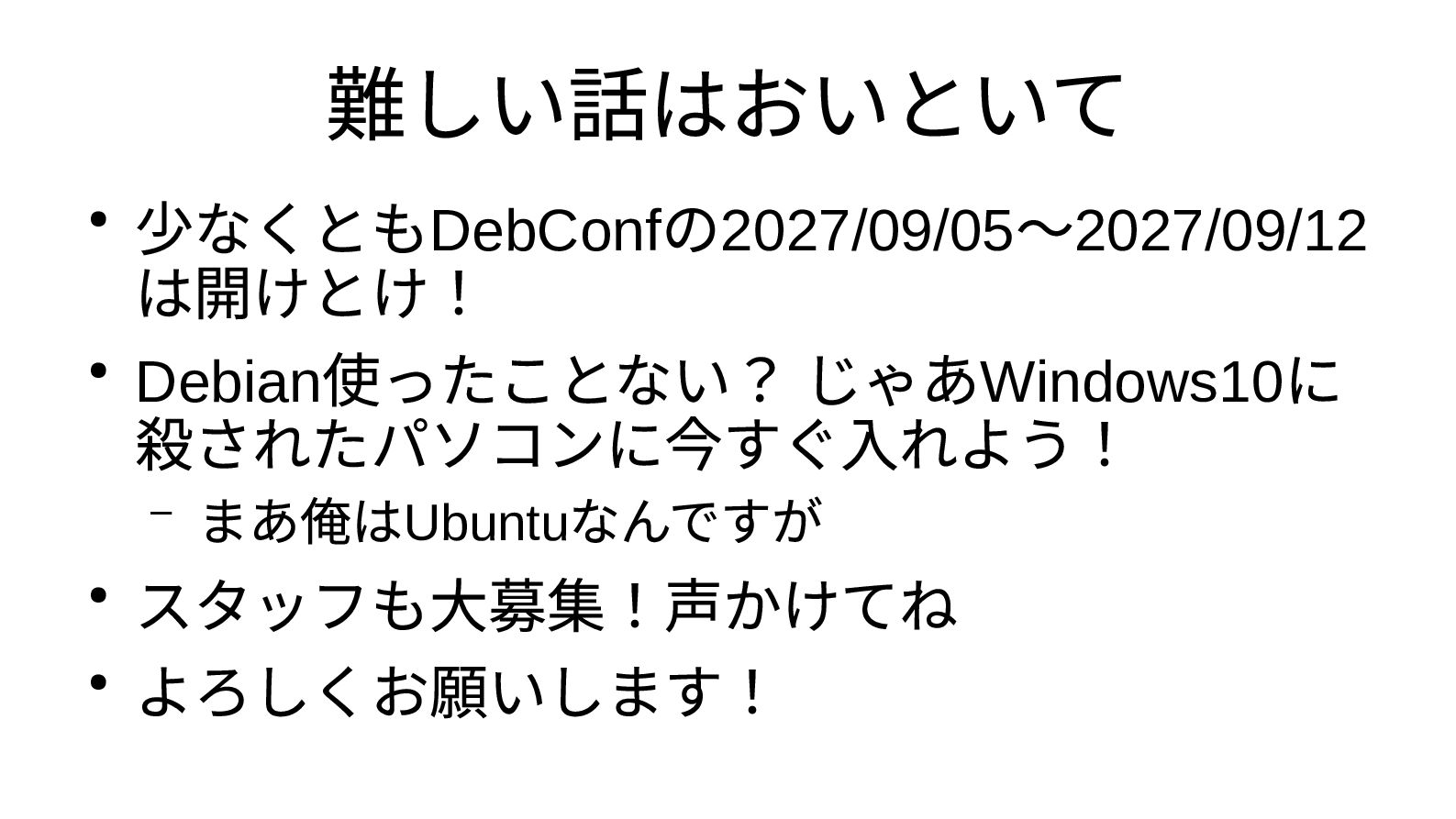 難しい話はおいといて • 少なくともDebConf の2027/09/05 ~2027/09/12 は開けとけ! • Debian 使ったことない? じゃあWindows10