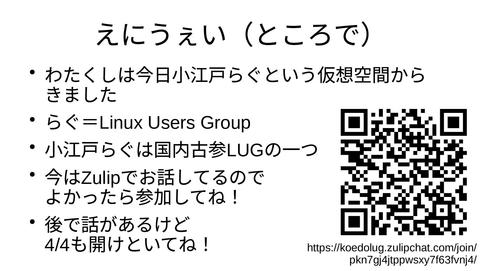 の一つ • 今はZulip でお話してるので よかったら参加してね! • 後で話があるけど 4/4 も開けといてね! https://koedolug.zulipchat.com/join/ pkn7gj4jtppwsxy7f63fvnj4/