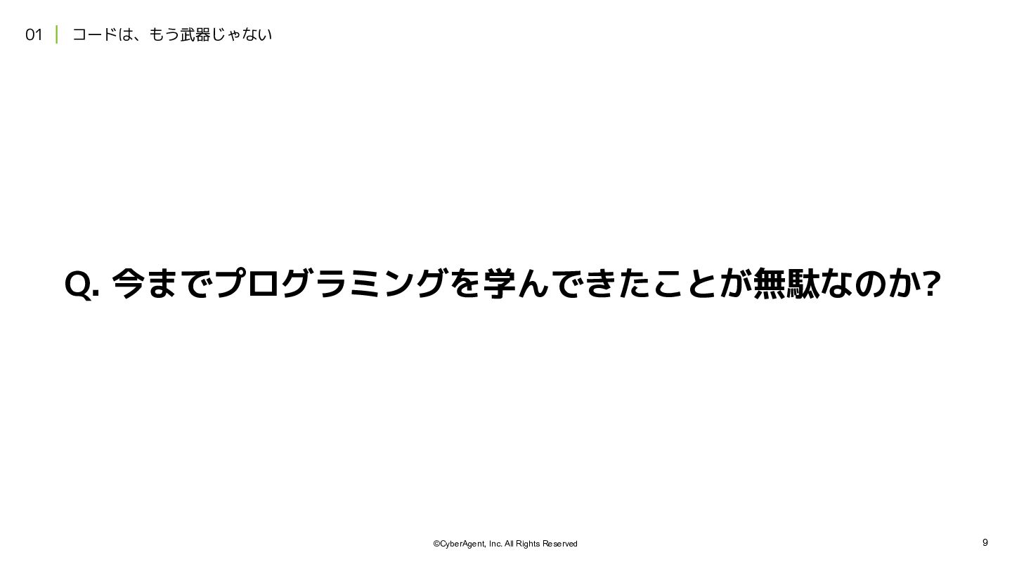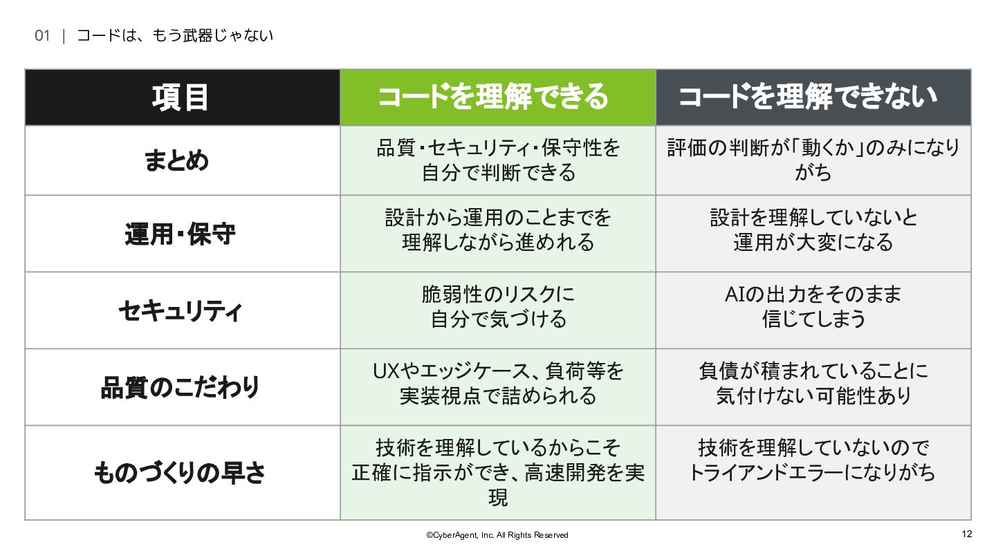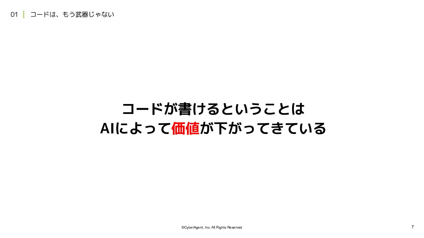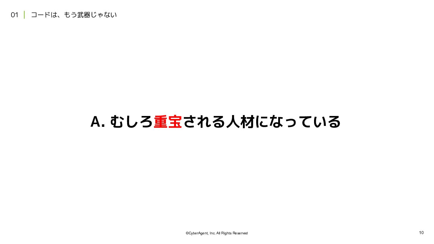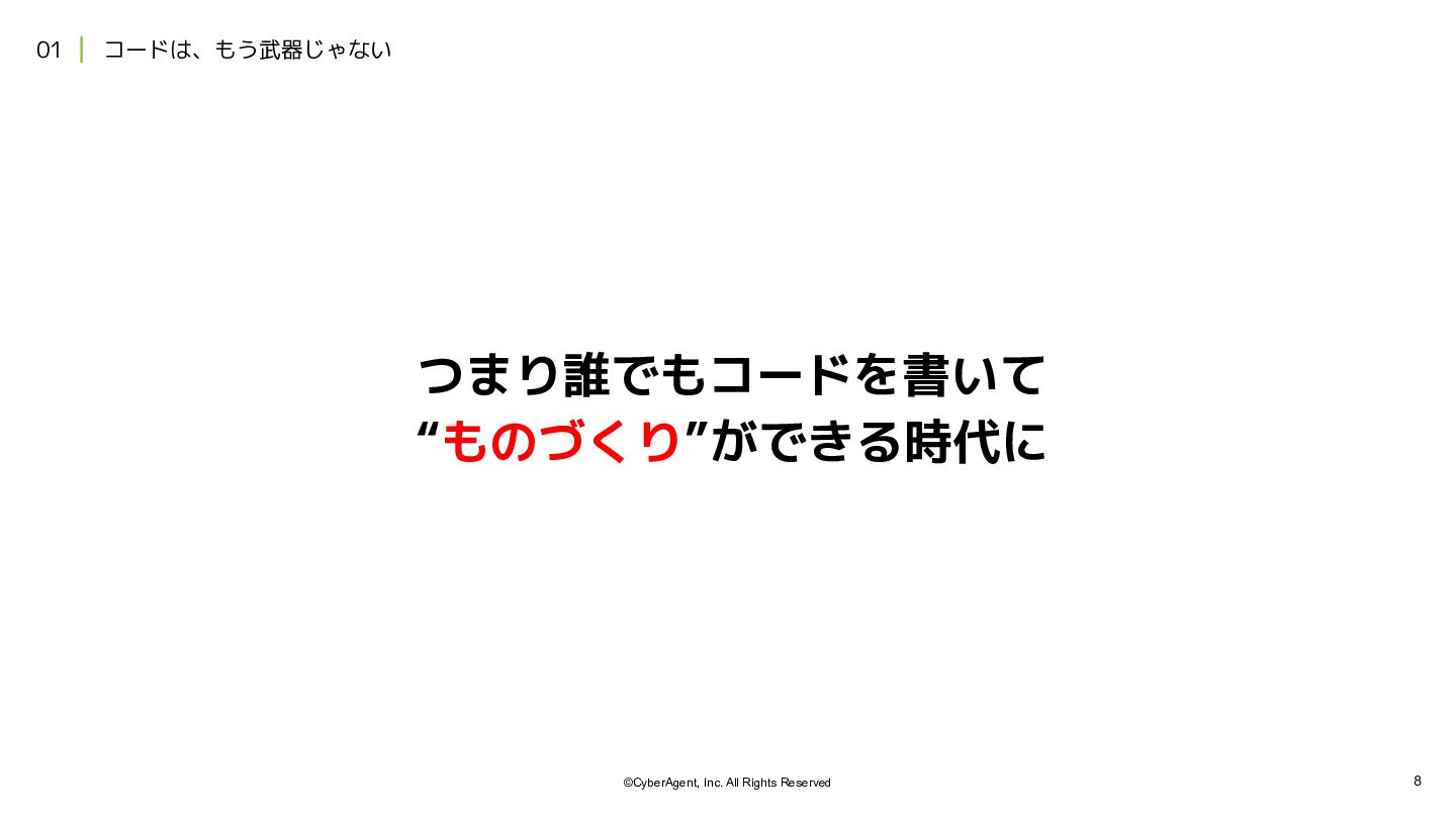 2. 12 ©CyberAgent, Inc. All Rights Reserved 01 | コードは、もう武器じゃない 項目