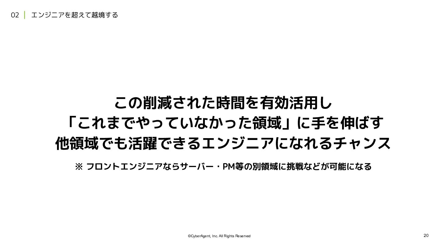3. 20 ©CyberAgent, Inc. All Rights Reserved 02 エンジニアを超えて越境する この削減された時間を有効活用し 「これまでやっていなかった領域」に手を伸ばす