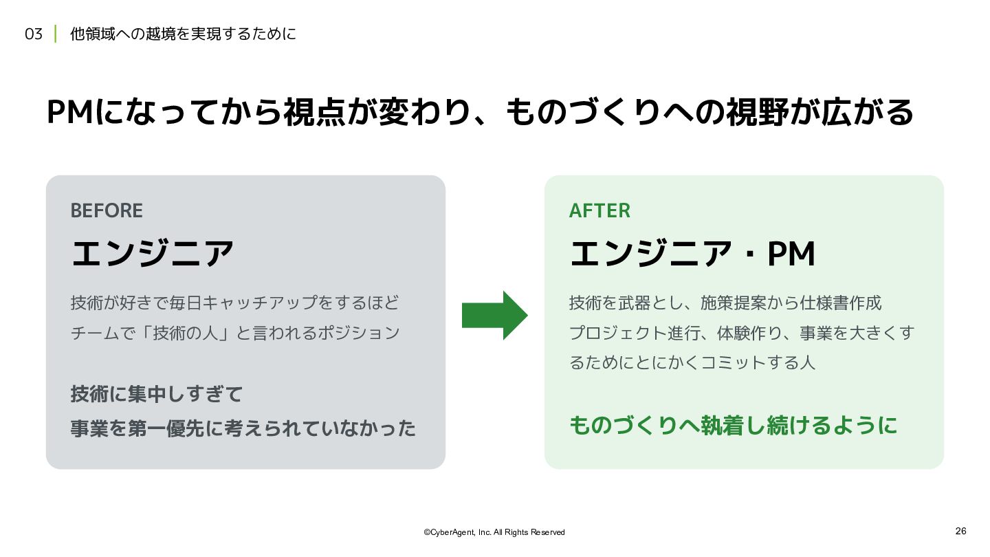 5. 26 ©CyberAgent, Inc. All Rights Reserved 03 他領域への越境を実現するために PMになってから視点が変わり、ものづくりへの視野が広がる BEFORE