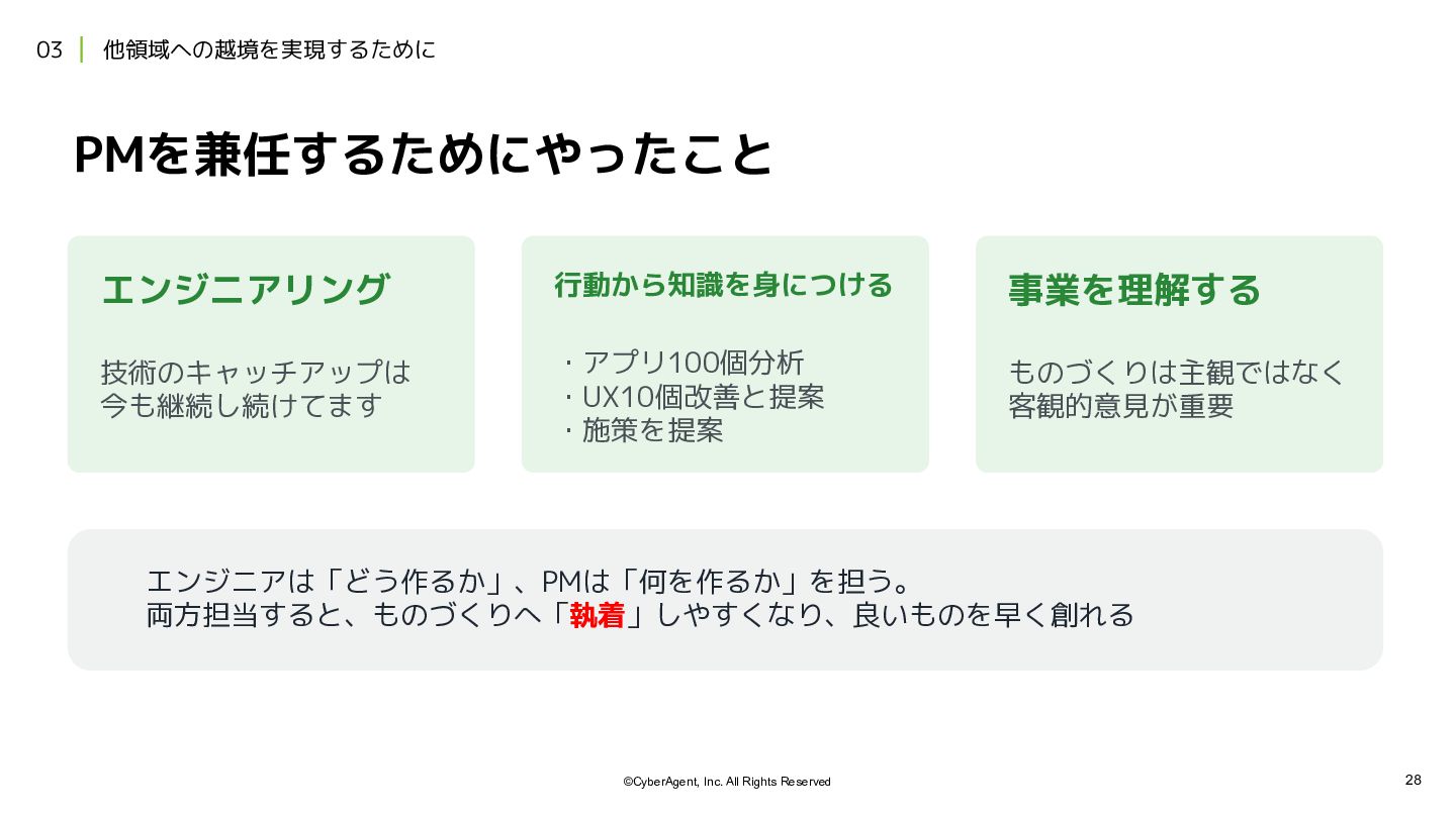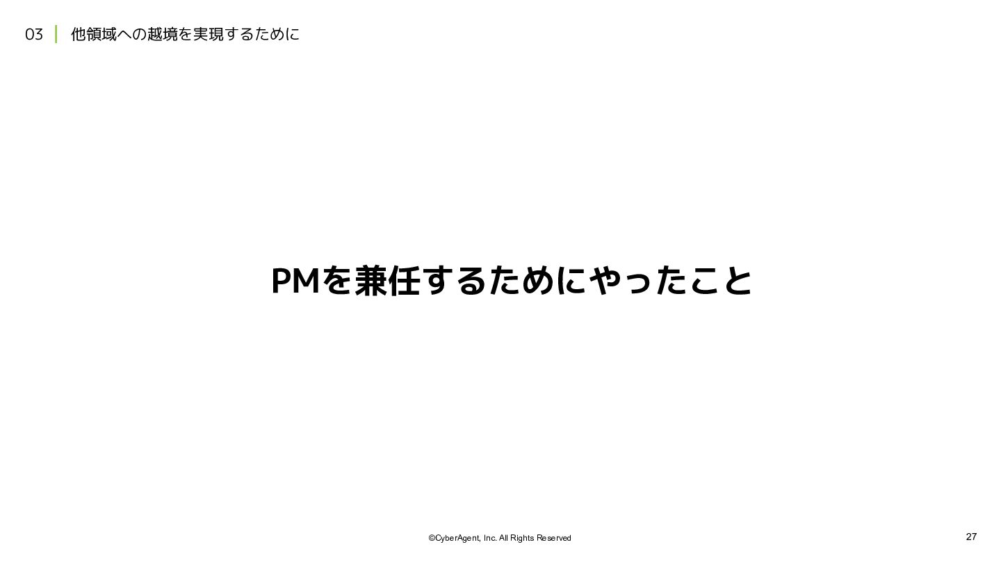 6. 28 ©CyberAgent, Inc. All Rights Reserved 03 他領域への越境を実現するために PMを兼任するためにやったこと エンジニアリング