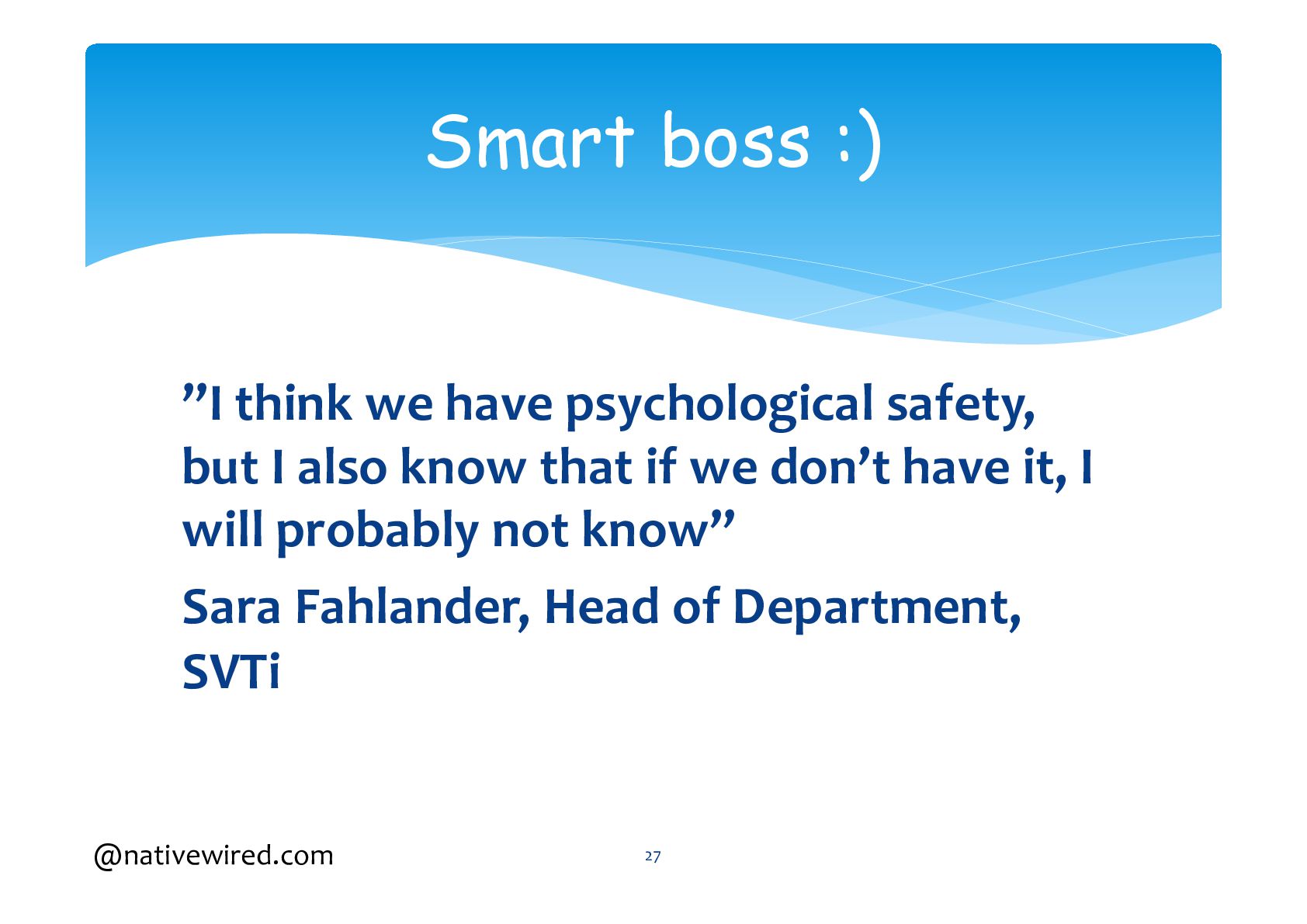 She will dive into the role managers and leadership play in achieving psychological safety. She will also explain why it is important to create it for the whole company and not just for individual teams.