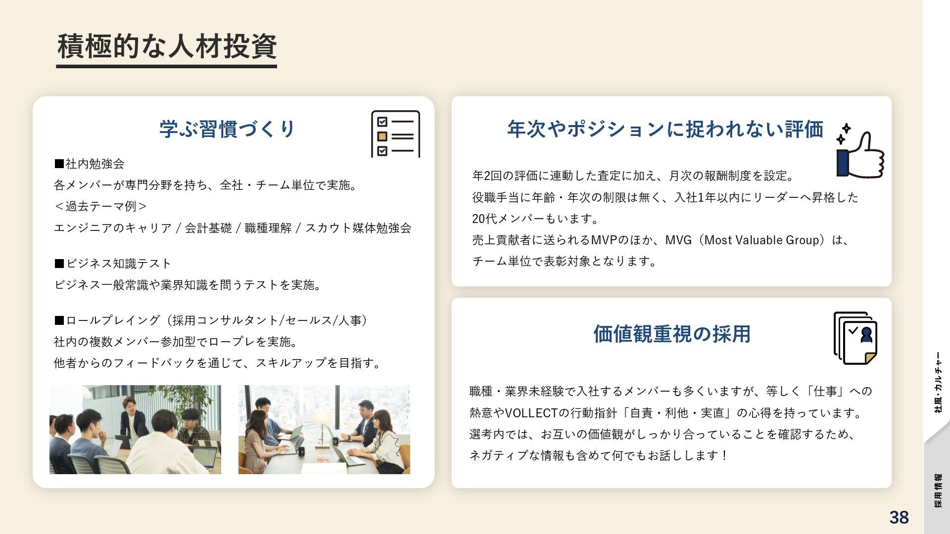 学ぶ習慣づくり ▪社内勉強会 各メンバーが専門分野を持ち、全社・チーム単位で実施。 <過去テーマ例> エンジニアのキャリア / 会計基礎 / 職種理解 / スカウト媒体勉強会 ▪ビジネス知識テスト ビジネス一般常識や業界知識を問うテストを実施。 ▪ロールプレイング(採用コンサルタント/セールス/人事) 社内の複数メンバー参加型でロープレを実施。 他者からのフィードバックを通じて、スキルアップを目指す。 価値観重視の採用 職種・業界未経験で入社するメンバーも多くいますが、等しく「仕事」への 熱意やVOLLECTの行動指針「自責・利他・実直」の心得を持っています。 選考内では、お互いの価値観がしっかり合っていることを確認するため、 ネガティブな情報も含めて何でもお話しします!
