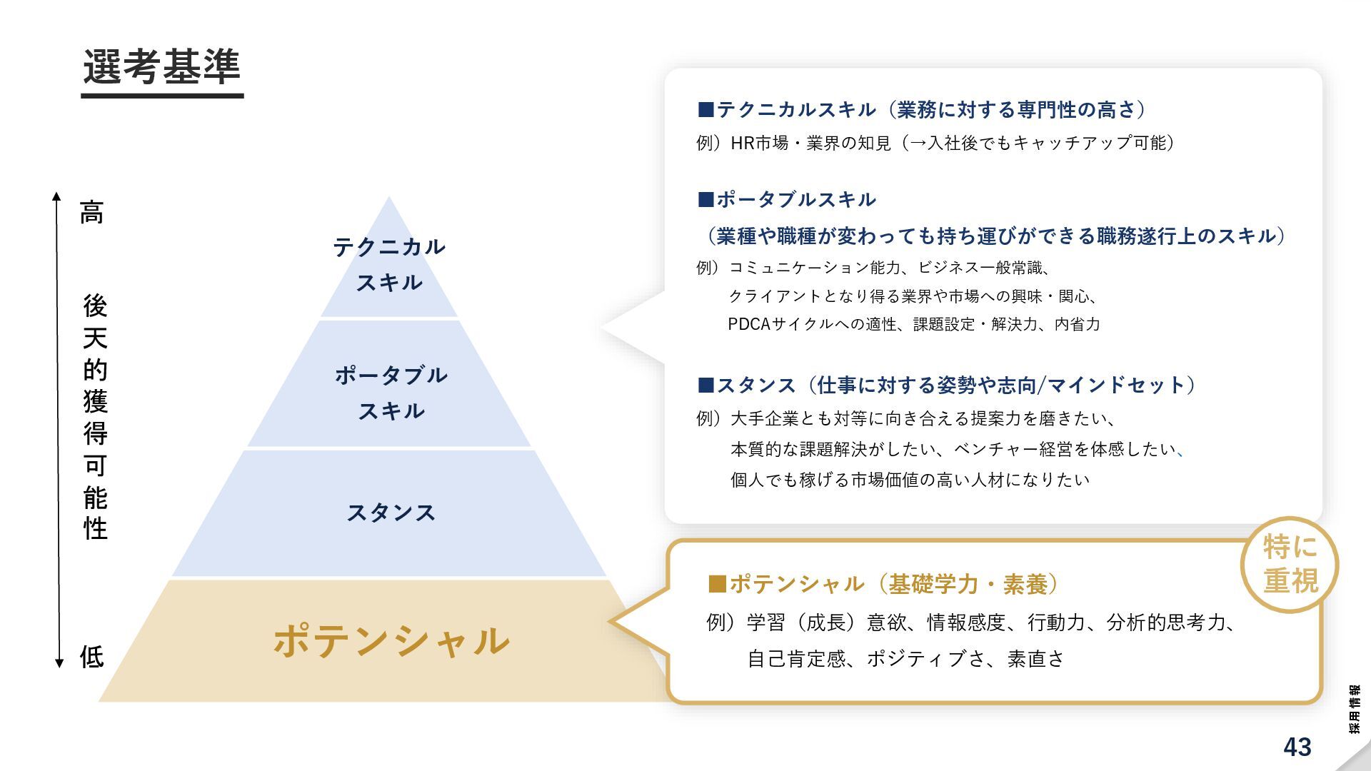 テクニカル スキル ポータブル スキル スタンス ポテンシャル 低 高 ▪テクニカルスキル(業務に対する専門性の高さ) 例)HR市場・業界の知見(→入社後でもキャッチアップ可能) ▪ポータブルスキル (業種や職種が変わっても持ち運びができる職務遂行上のスキル) 例)コミュニケーション能力、ビジネス一般常識、 クライアントとなり得る業界や市場への興味・関心、 PDCAサイクルへの適性、課題設定・解決力、内省力 ▪スタンス(仕事に対する姿勢や志向/マインドセット) 例)大手企業とも対等に向き合える提案力を磨きたい、 本質的な課題解決がしたい、ベンチャー経営を体感したい、 個人でも稼げる市場価値の高い人材になりたい ▪ポテンシャル(基礎学力・素養) 例)学習(成長)意欲、情報感度、行動力、分析的思考力、 自己肯定感、ポジティブさ、素直さ 特に 重視