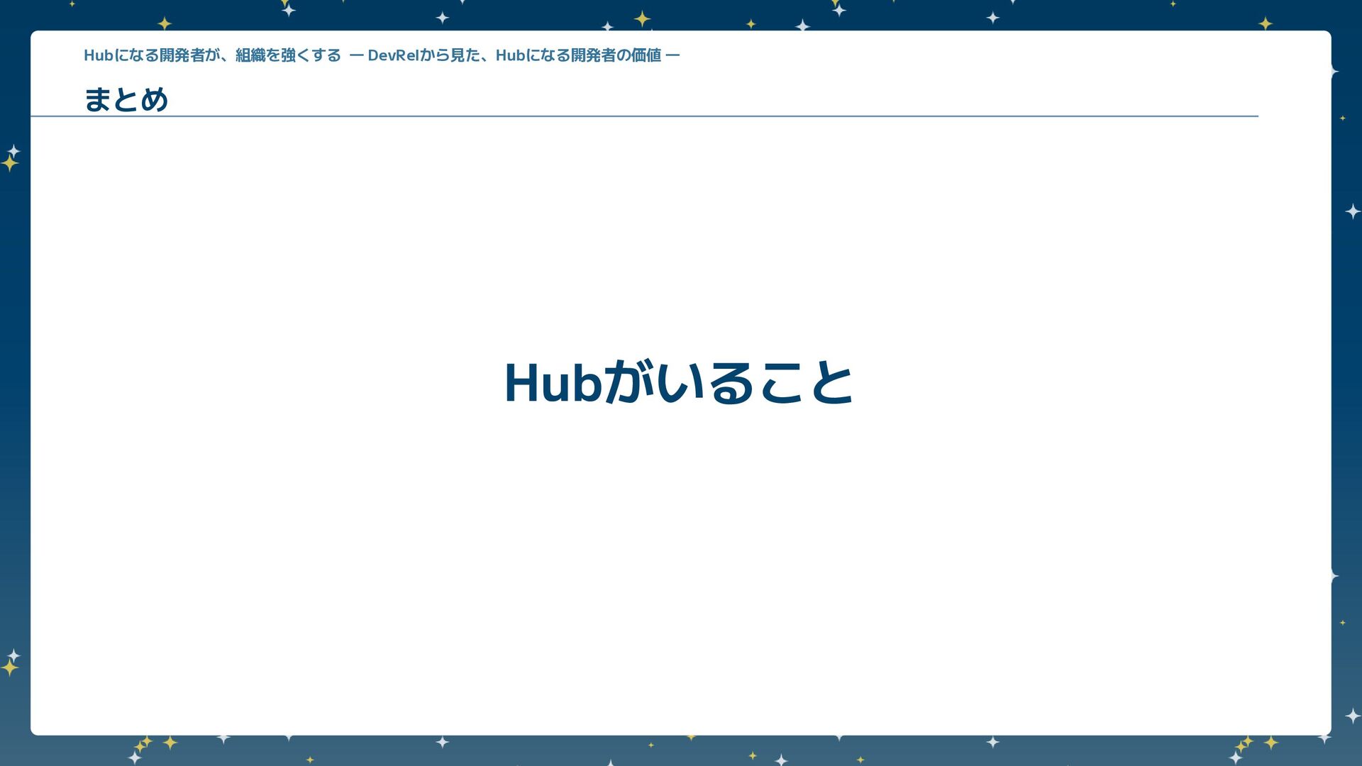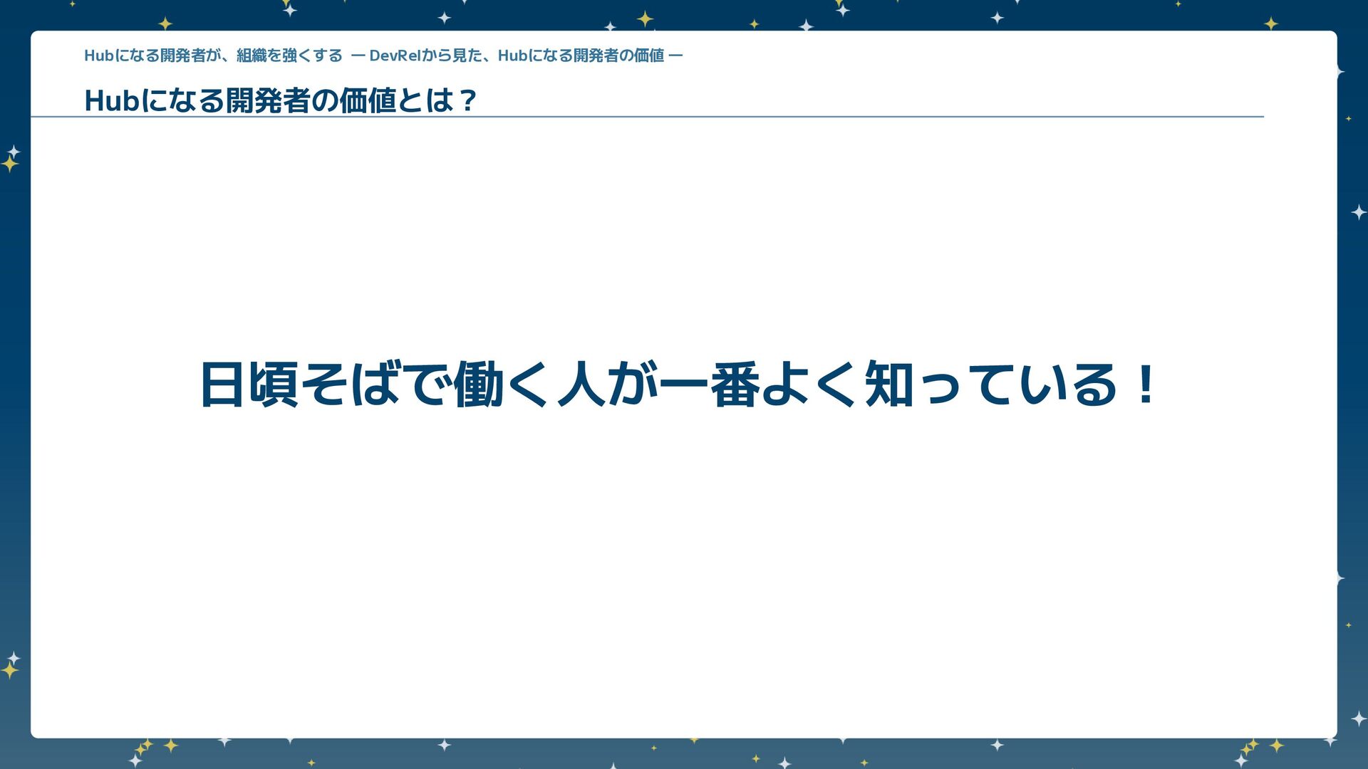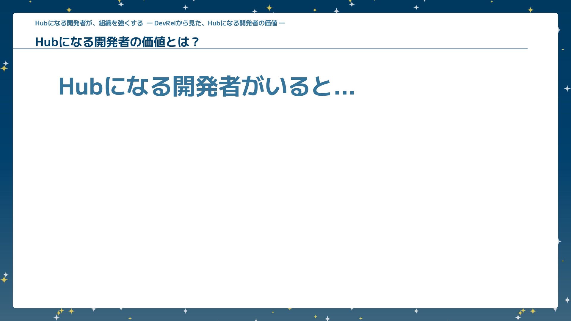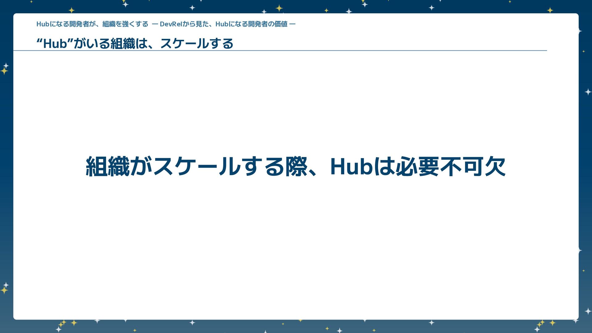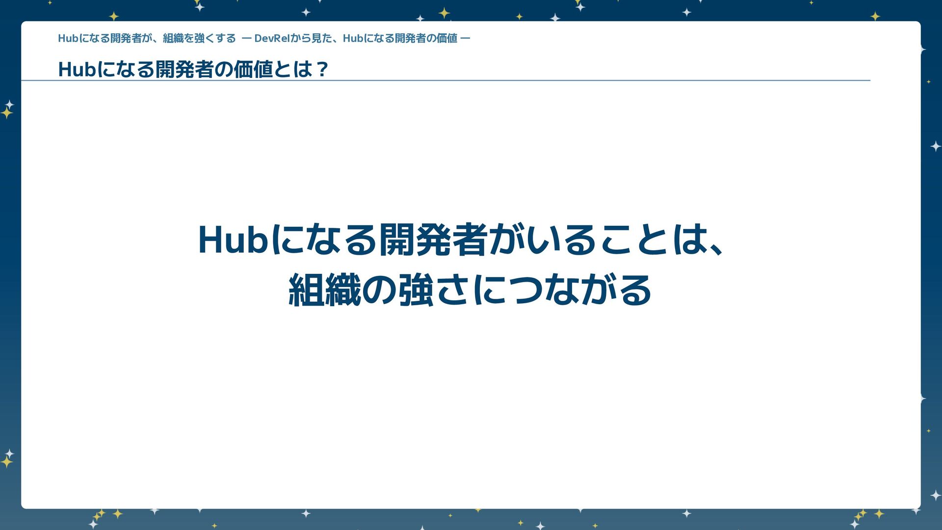 本スライドは、DevRelの視点からHubになる開発者の価値と組織としての強さを語ります。