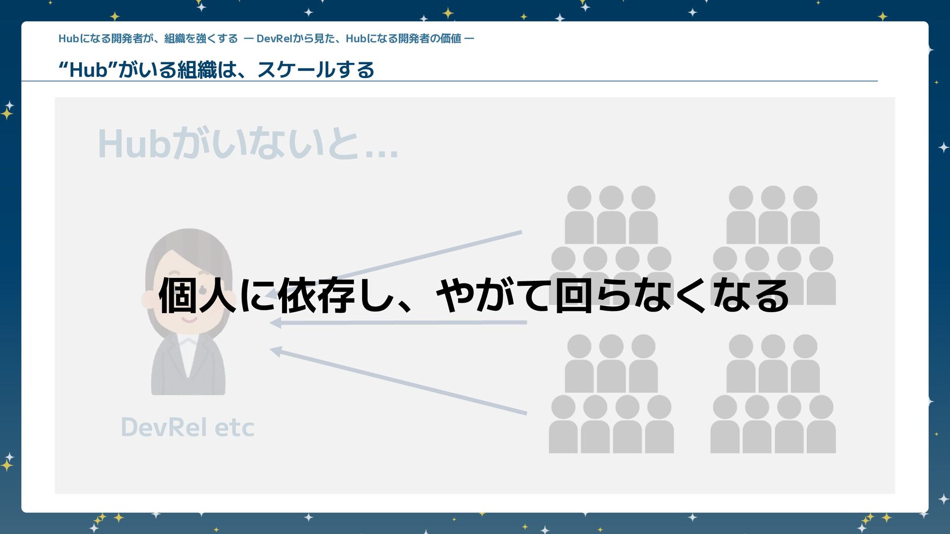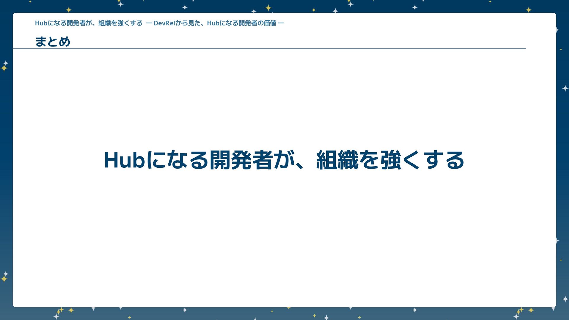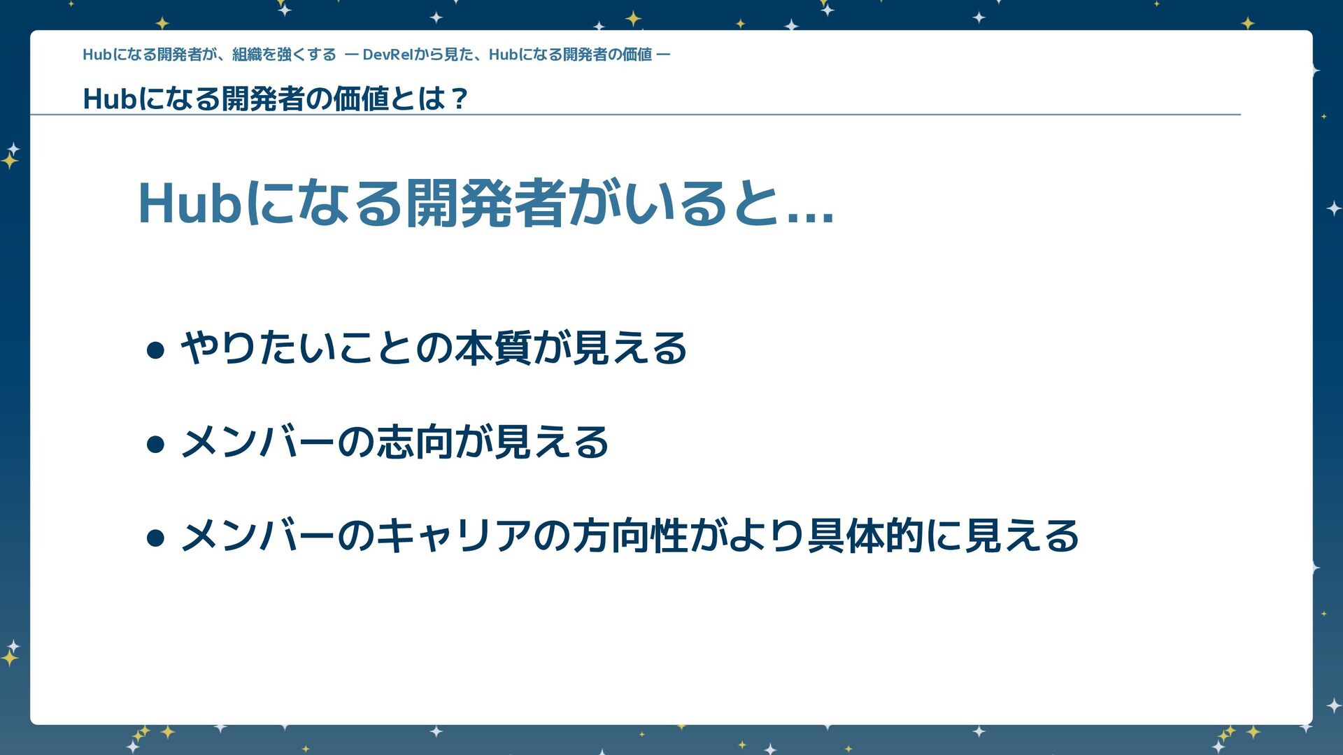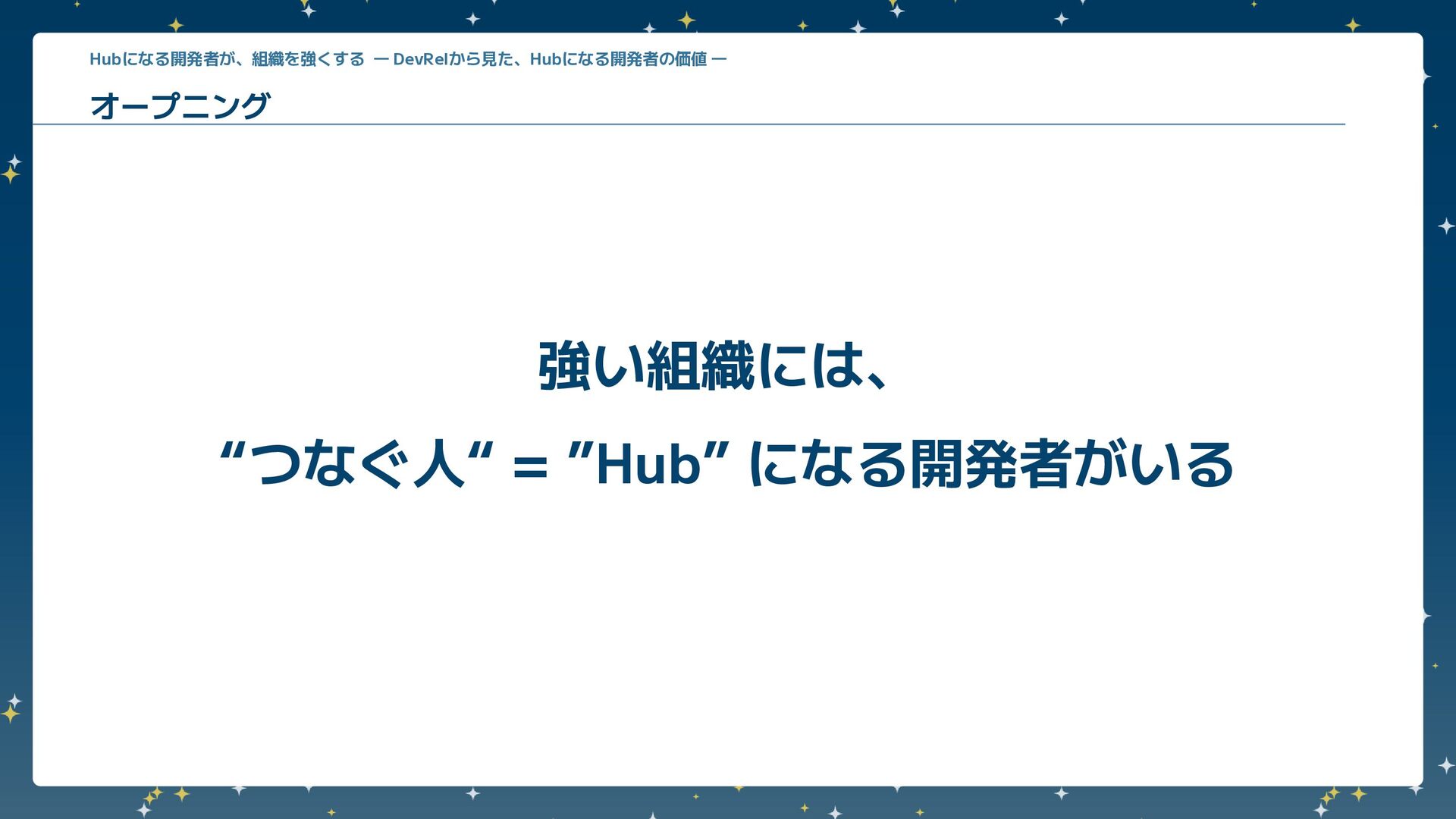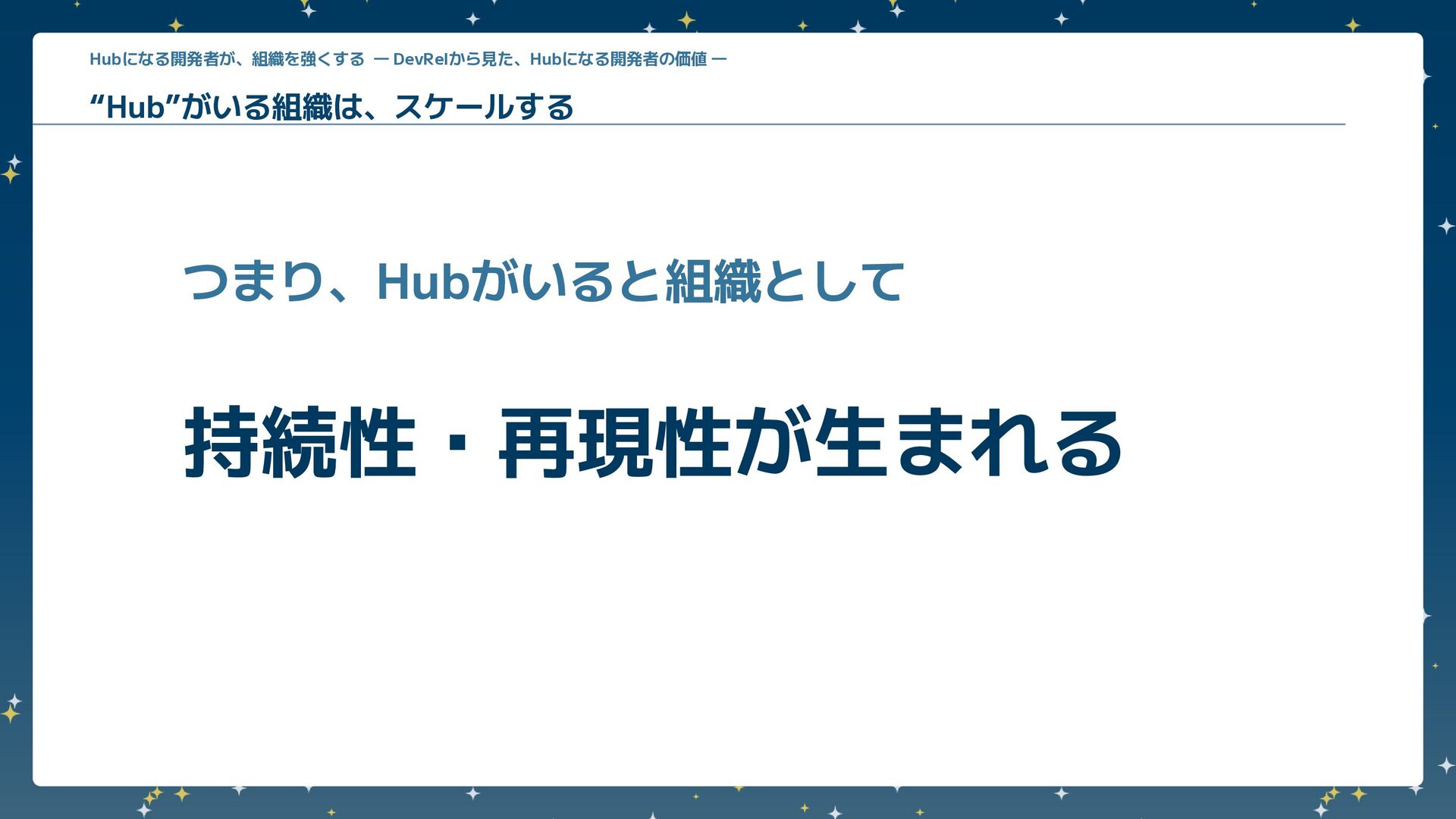 本スライドは、DevRelの視点からHubになる開発者の価値と組織としての強さを語ります。