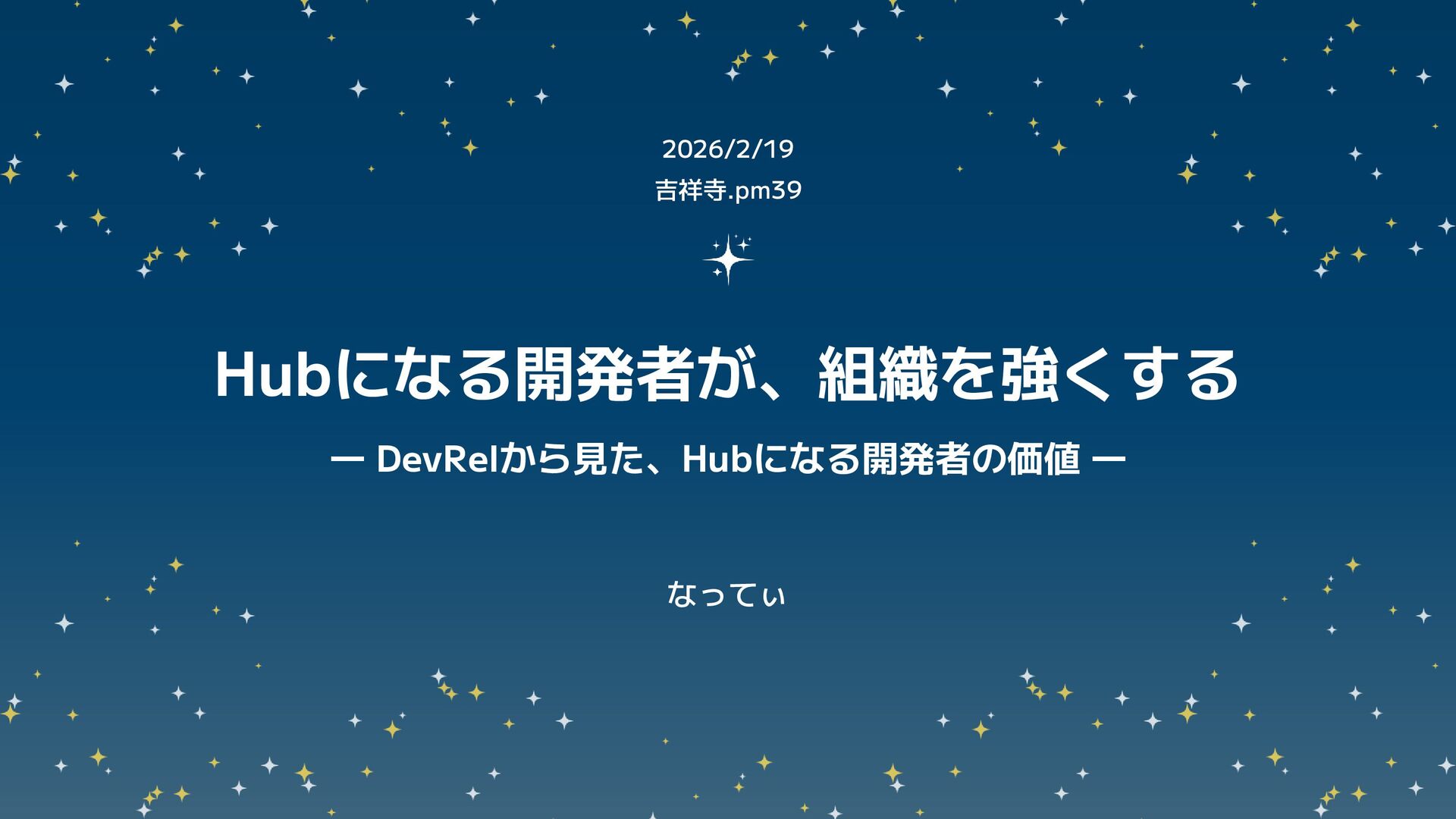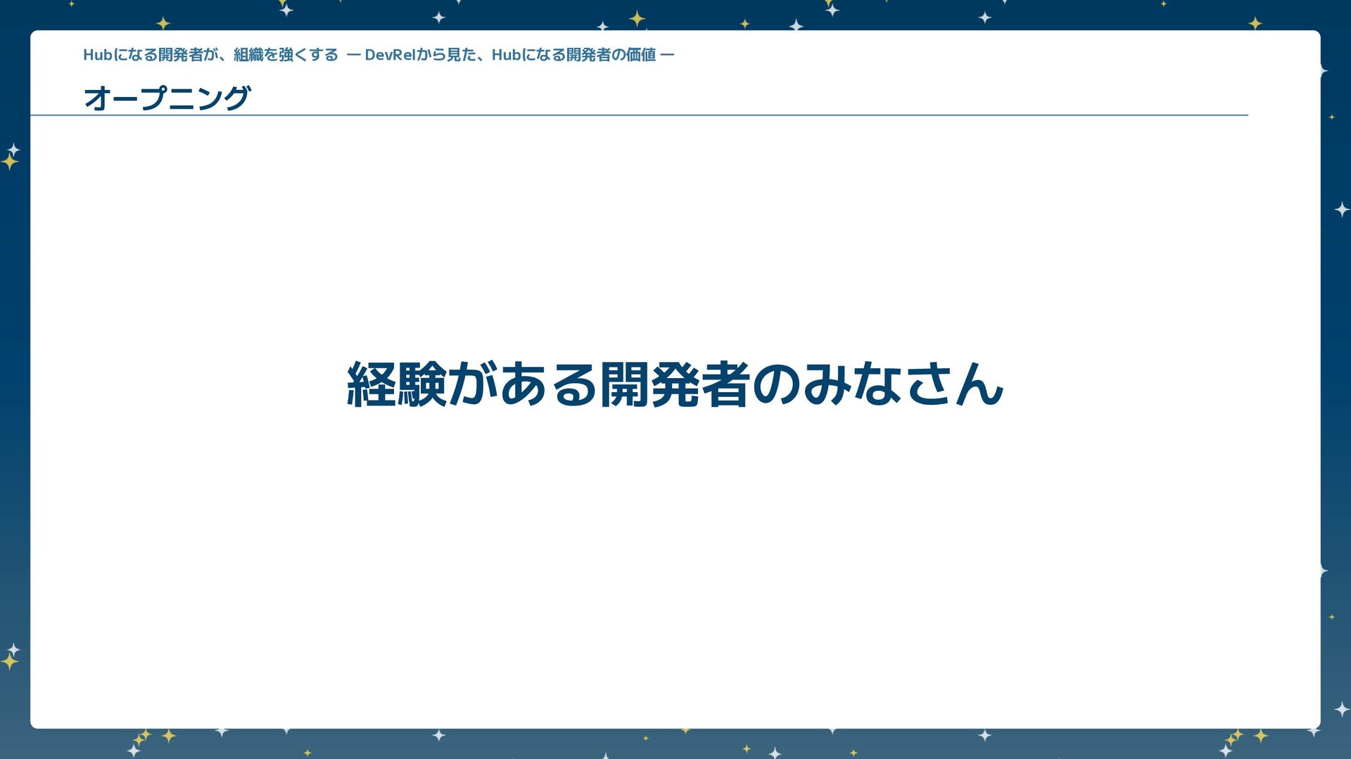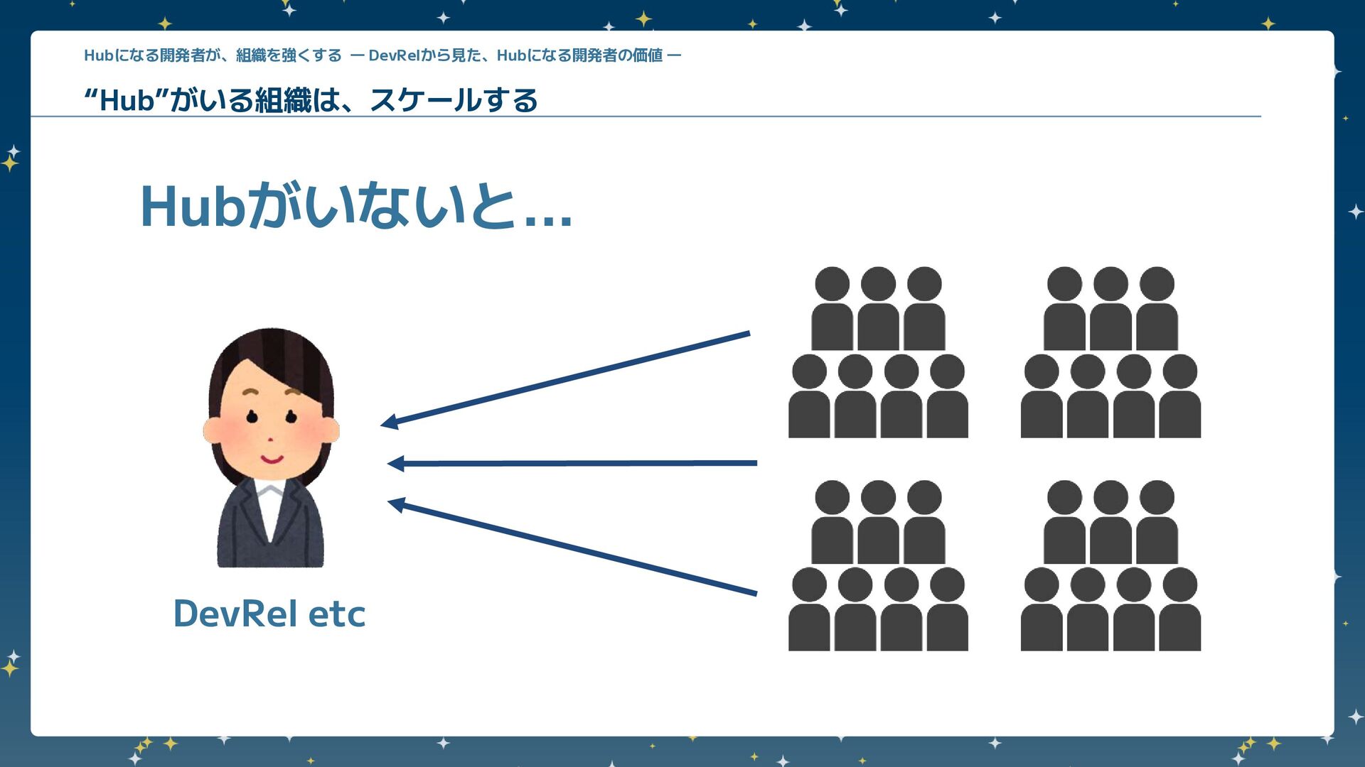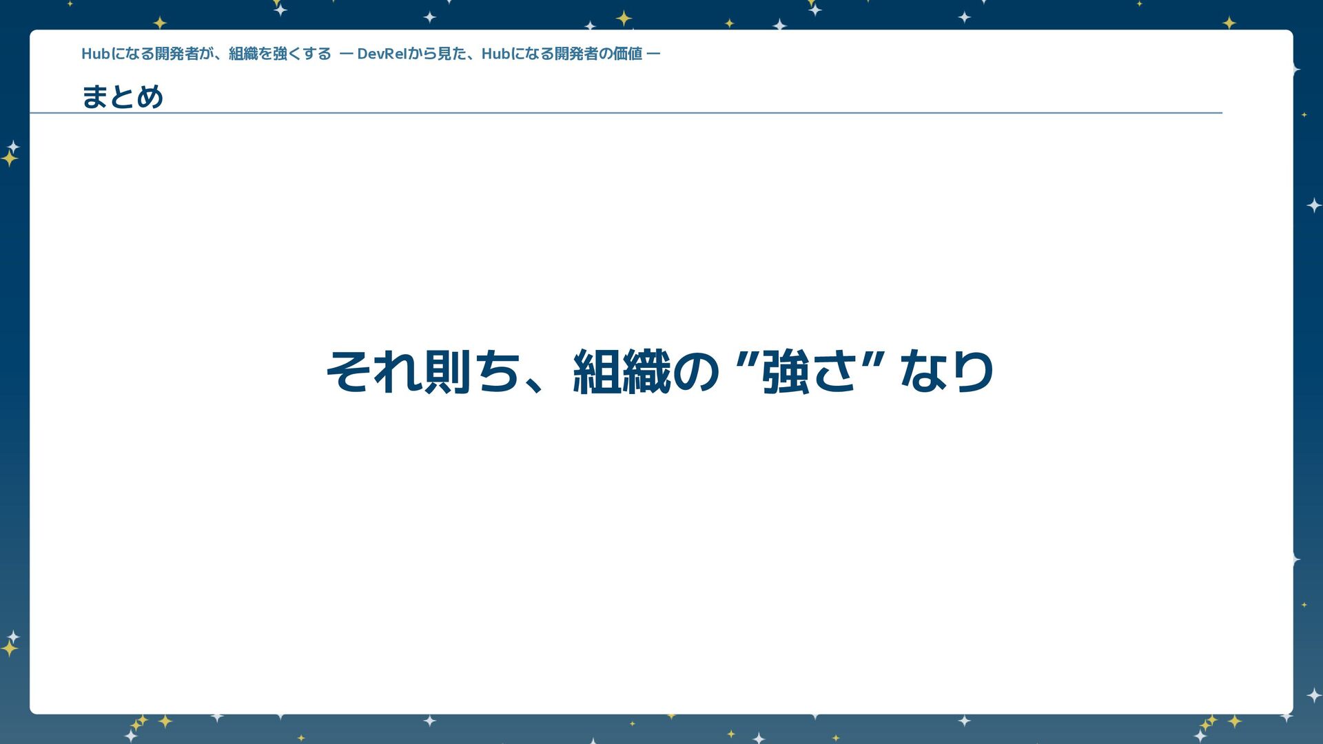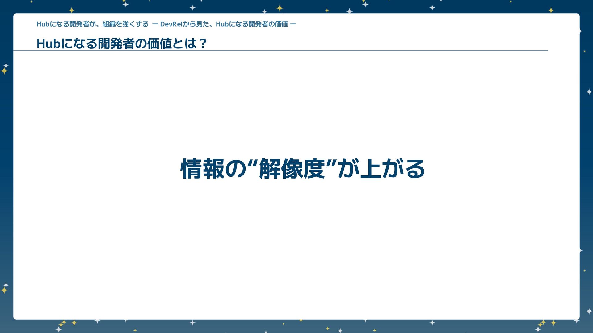 本スライドは、DevRelの視点からHubになる開発者の価値と組織としての強さを語ります。