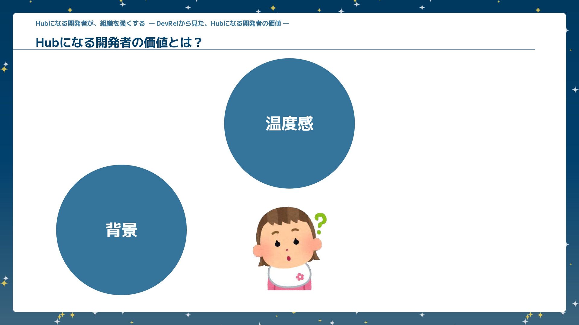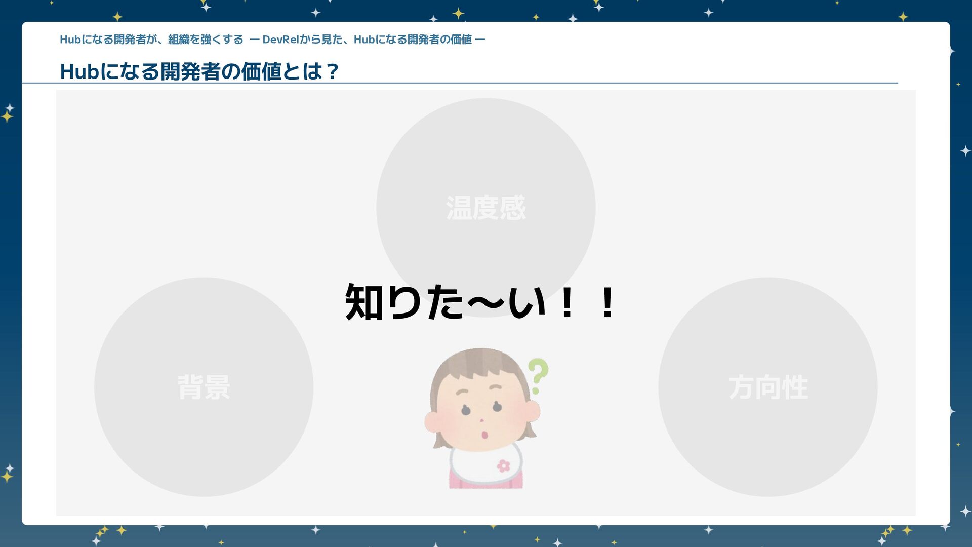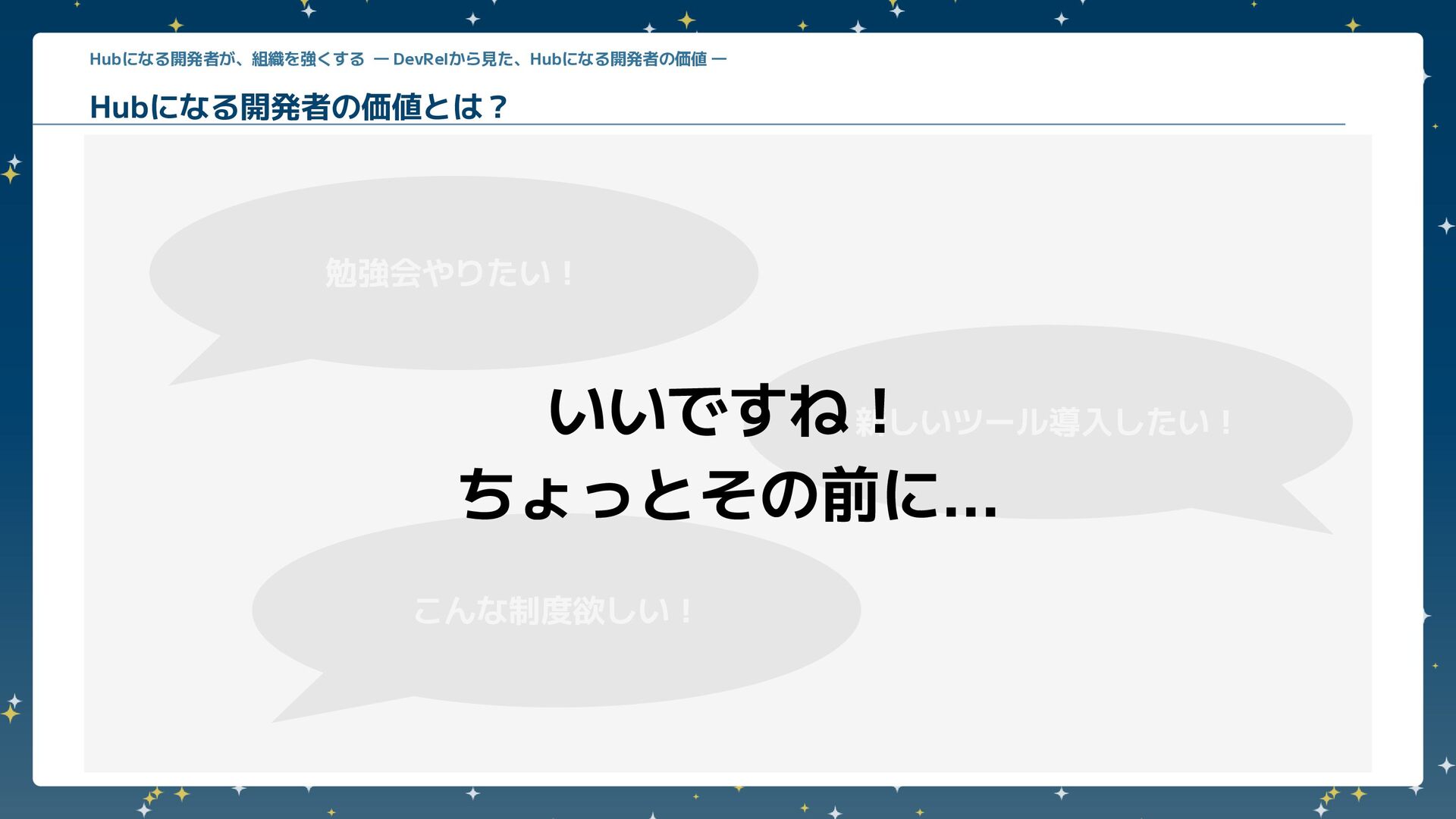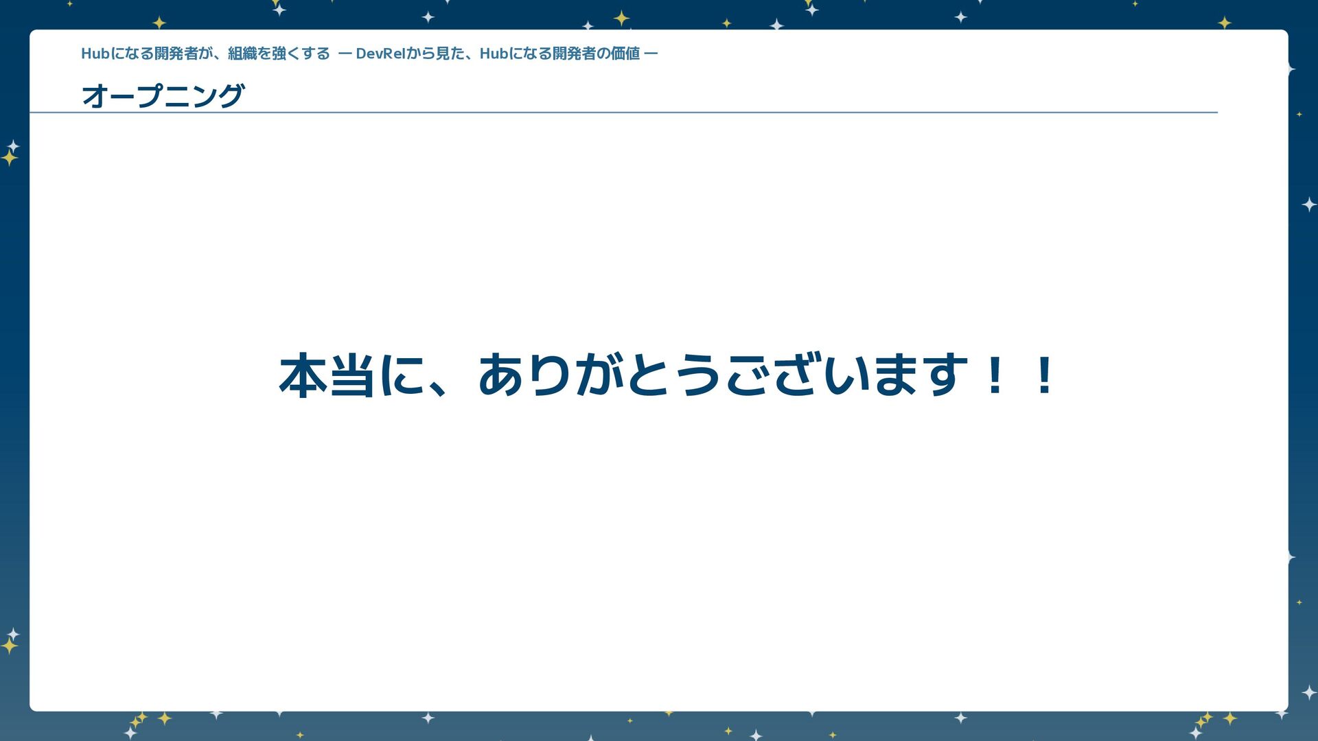 本スライドは、DevRelの視点からHubになる開発者の価値と組織としての強さを語ります。