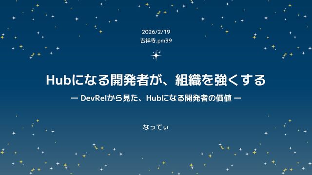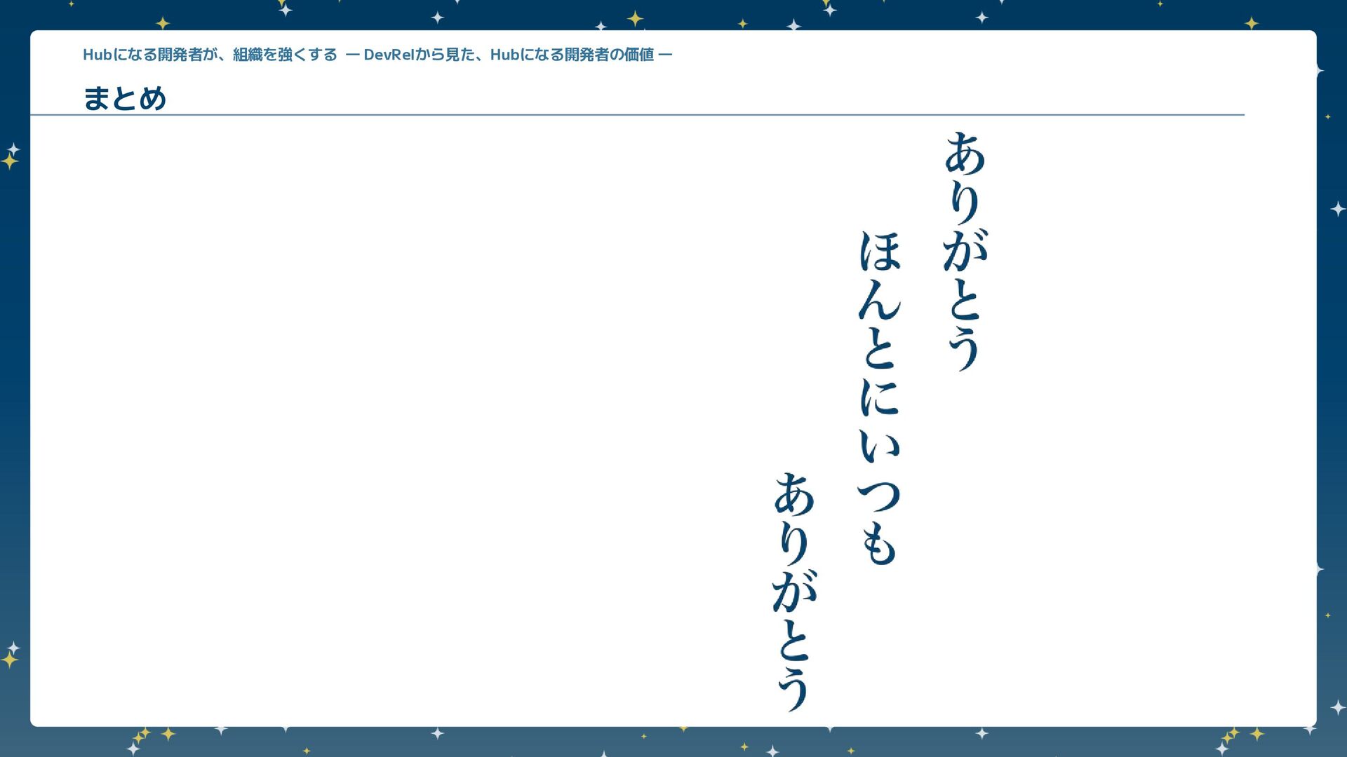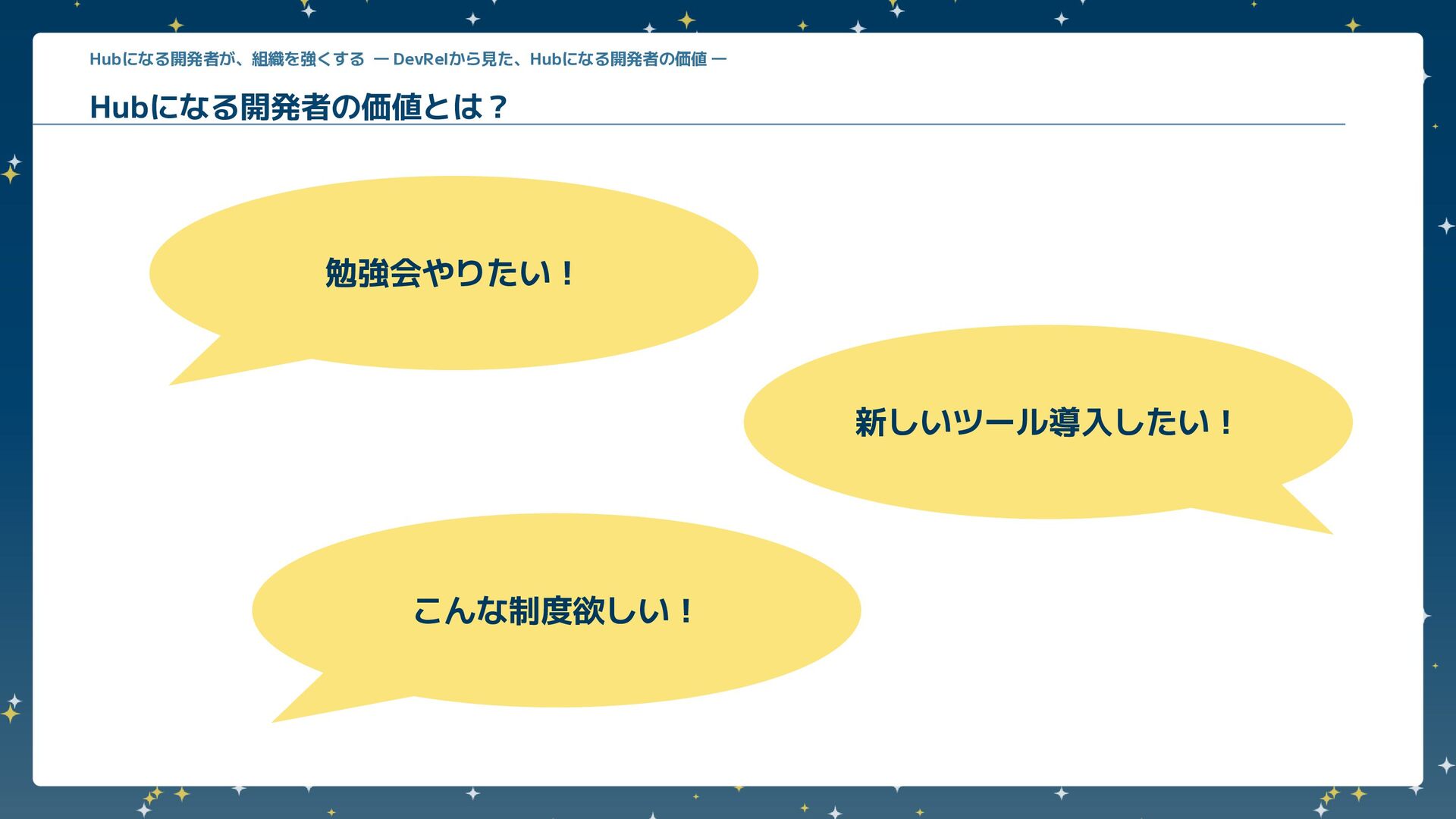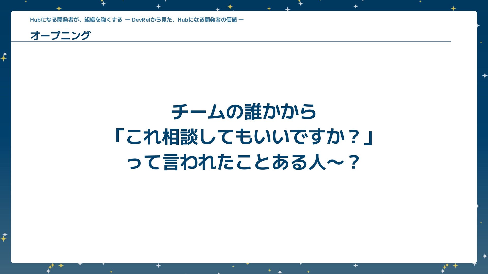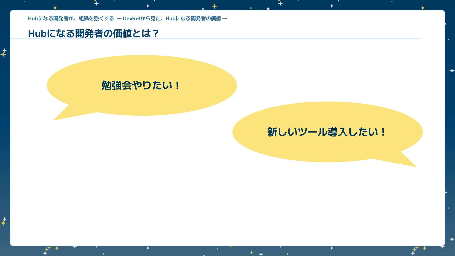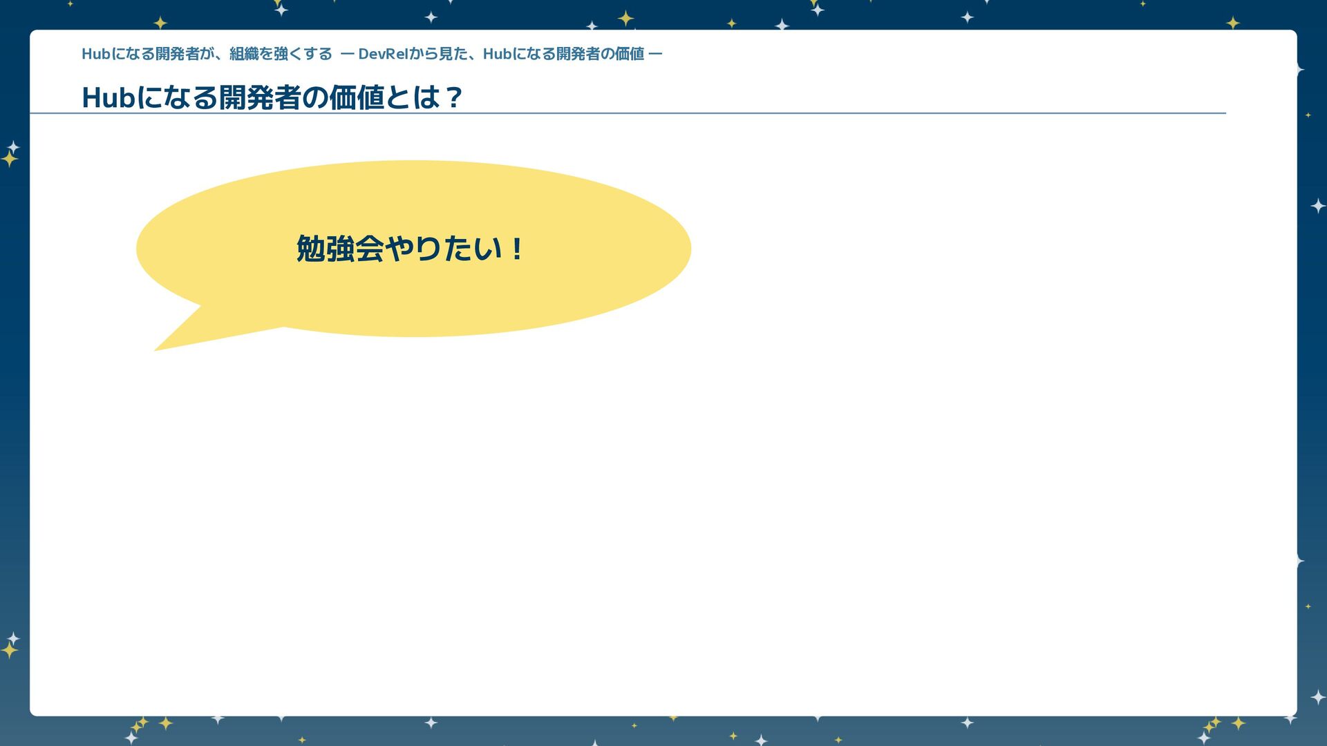 本スライドは、DevRelの視点からHubになる開発者の価値と組織としての強さを語ります。