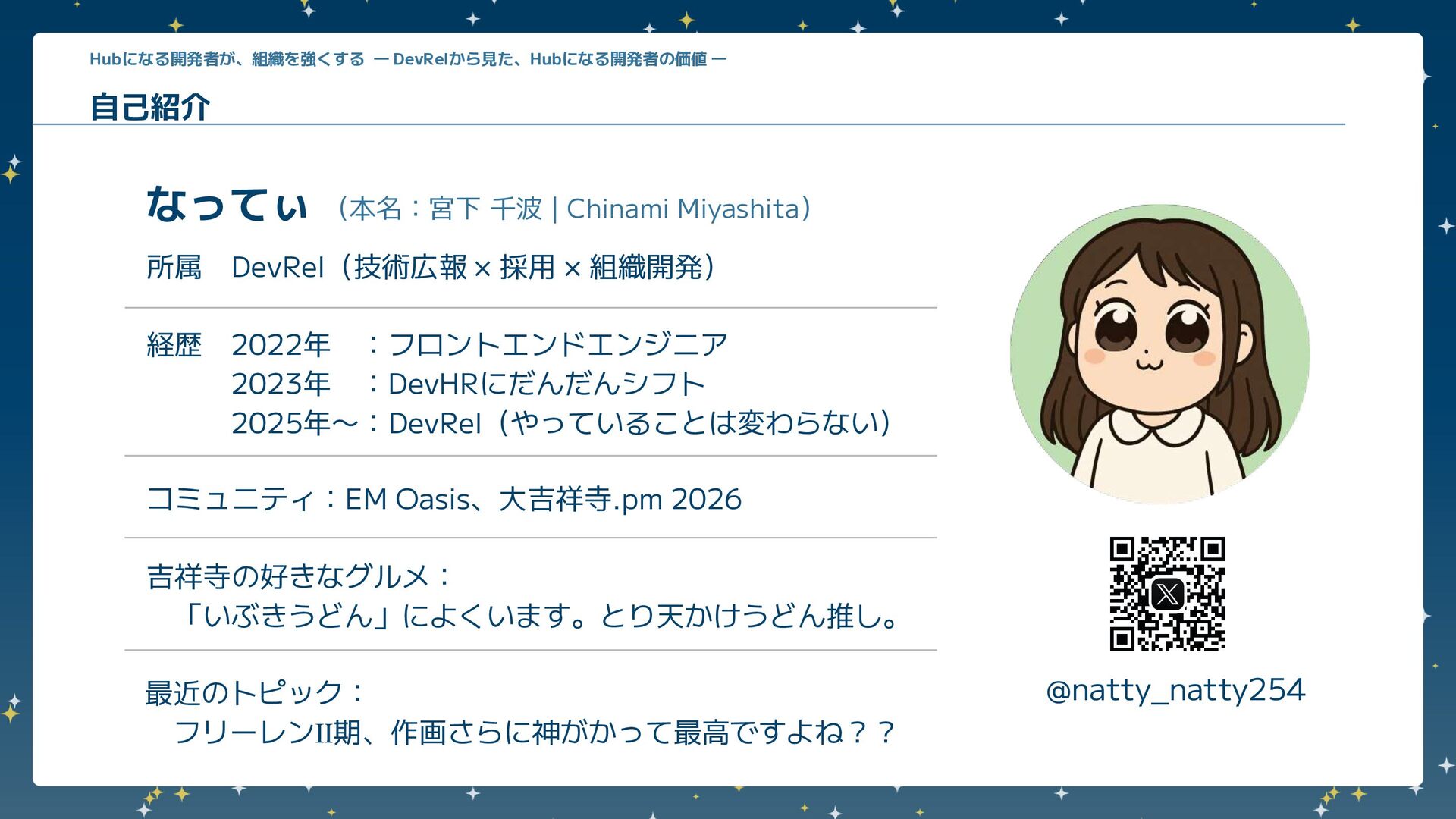 2023年 :DevHRにだんだんシフト 2025年〜:DevRel(やっていることは変わらない) @natty_natty254 所属 DevRel(技術広報 × 採用 × 組織開発) 最近のトピック: フリーレンⅡ期、作画さらに神がかって最高ですよね?? 吉祥寺の好きなグルメ: 「いぶきうどん」によくいます。とり天かけうどん推し。 Hubになる開発者が、組織を強くする ― DevRelから見た、Hubになる開発者の価値 ― コミュニティ:EM Oasis、大吉祥寺.pm 2026