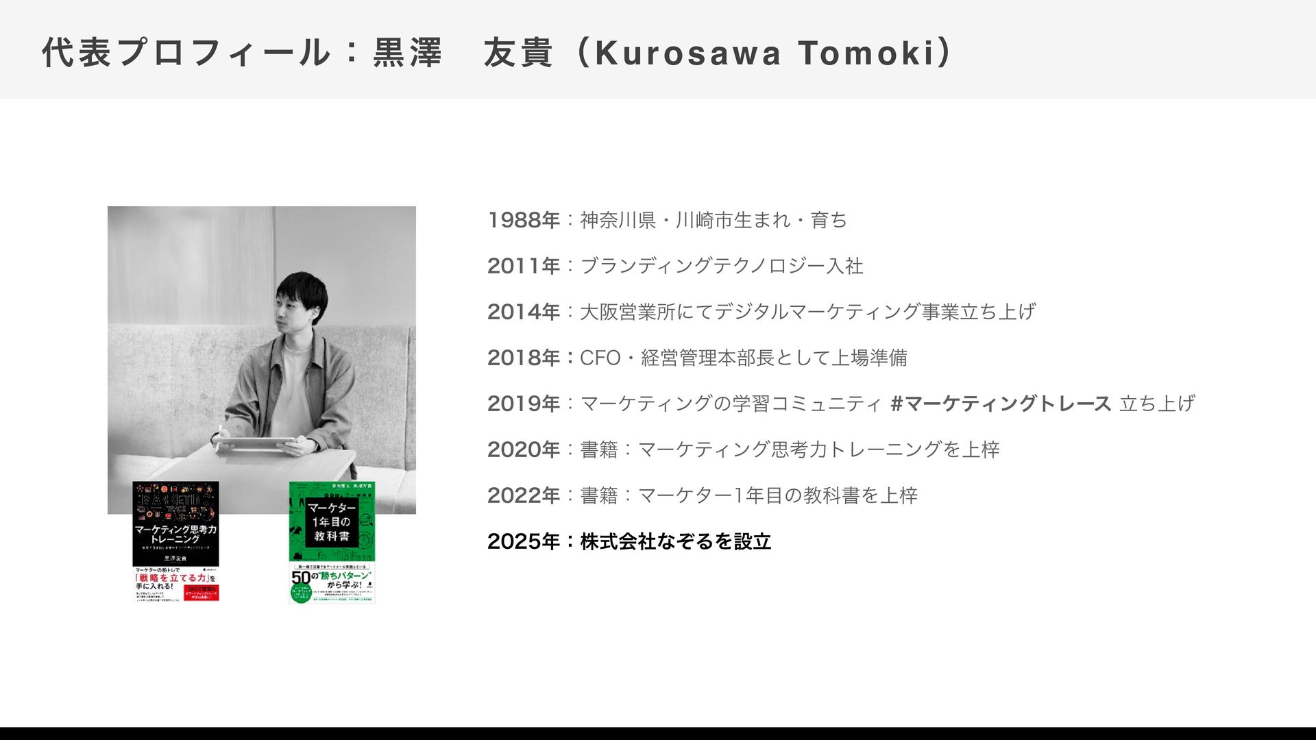 දϓϩϑΟʔϧɿࠇᖒɹ༑وʢKurosawa Tomokiʣ ɿਆಸݝɾ࡚ࢢੜ·Εɾҭͪ ɿϒϥϯσΟϯάςΫϊϩδʔೖࣾ ɿେࡕӦۀॴʹͯσδλϧϚʔέςΟϯάࣄۀ্ཱͪ͛ ɿ$'0ɾܦӦཧຊ෦ͱ্ͯ͠४උ ɿϚʔέςΟϯάͷֶशίϛϡχςΟϚʔέςΟϯάτϨʔε্ཱͪ͛ ɿॻ੶ɿϚʔέςΟϯάࢥߟྗτϨʔχϯάΛ্Ѹ ɿॻ੶ɿϚʔέλʔͷڭՊॻΛ্Ѹ ɿגࣜձࣾͳͧΔΛઃཱ