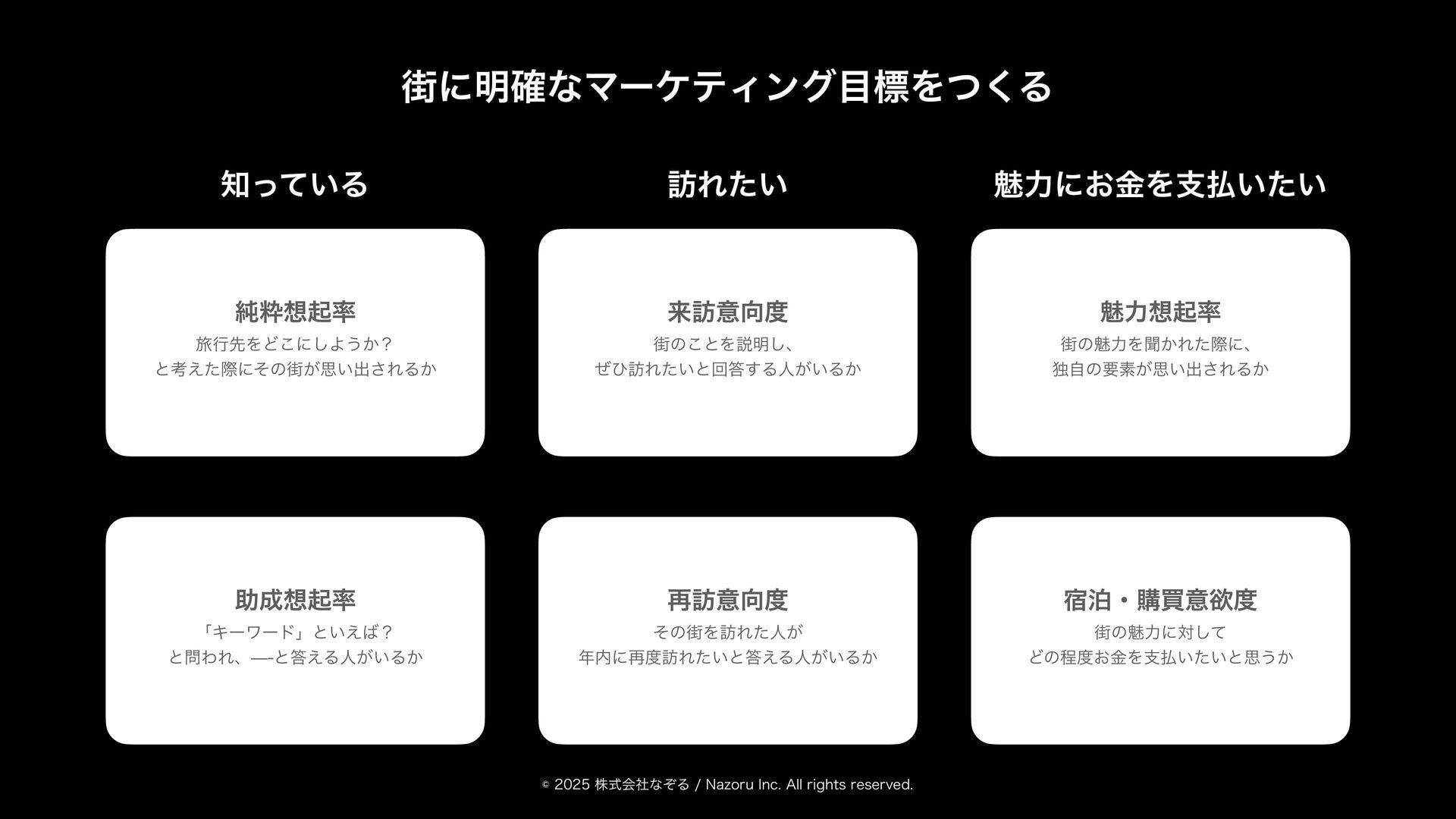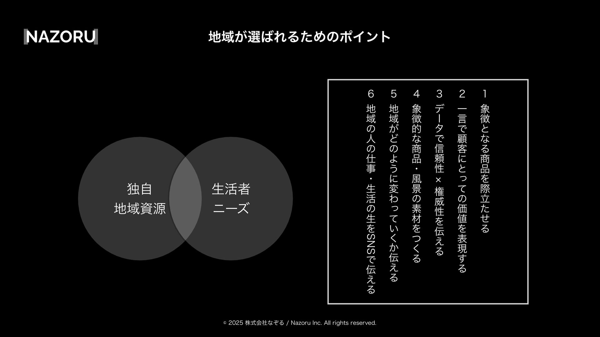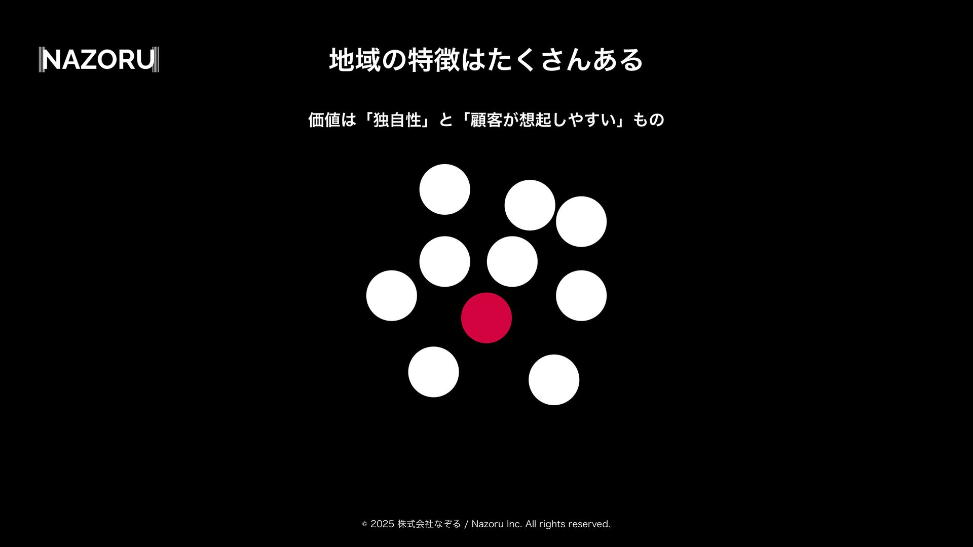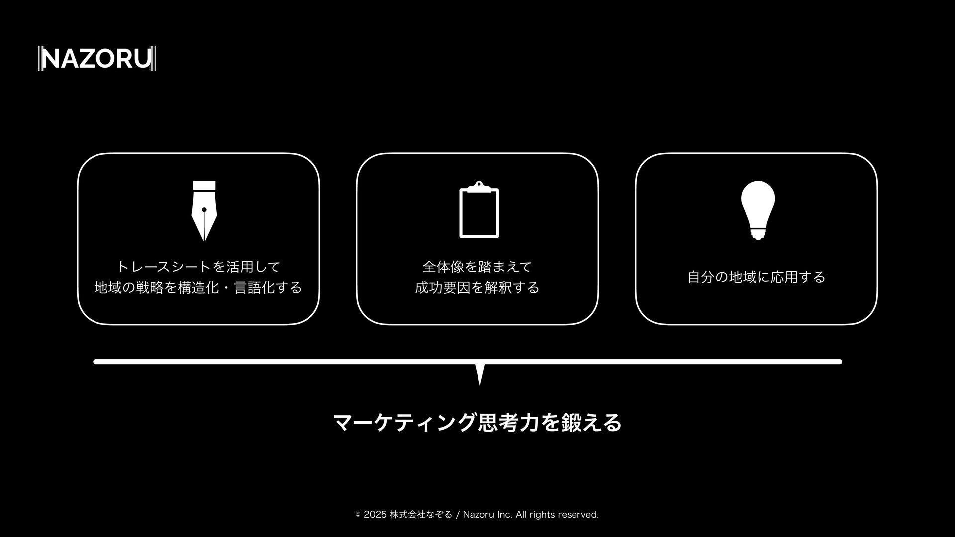 גࣜձࣾͳͧΔ/B[PSV*OD"MMSJHIUTSFTFSWFE ϚʔέςΟϯάࢥߟྗΛ͑Δ τϨʔεγʔτΛ׆༻ͯ͠ ҬͷઓུΛߏԽɾݴޠԽ͢Δ શମ૾Λ౿·͑ͯ ޭཁҼΛղऍ͢Δ ࣗͷҬʹԠ༻͢Δ