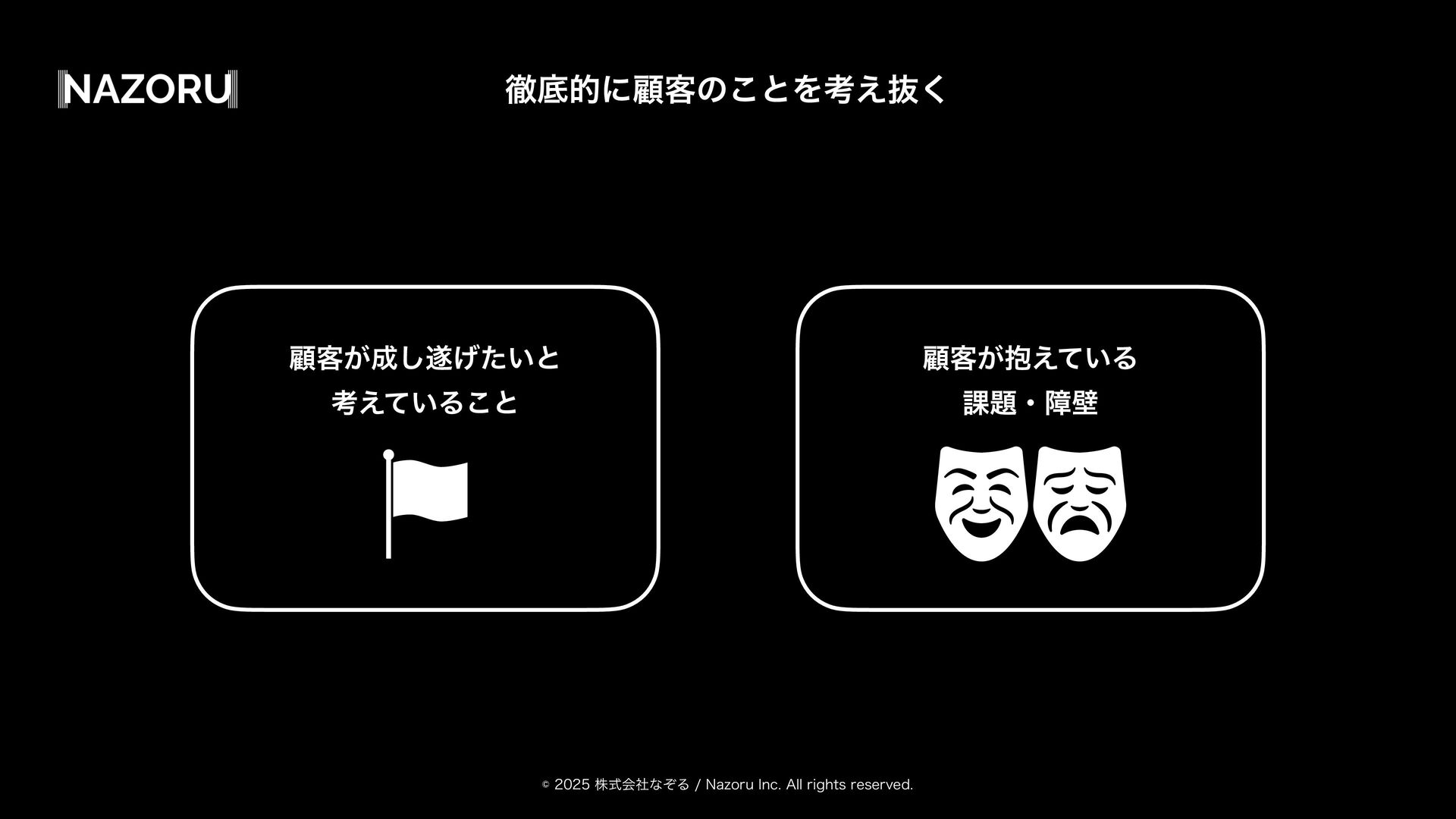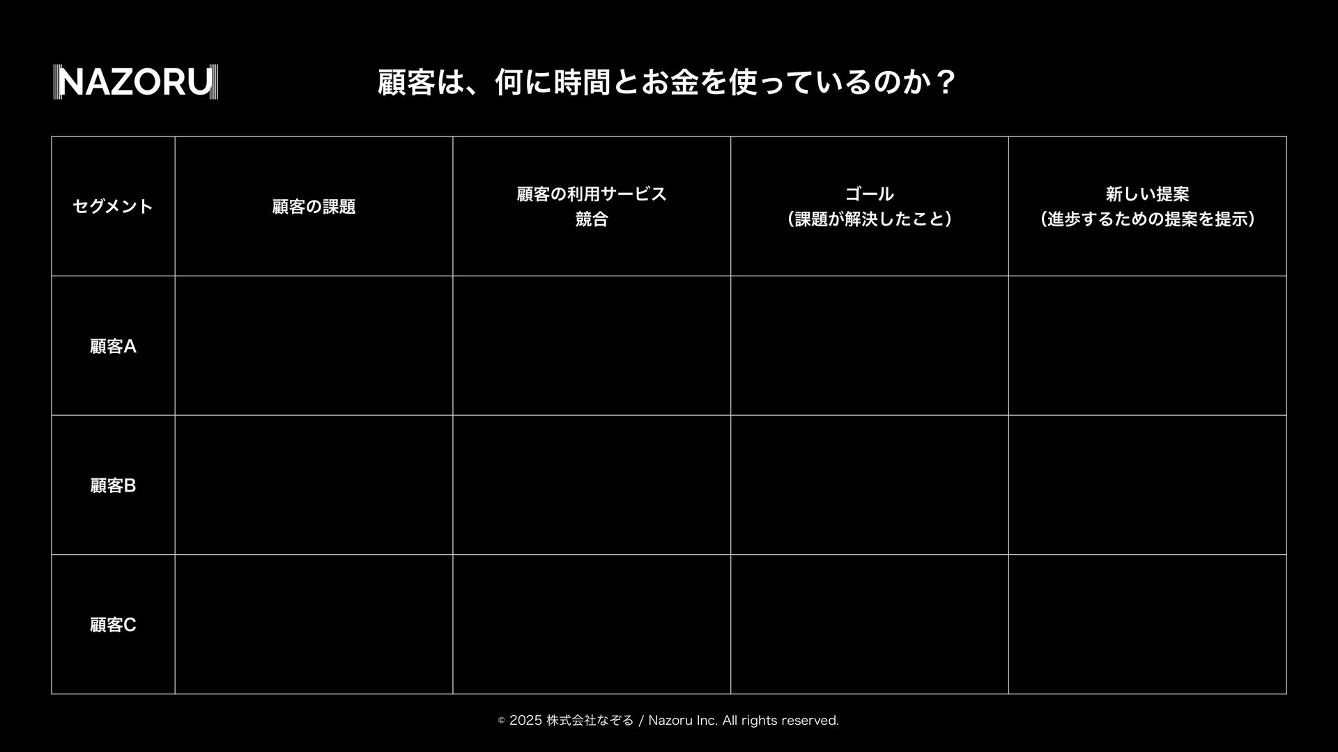 גࣜձࣾͳͧΔ/B[PSV*OD"MMSJHIUTSFTFSWFE ηάϝϯτ ސ٬ͷ՝ ސ٬ͷར༻αʔϏε ڝ߹ ΰʔϧ ʢ՝͕ղܾͨ͜͠ͱʣ ৽͍͠ఏҊ ʢਐา͢ΔͨΊͷఏҊΛఏࣔʣ ސ٬"