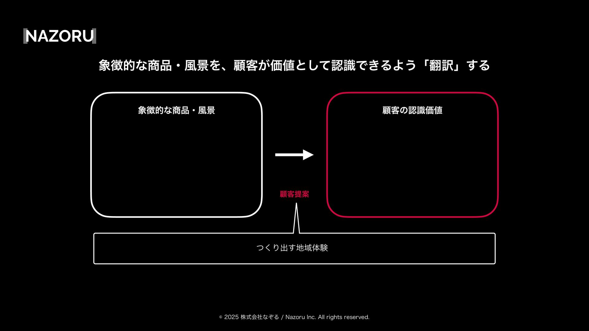 גࣜձࣾͳͧΔ/B[PSV*OD"MMSJHIUTSFTFSWFE తͳɾ෩ܠΛɺސ٬͕Ձͱͯ͠ೝࣝͰ͖ΔΑ͏ʮ༁ʯ͢Δ ސ٬ఏҊ తͳɾ෩ܠ ͭ͘Γग़͢Ҭମݧ ސ٬ͷೝࣝՁ
