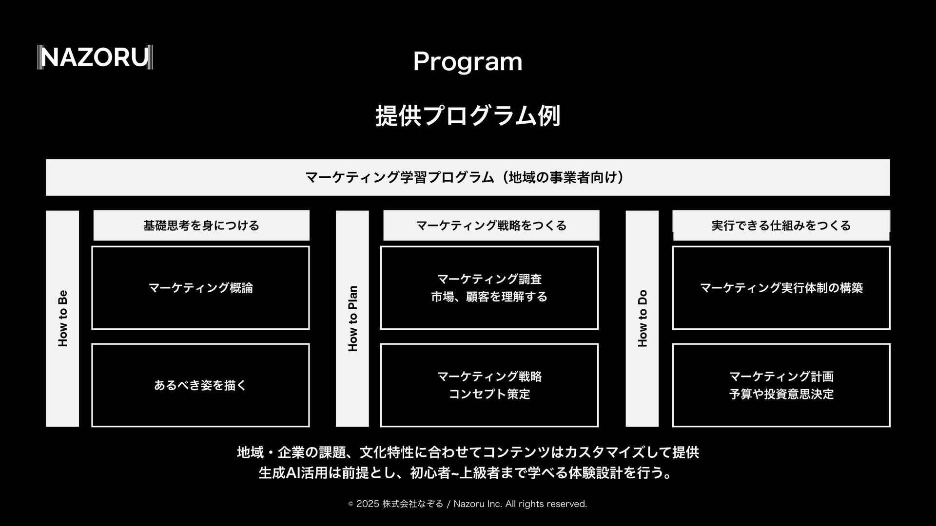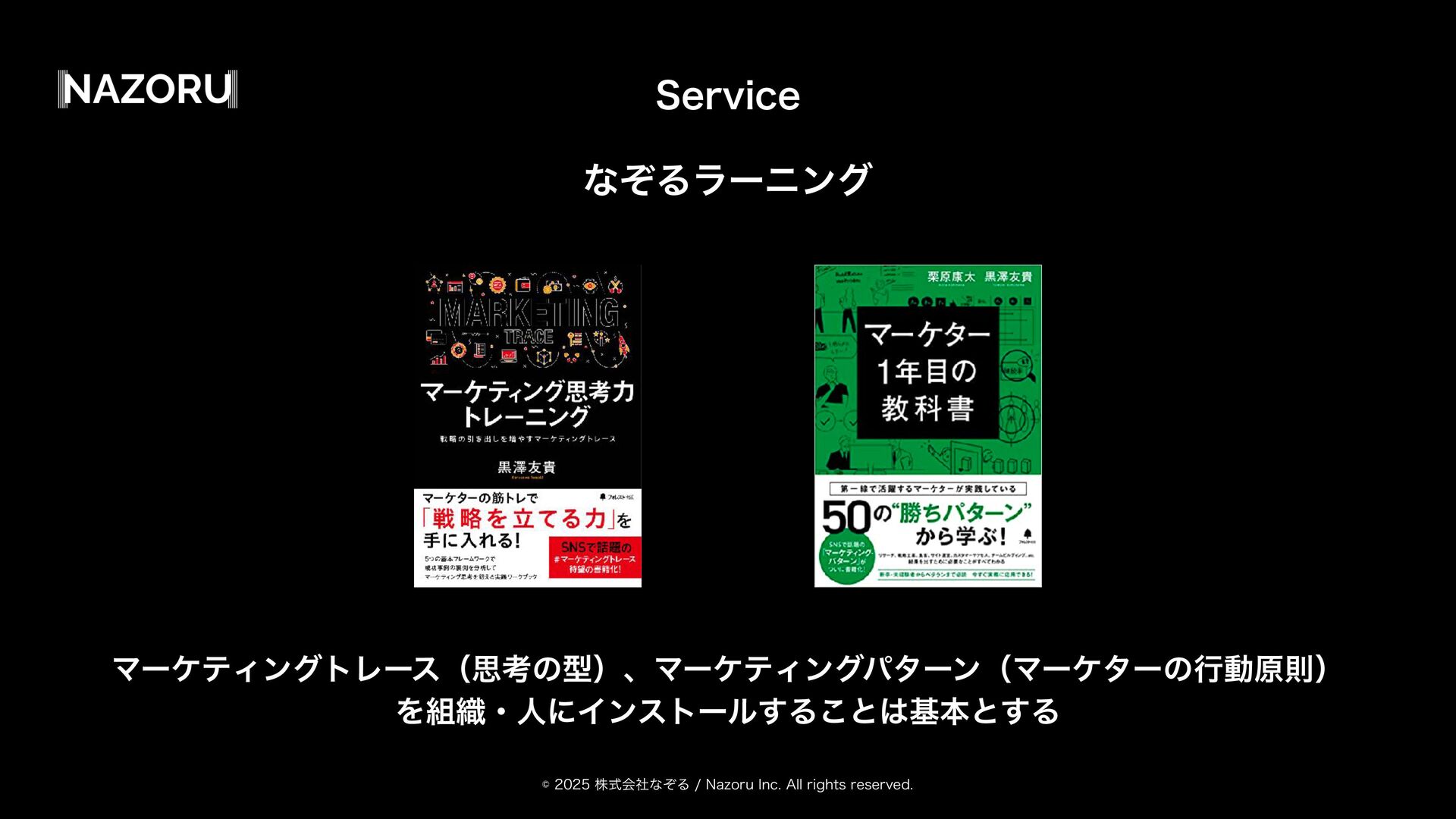 גࣜձࣾͳͧΔ/B[PSV*OD"MMSJHIUTSFTFSWFE 4FSWJDF ͳͧΔϥʔχϯά ϚʔέςΟϯάτϨʔεʢࢥߟͷܕʣɺϚʔέςΟϯάύλʔϯʢϚʔέλʔͷߦಈݪଇʣ Λ৫ɾਓʹΠϯετʔϧ͢Δ͜ͱجຊͱ͢Δ