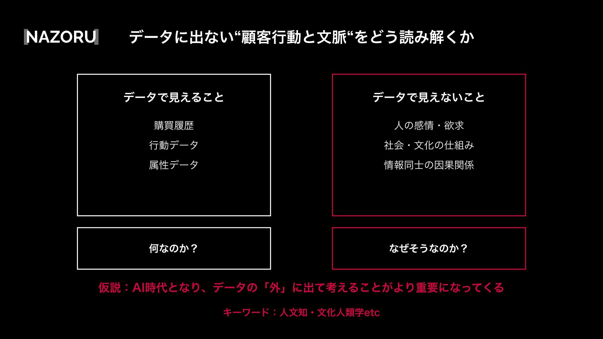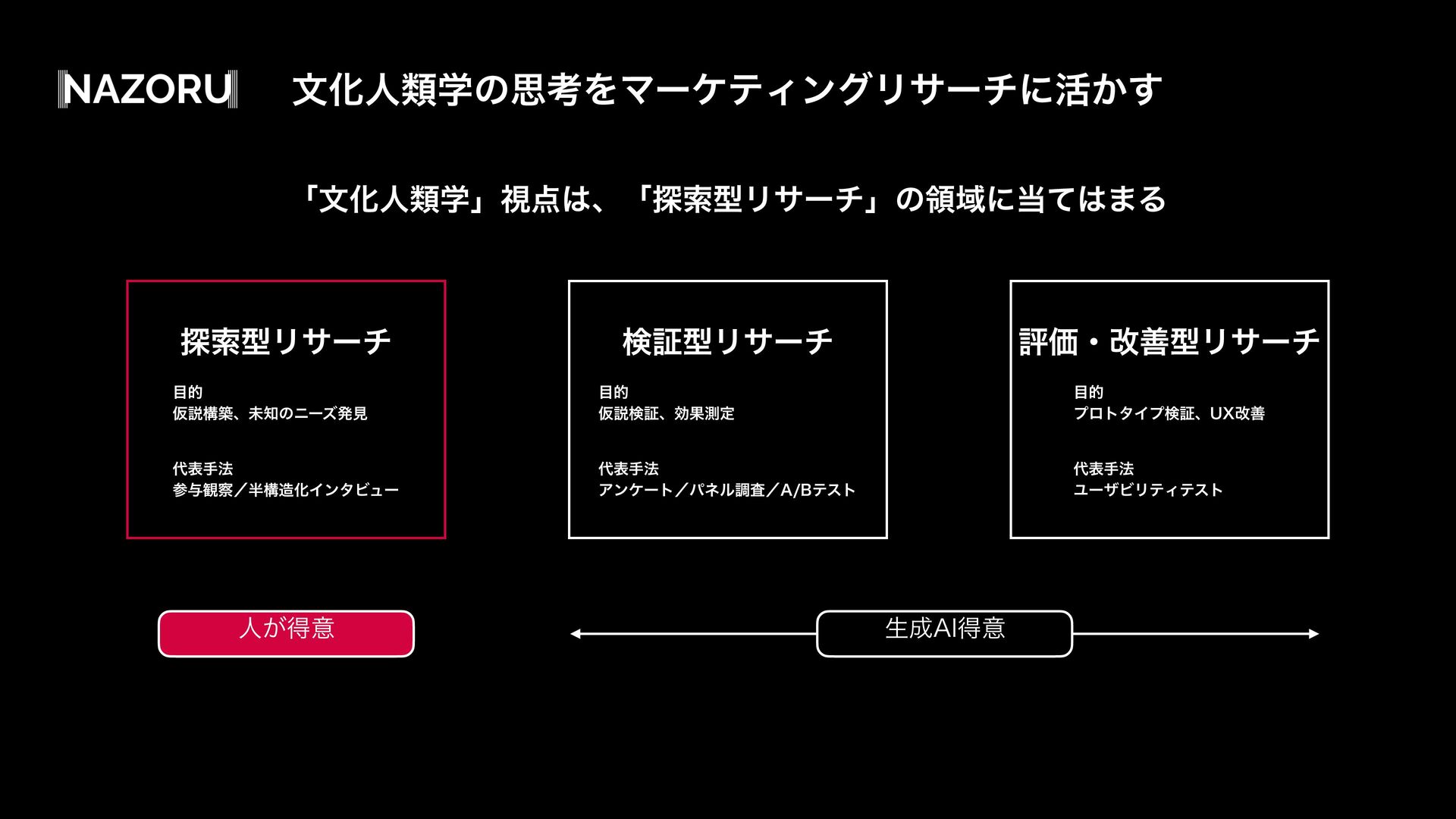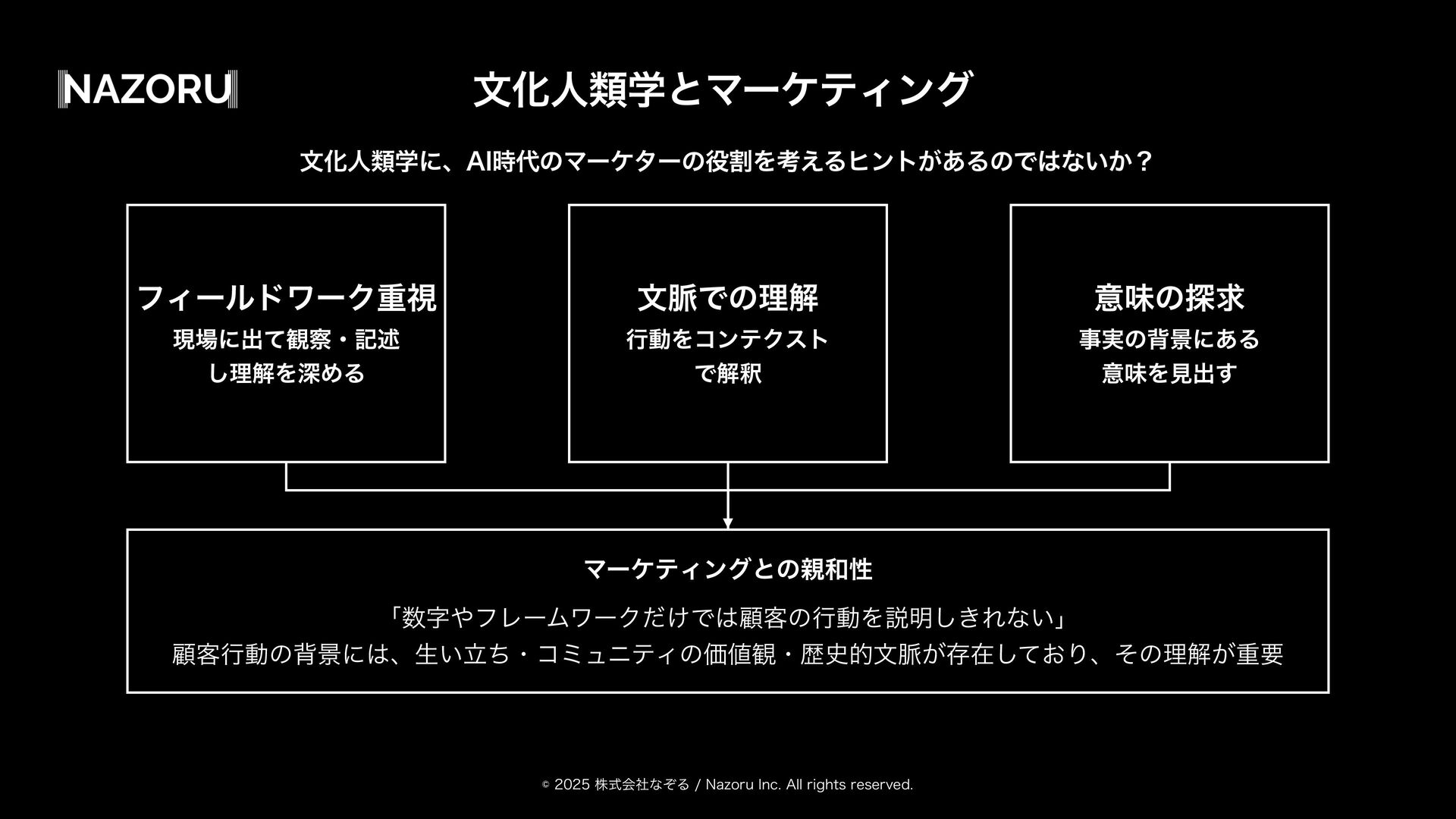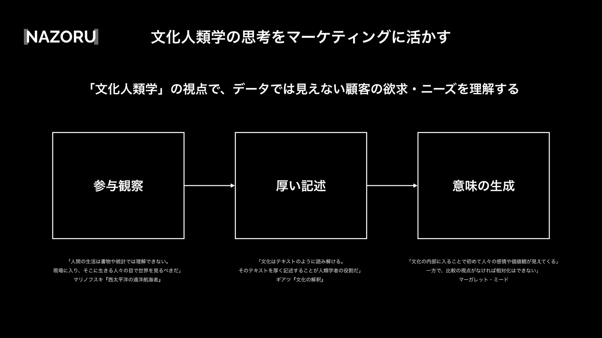 本資料では、文化人類学の「参与観察」「厚い記述」「意味の生成」という手法をマーケティングリサーチに応用する方法を提案しています。特に探索型リサーチの領域において、現場に出て1次情報を収集し、データの「外」に出て考えることの重要性が増しています。