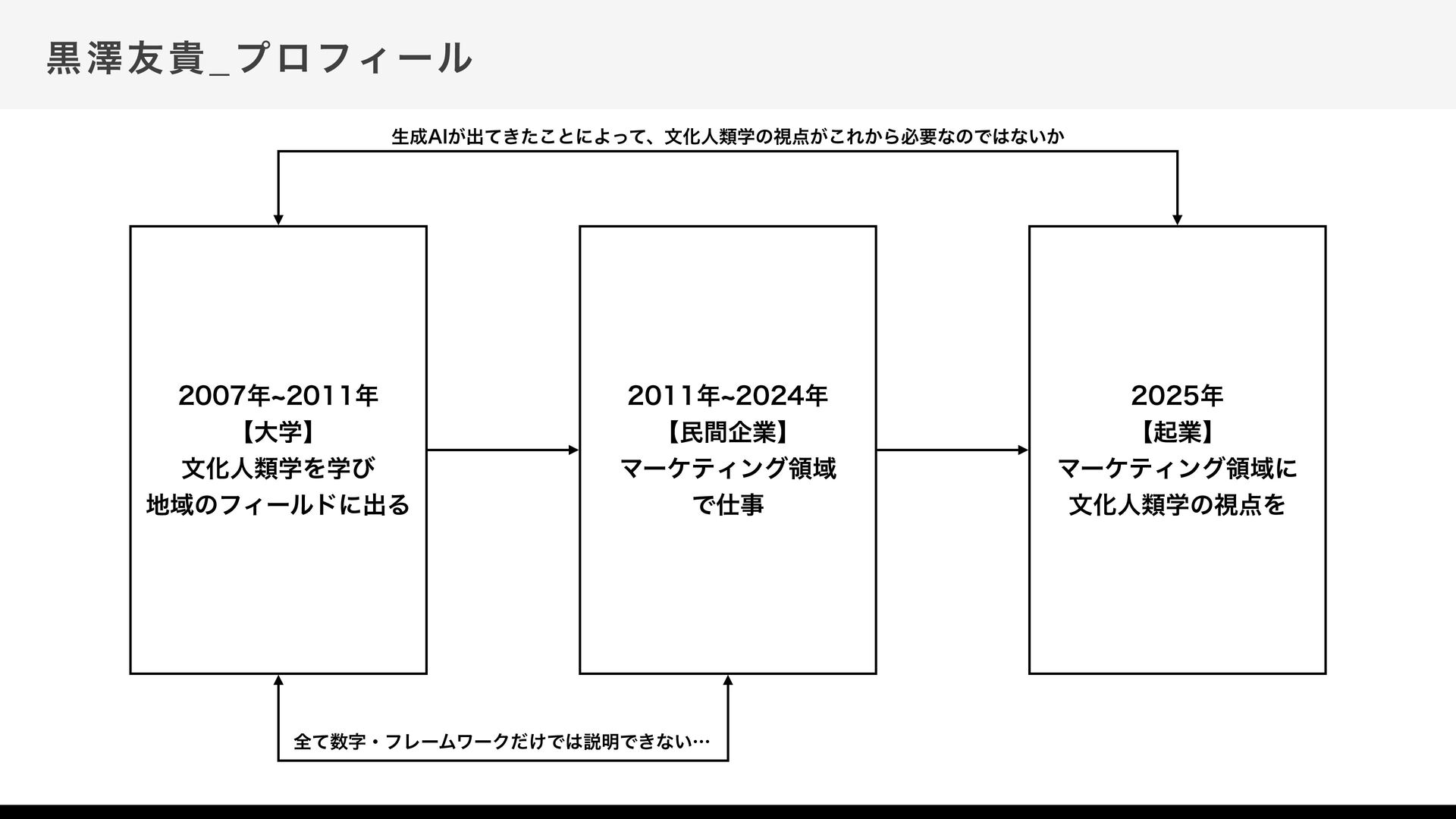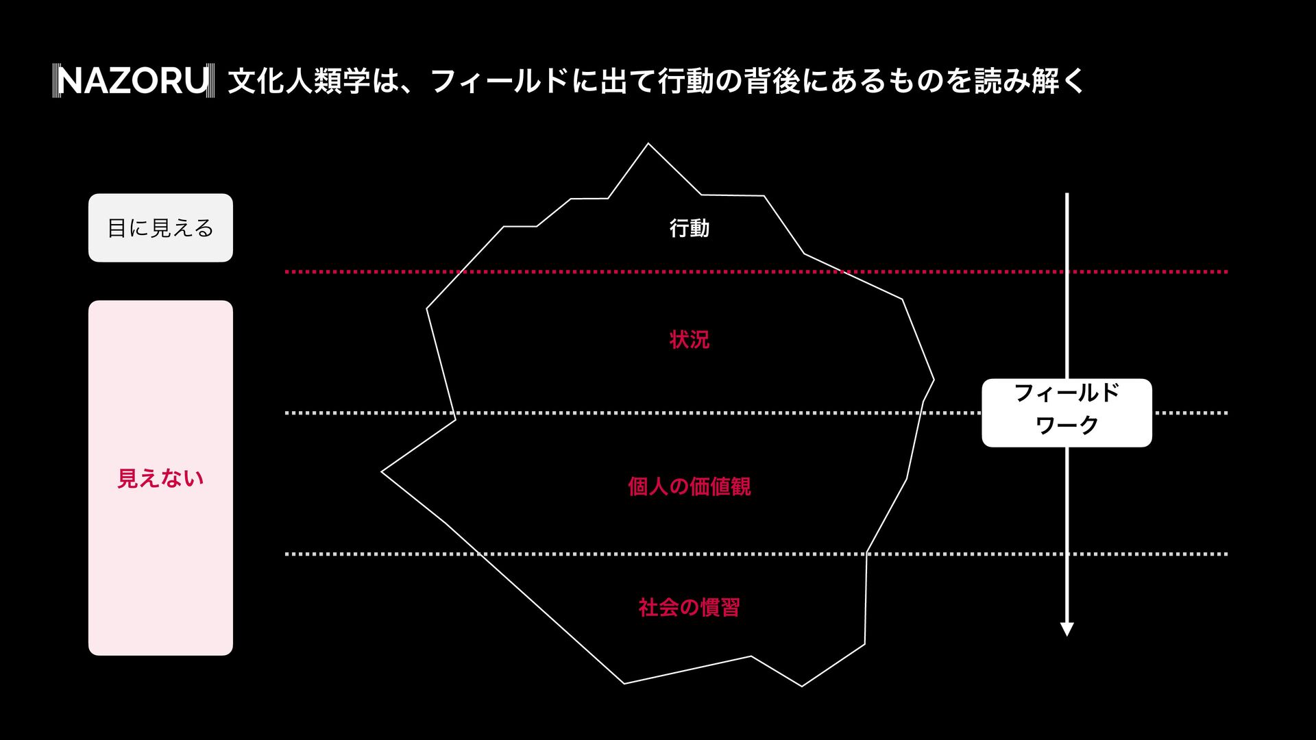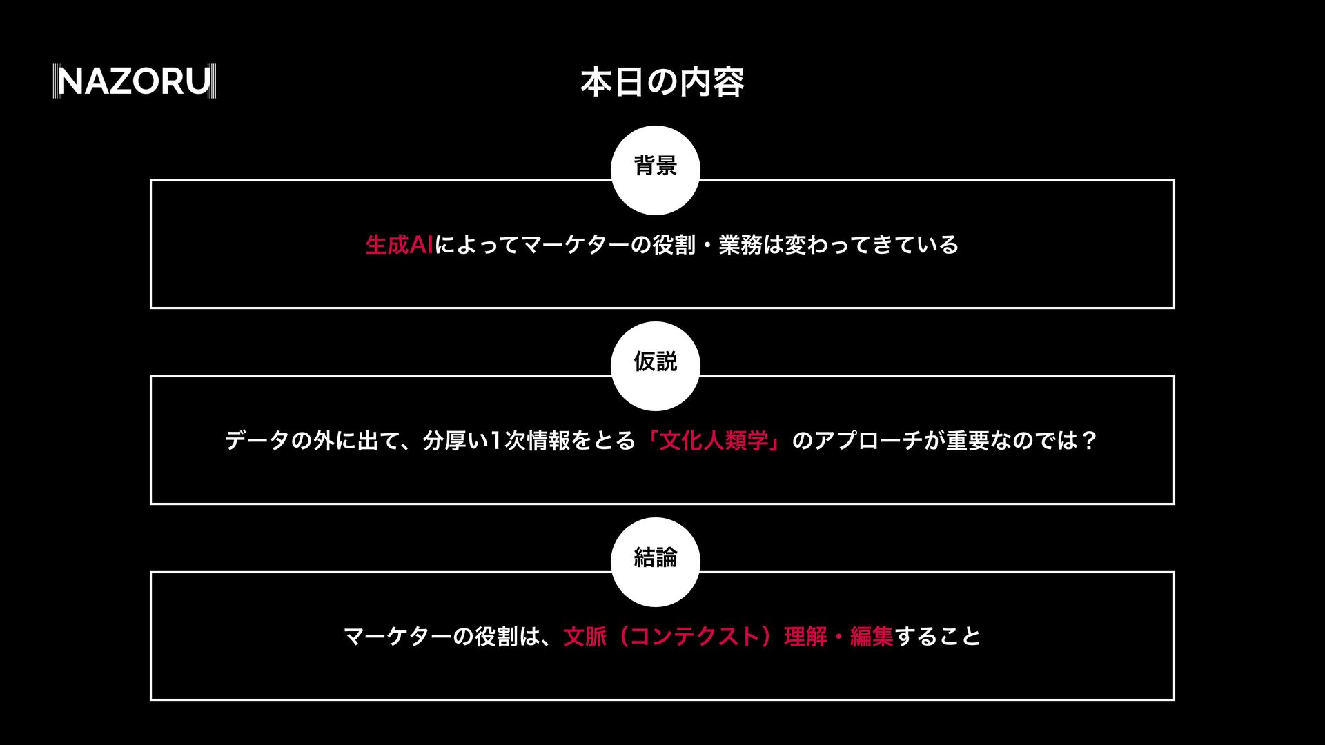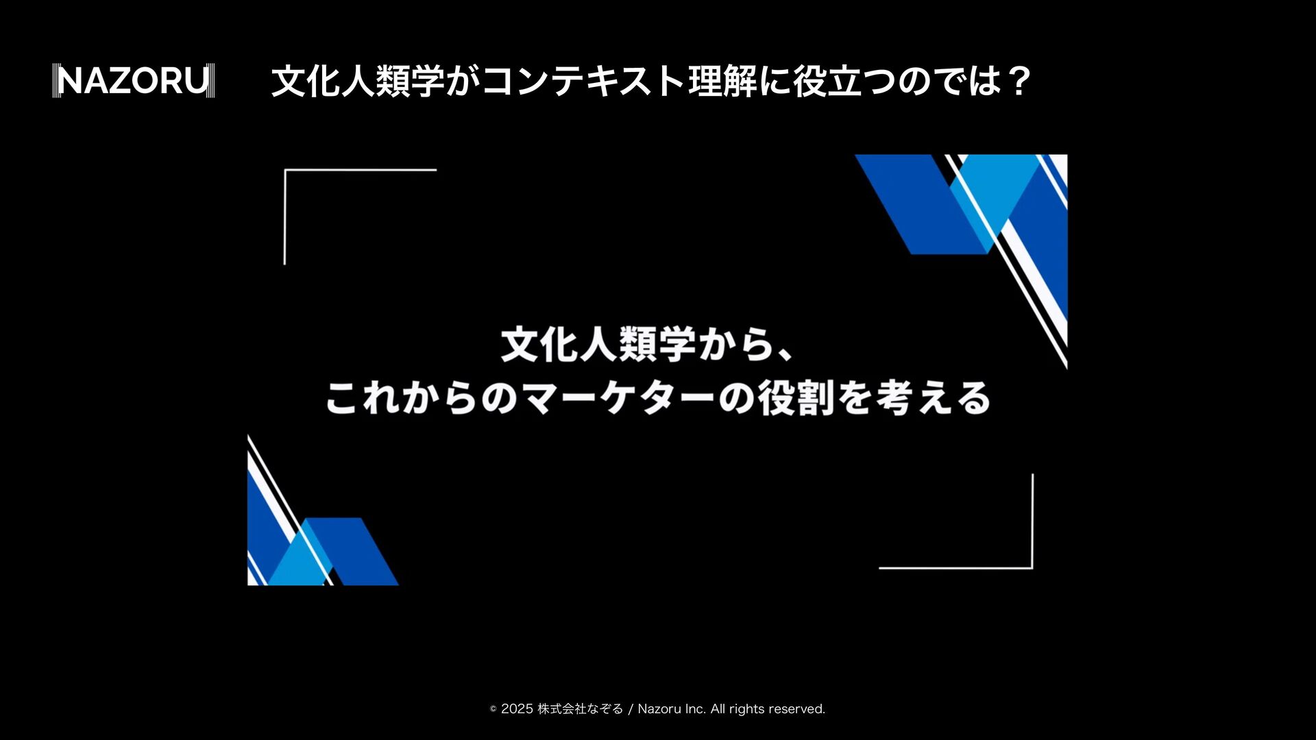 本資料では、文化人類学の「参与観察」「厚い記述」「意味の生成」という手法をマーケティングリサーチに応用する方法を提案しています。特に探索型リサーチの領域において、現場に出て1次情報を収集し、データの「外」に出て考えることの重要性が増しています。