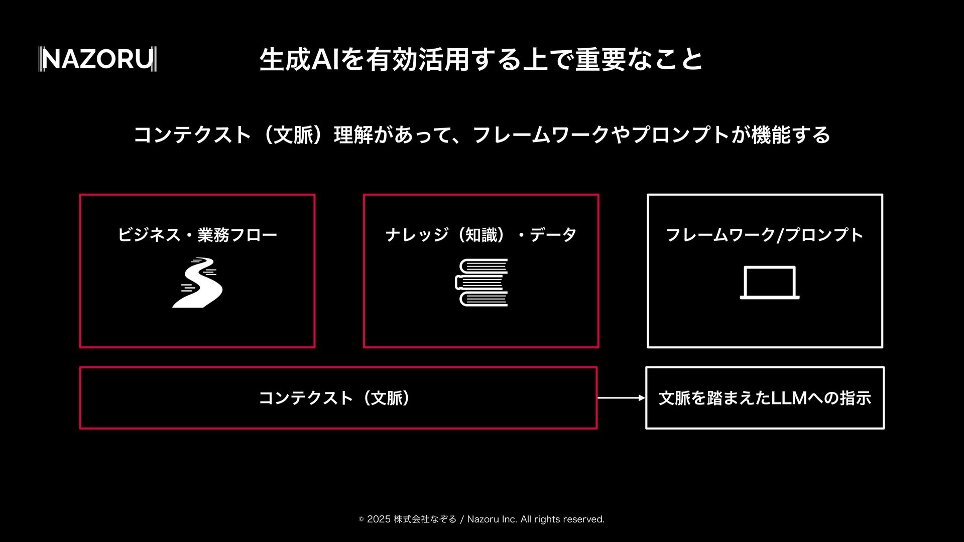 生成AI時代のマーケターには、フレームワークやプロンプトといった表層的なスキルだけでなく、ナレッジ・データ・業務フローという土台の上にコンテクスト理解を構築し、人文知を活用して人間の本質的な欲求や価値観を読み解く力が求められます。