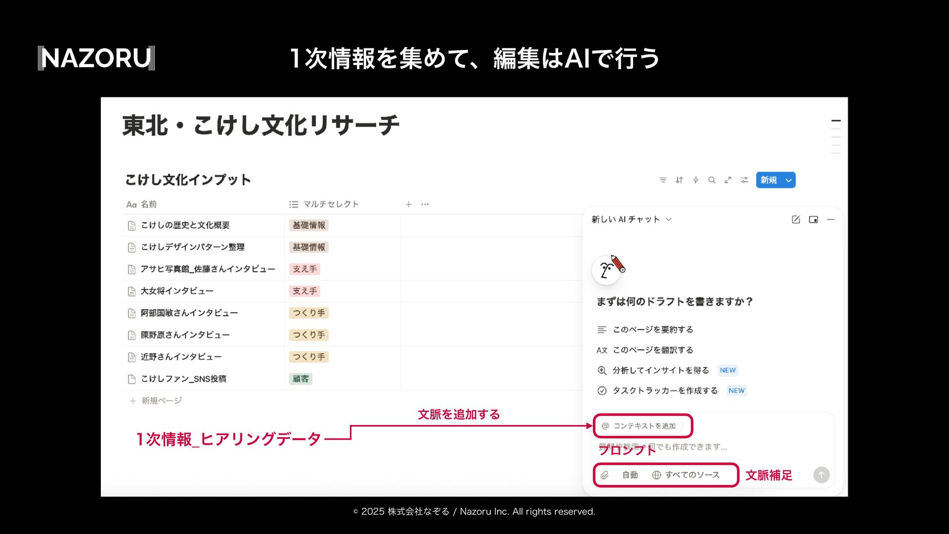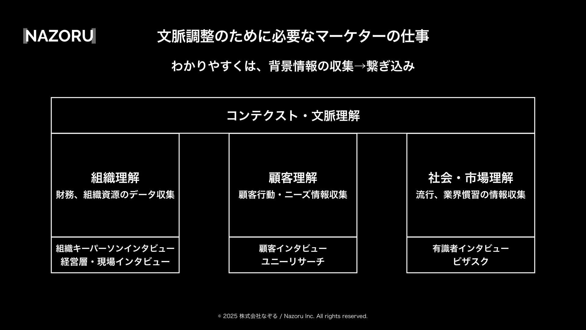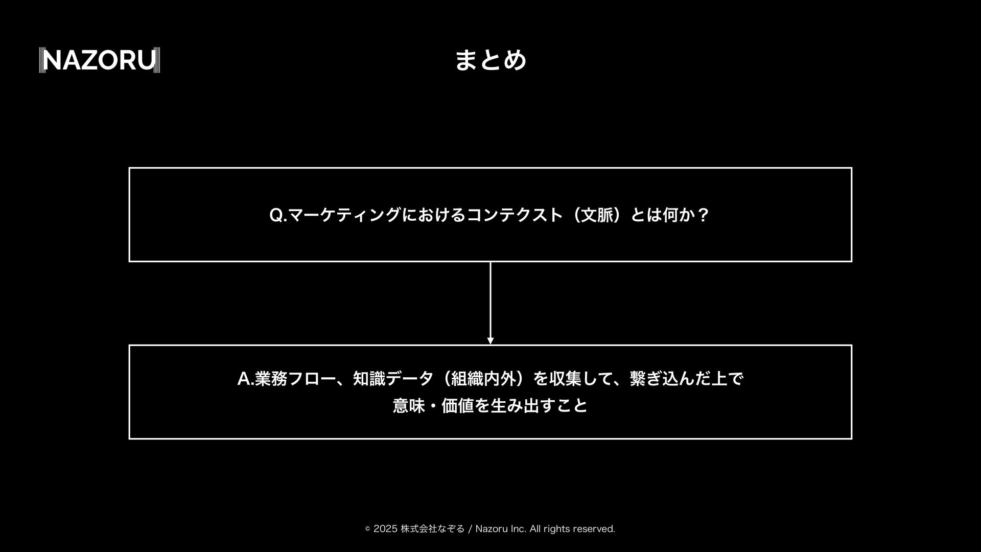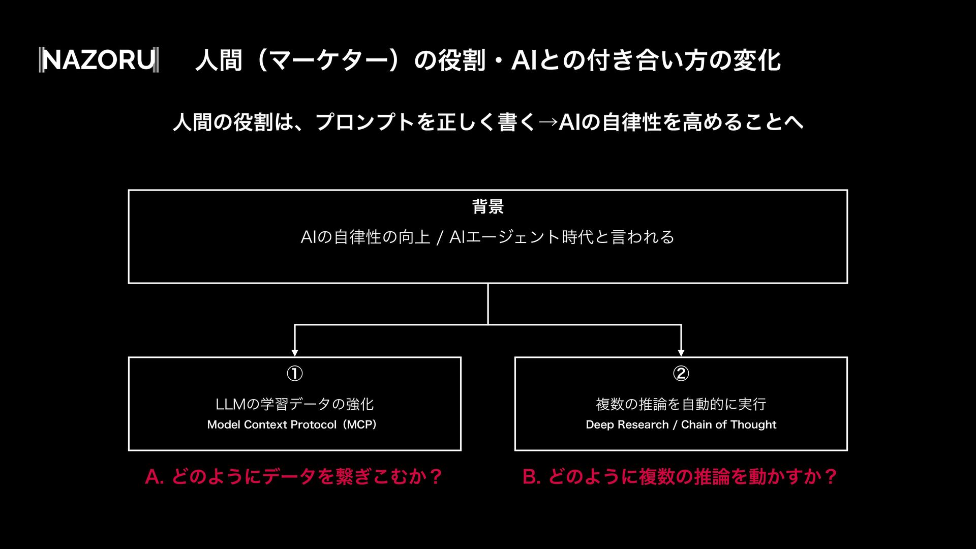 マーケティングにおける「コンテクスト(文脈)」とは、組織理解・顧客理解・市場理解という3つの情報領域を収集し、それらを戦略的に繋ぎ込んで意味・価値を生み出すプロセスです。AIエージェント時代において重要なのは、Model Context Protocol(MCP)やDeep Researchといった技術を活用し、いかにデータを接続し、複数の推論を自律的に動かすかという設計力です。