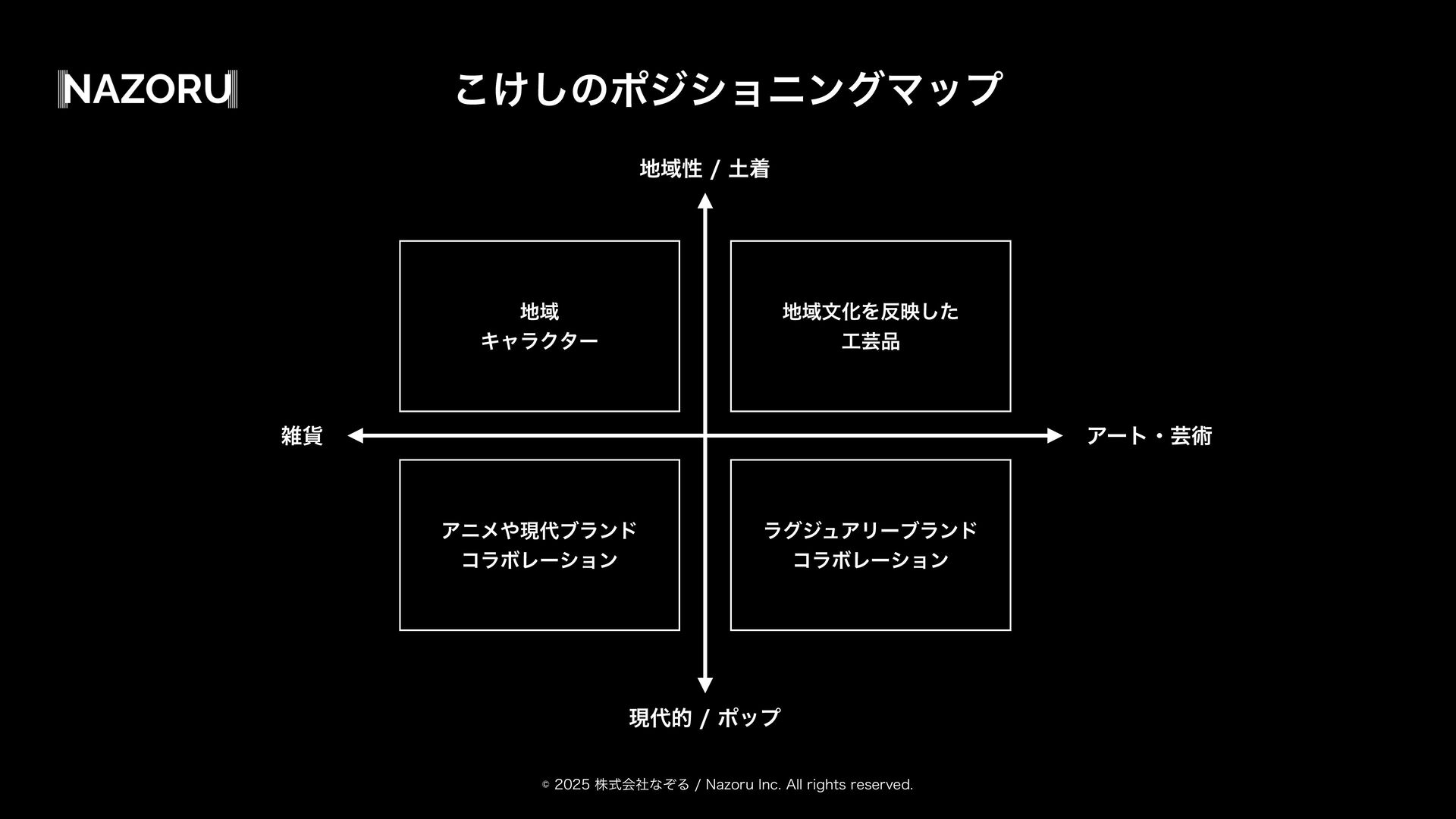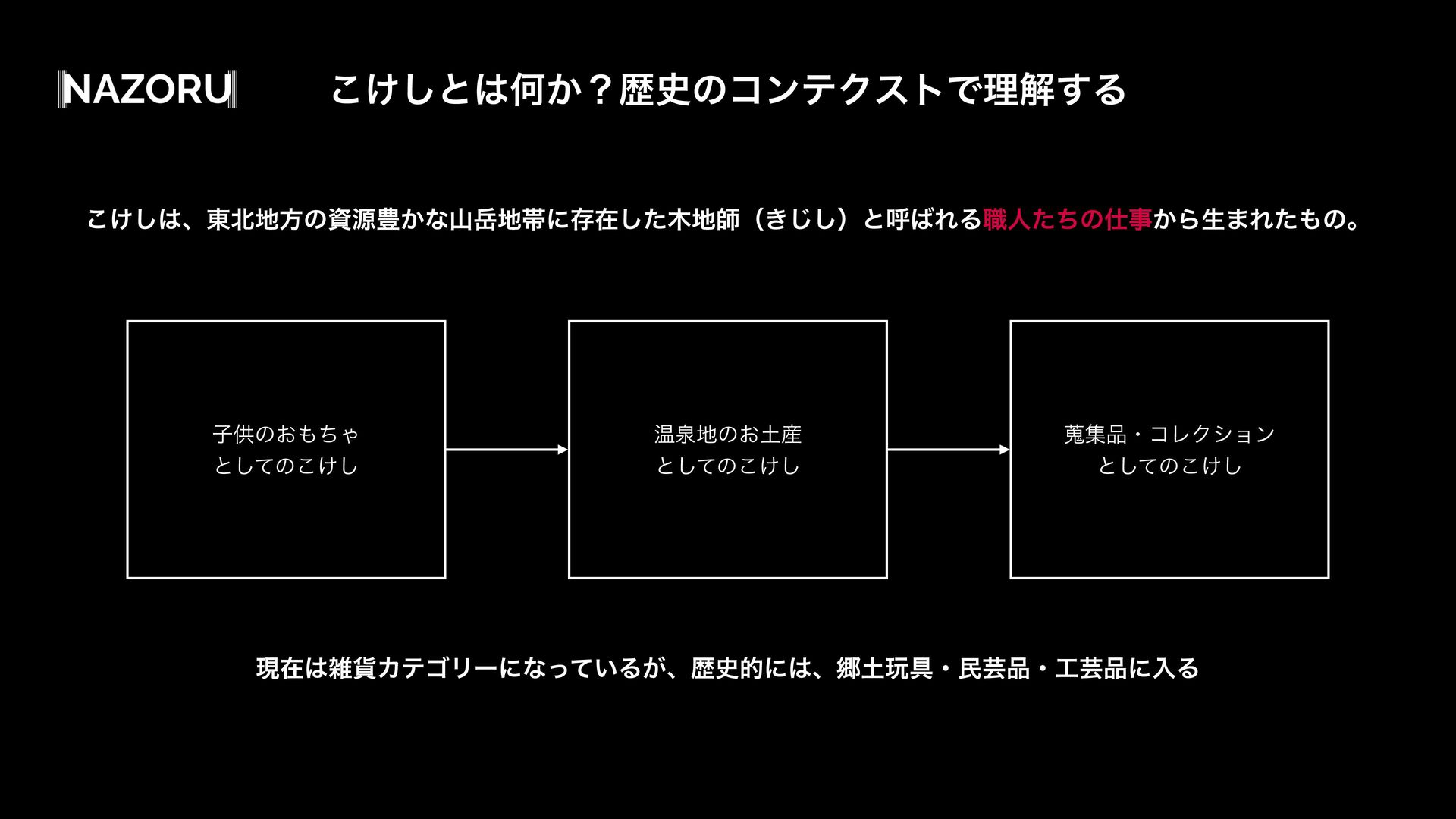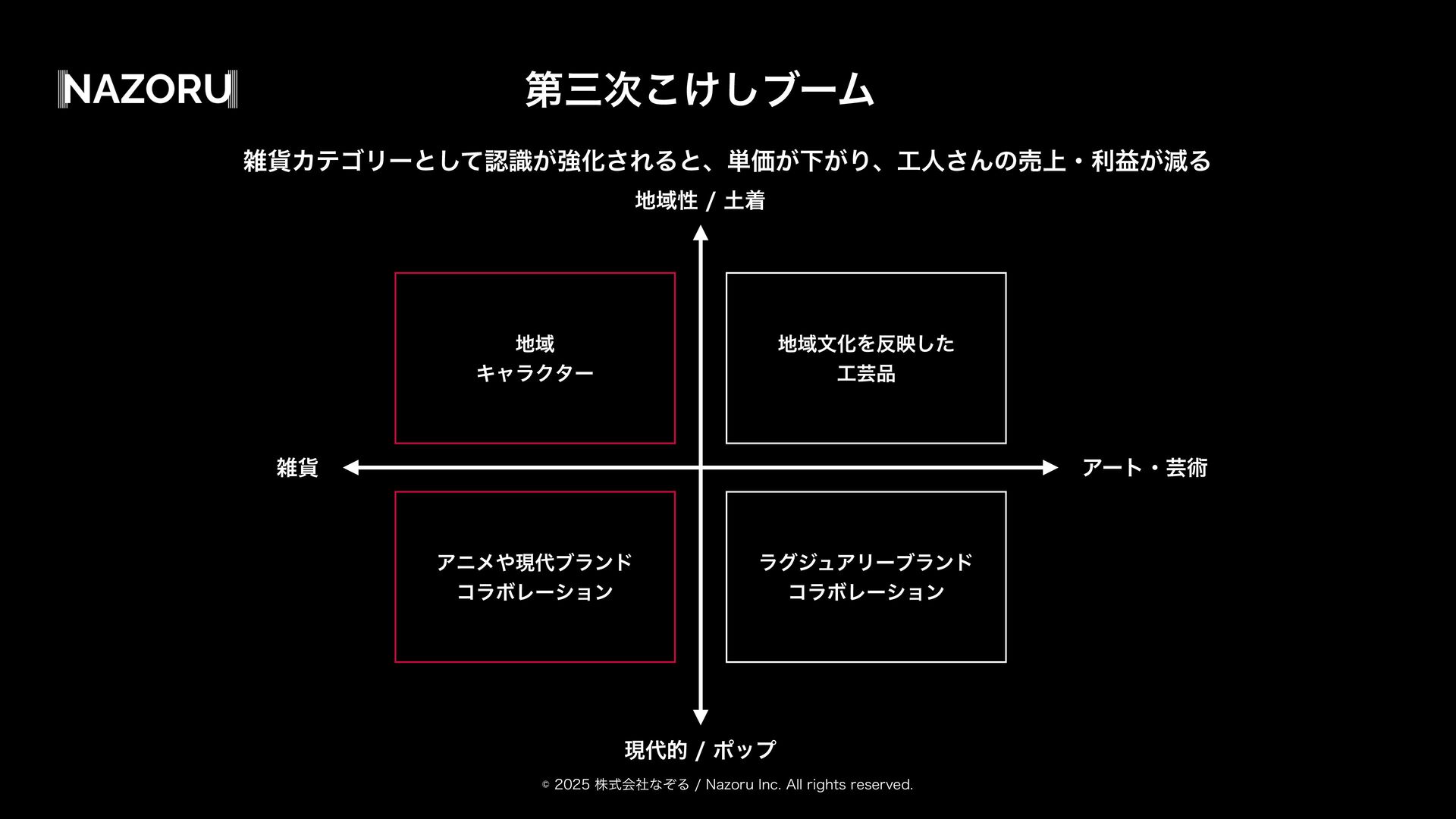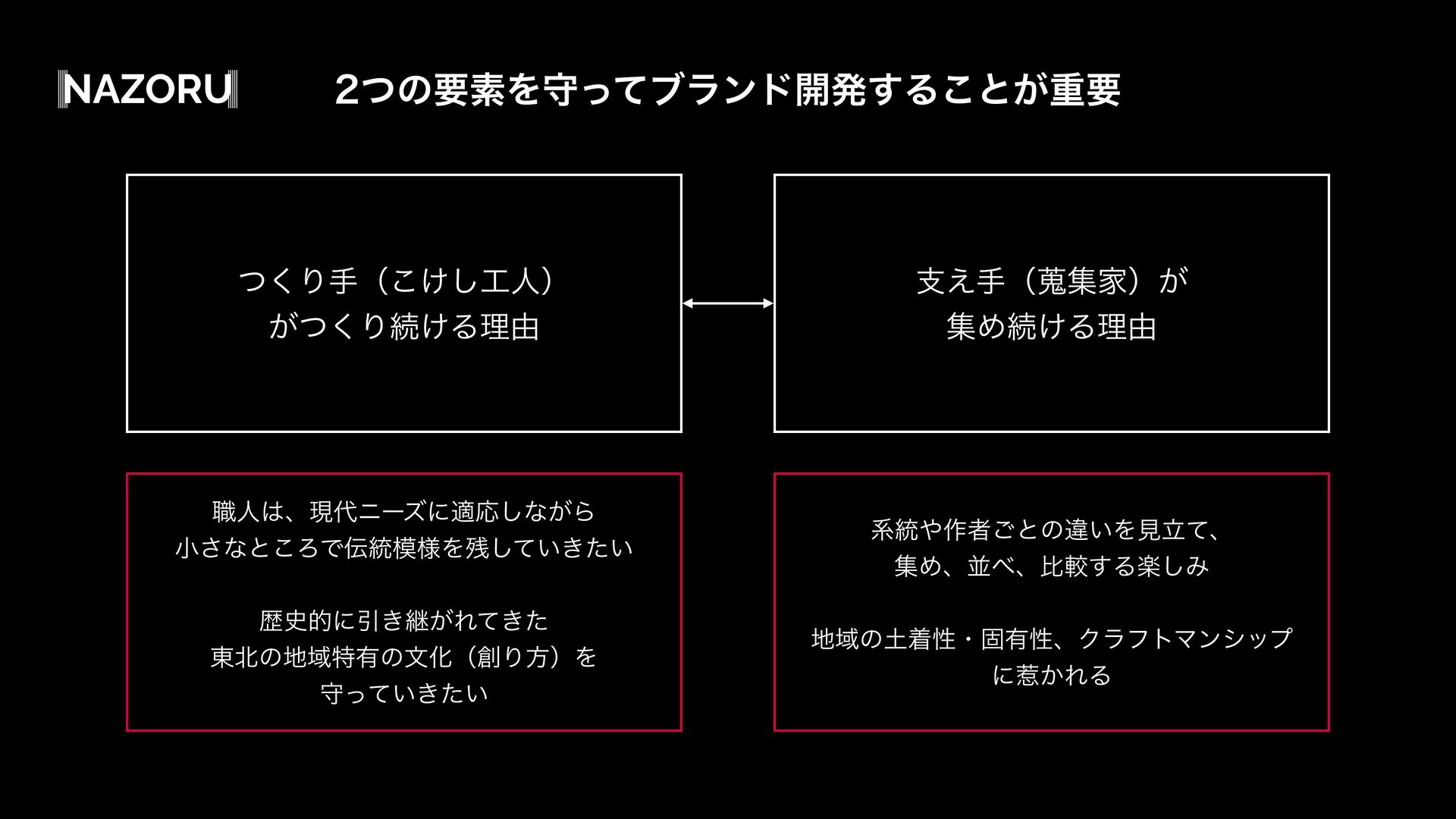 実践事例として、東北の伝統工芸「こけし」のブランド開発プロジェクトを紹介し、地域の歴史・文化的コンテクストを理解した上で、工人(つくり手)と蒐集家(支え手)双方の論理を統合し、持続可能な価値創造を実現する戦略設計プロセスを解説しています。こけしの11系統の地域特性、歴史的変遷、ステークホルダー構造を丁寧に読み解き、雑貨カテゴリーではなく工芸品としての適正なポジショニングを導き出した過程は、文化人類学的アプローチの実践例です。