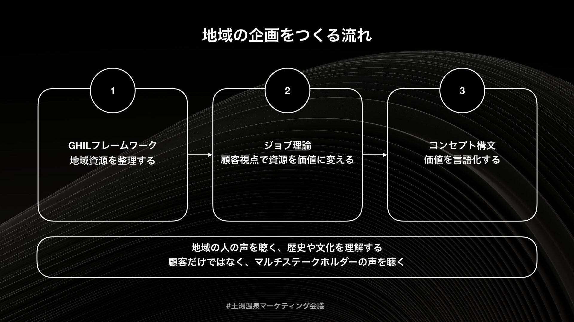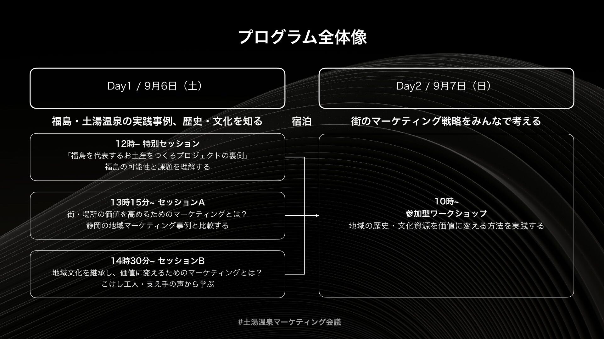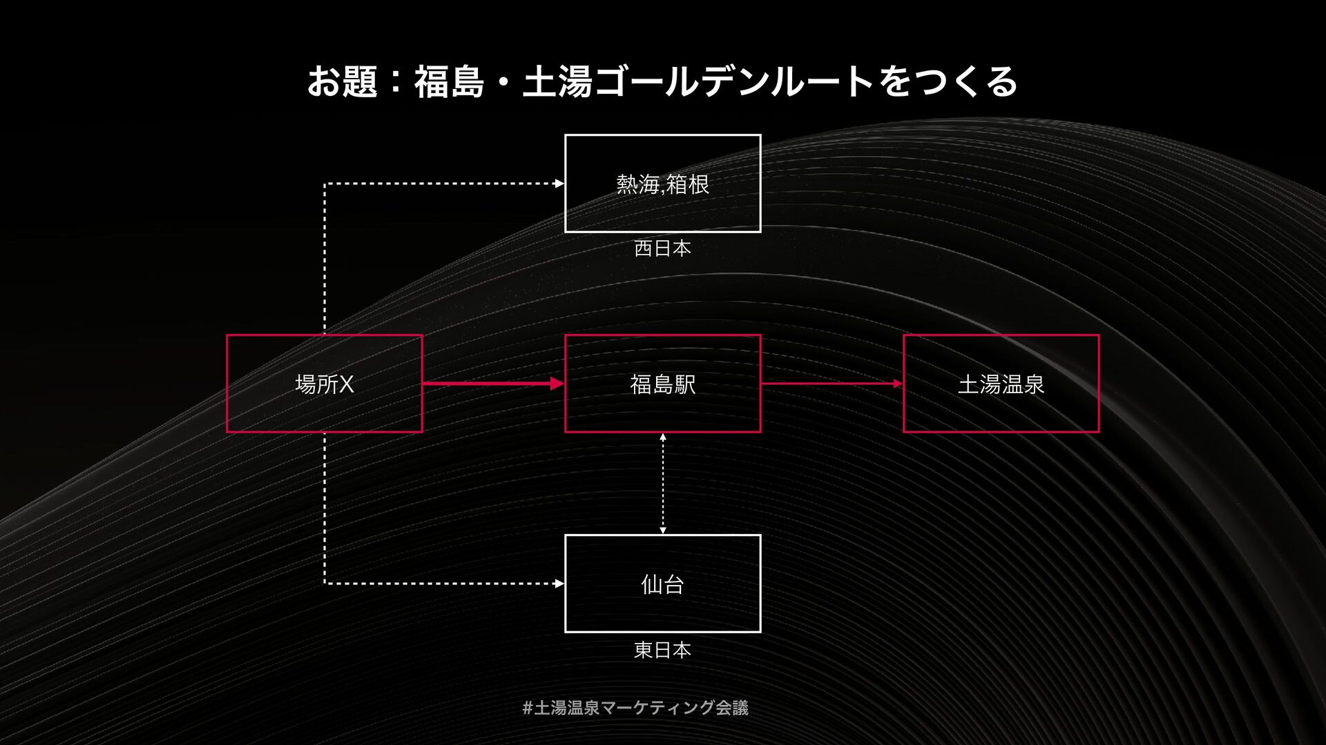 土湯温泉マーケティング会議は、「福島を“通過点”ではなく“目的地”にする」というテーマをもとに、地域の歴史・文化を資源として再編集し、マーケティング企画までつなげるための実践知を共有する場として開催されました。