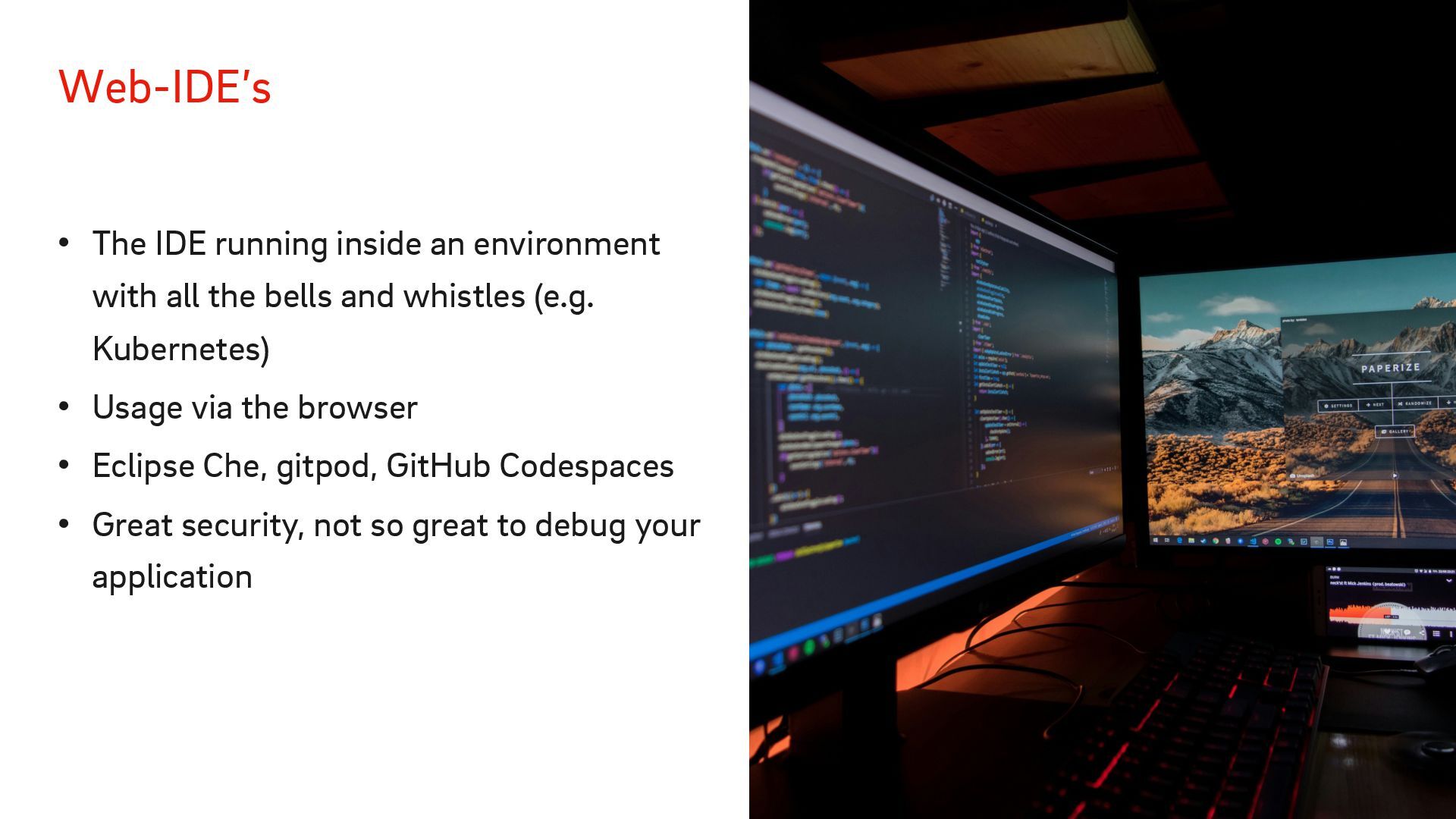 bells and whistles (e.g. Kubernetes) • Usage via the browser • Eclipse Che, gitpod, GitHub Codespaces • Great security, not so great to debug your application Web-IDE’s