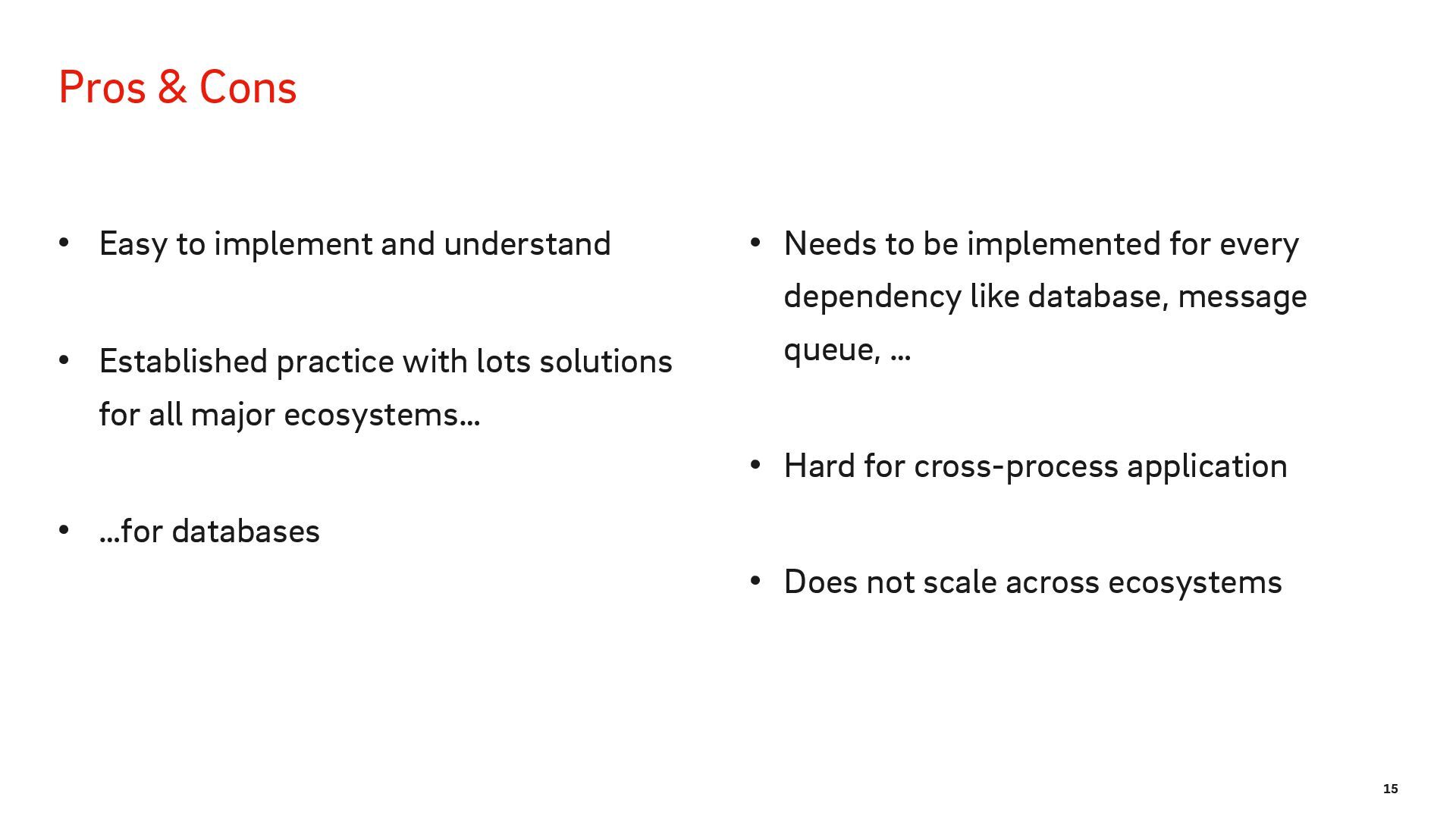 database, message queue, … • Hard for cross-process application • Does not scale across ecosystems • Easy to implement and understand • Established practice with lots solutions for all major ecosystems… • …for databases Pros & Cons