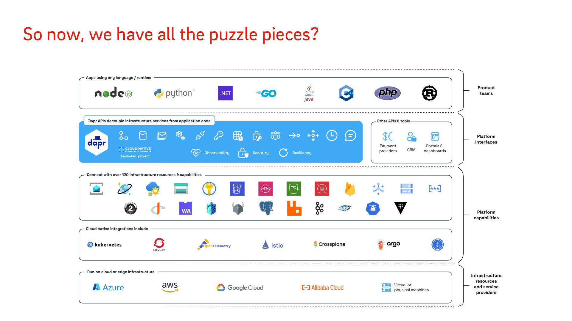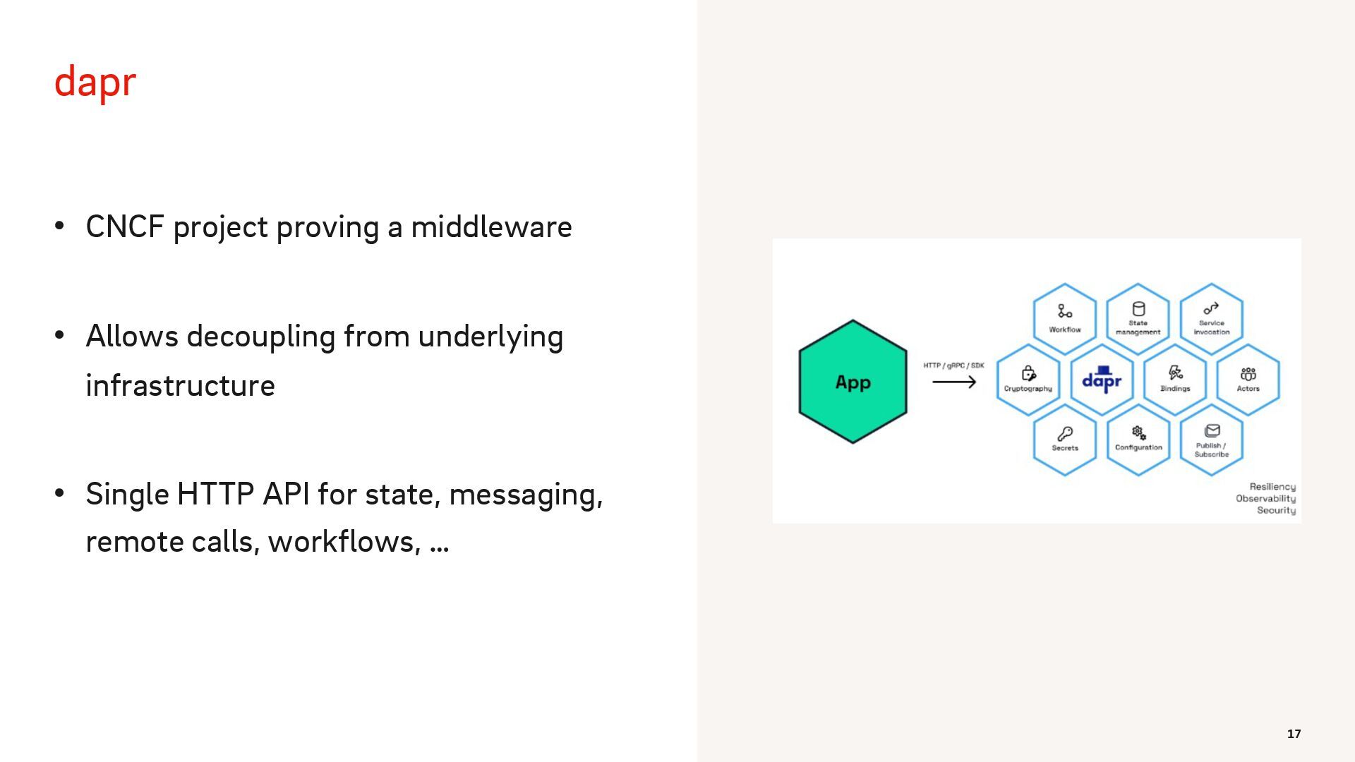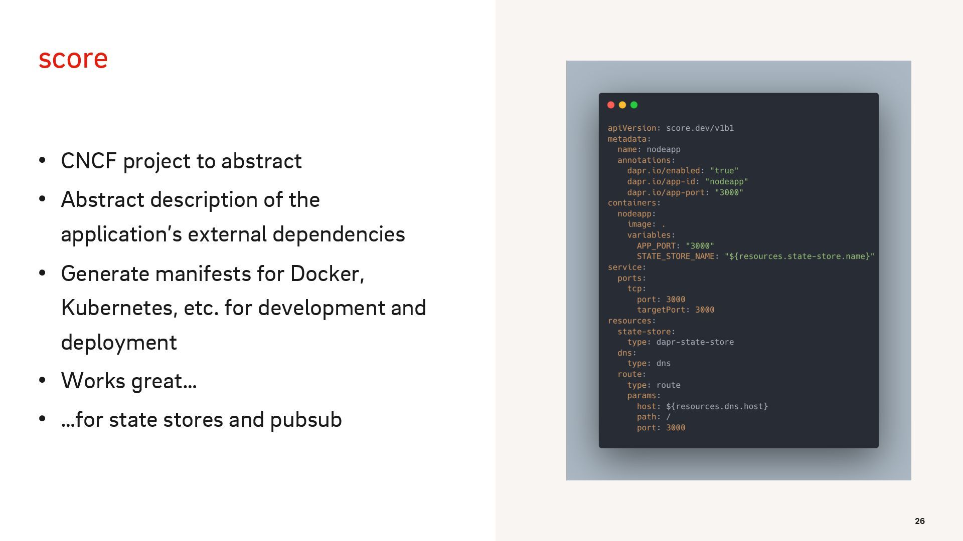 the application’s external dependencies • Generate manifests for Docker, Kubernetes, etc. for development and deployment • Works great… • …for state stores and pubsub score