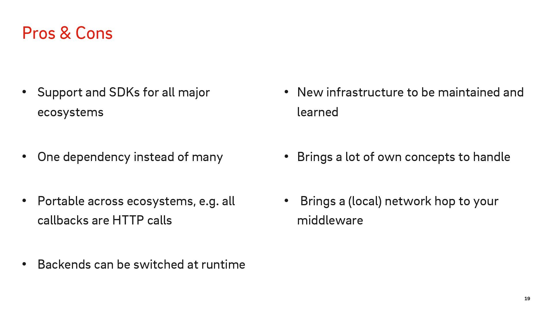 Brings a lot of own concepts to handle • Brings a (local) network hop to your middleware • Support and SDKs for all major ecosystems • One dependency instead of many • Portable across ecosystems, e.g. all callbacks are HTTP calls • Backends can be switched at runtime Pros & Cons
